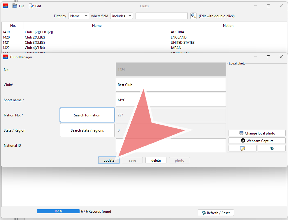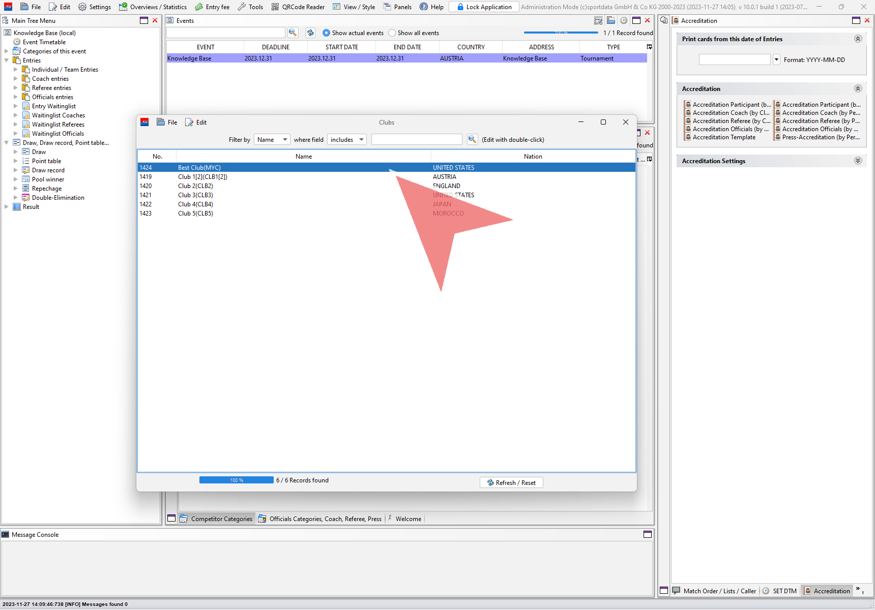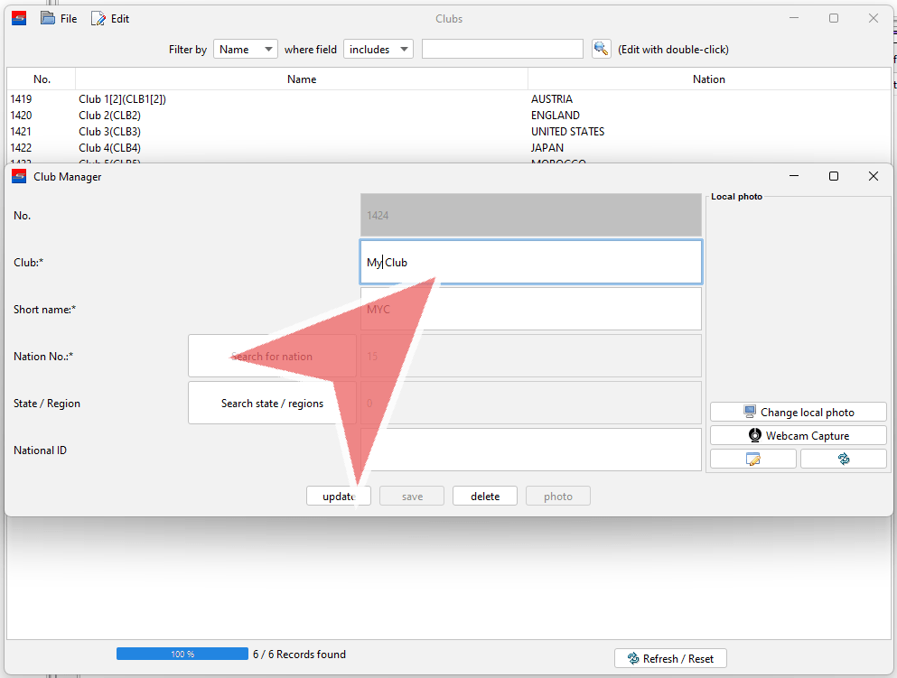 Click on “refresh” to display the changes in the club window. Any change of club data also infects already registered entries with a club.