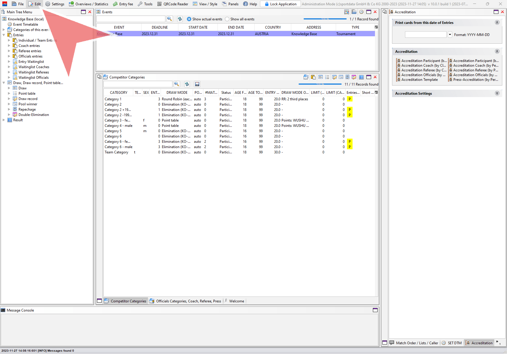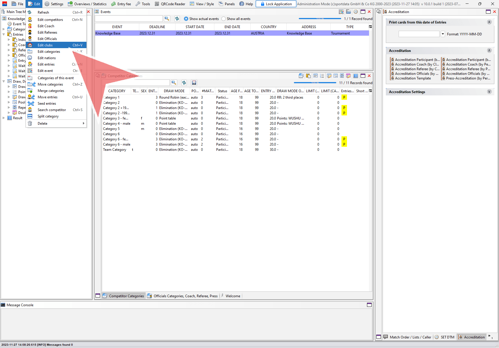 Login to your event in SET with the administration mode. To access and change the data of a registered club, go to “Edit”.
