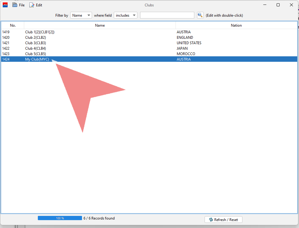 A window with all registered clubs shows up. Doubleclick on the club that you would like to edit.