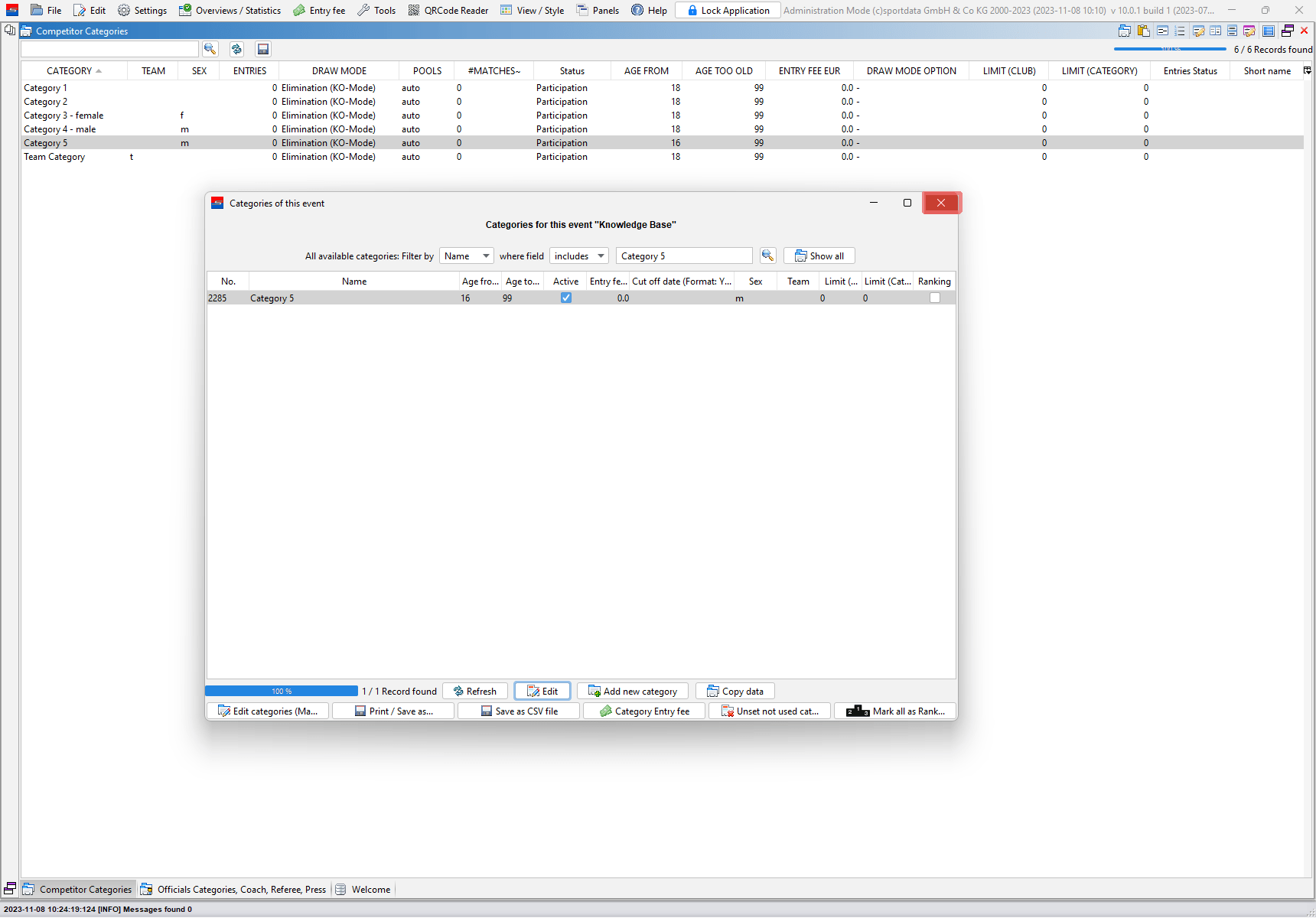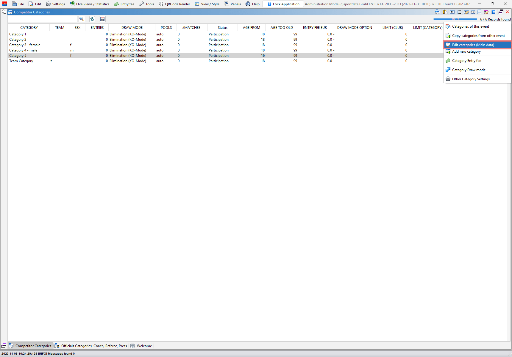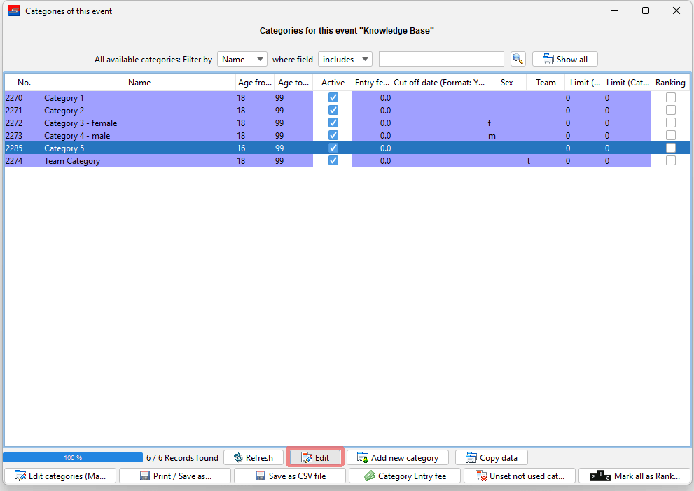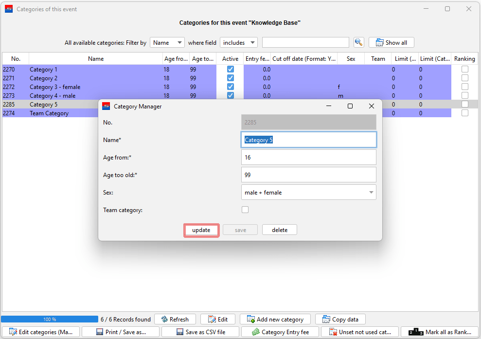 The main data of a event category like the name, age range and gender can be easily changed. This article shows you 3 different ways of how to edit the main data of a category.