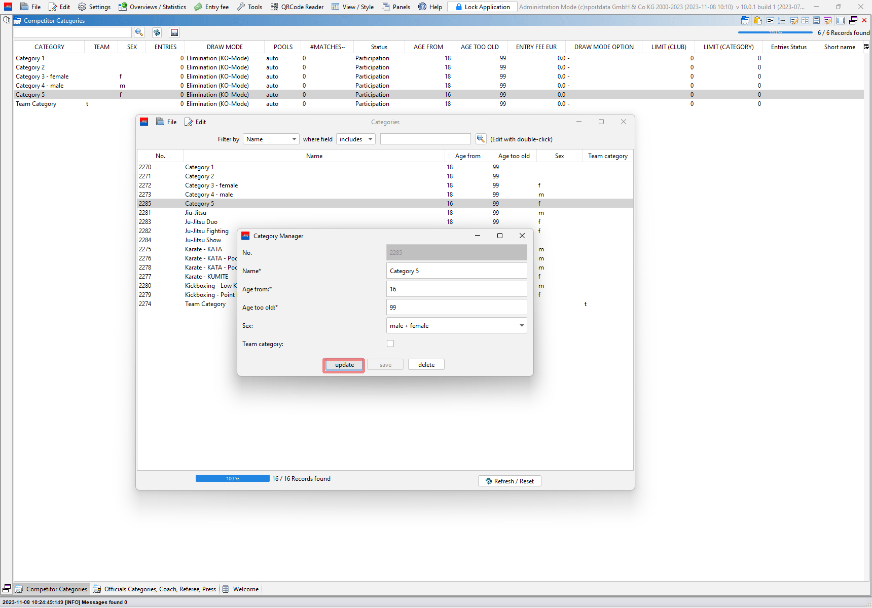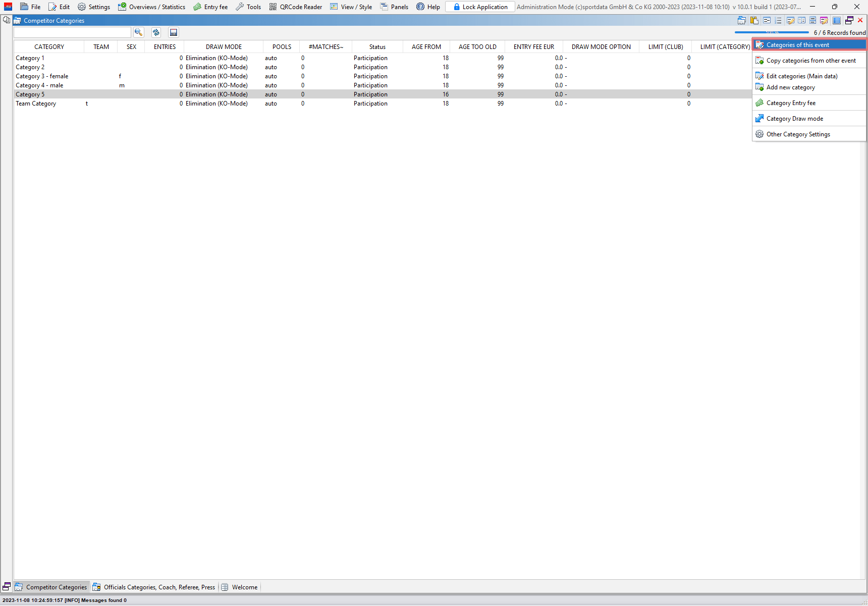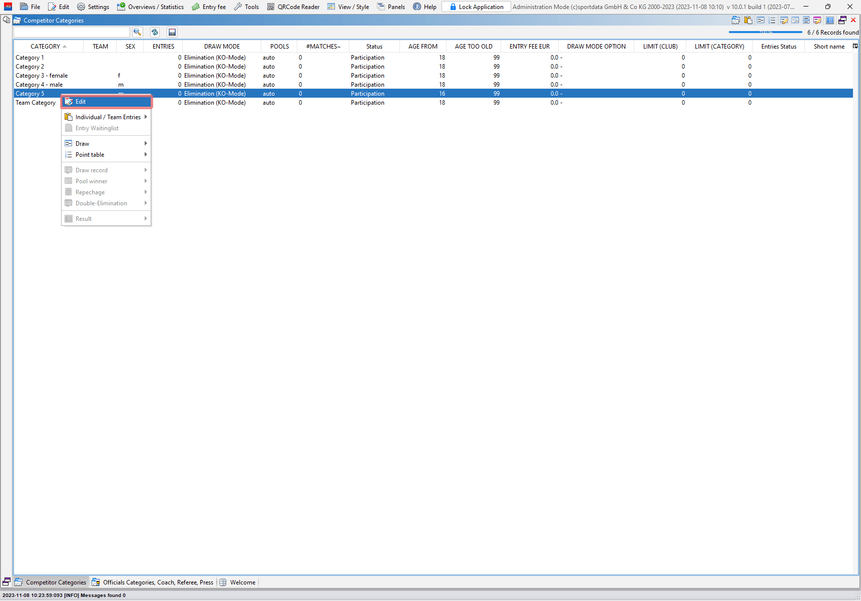 The main data of a event category like the name, age range and gender can be easily changed. This article shows you 3 different ways of how to edit the main data of a category.