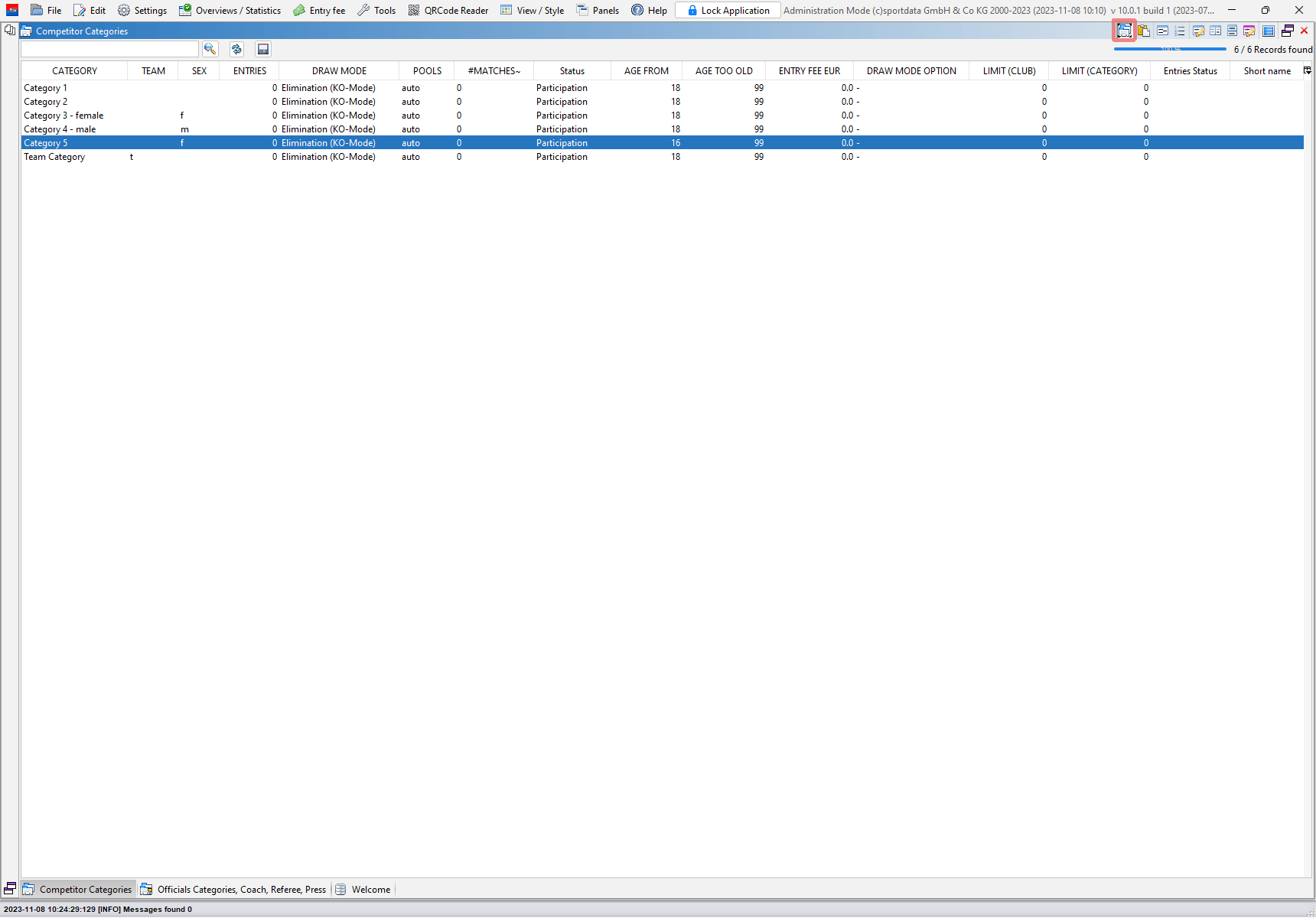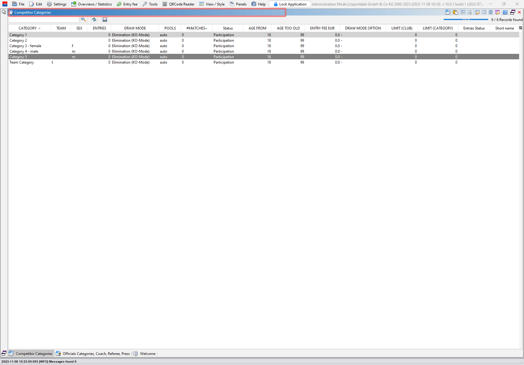 To edit the main data of categories, go to the panel “Competitor Categories”. Double click on its title bar to expand it to full screen size.