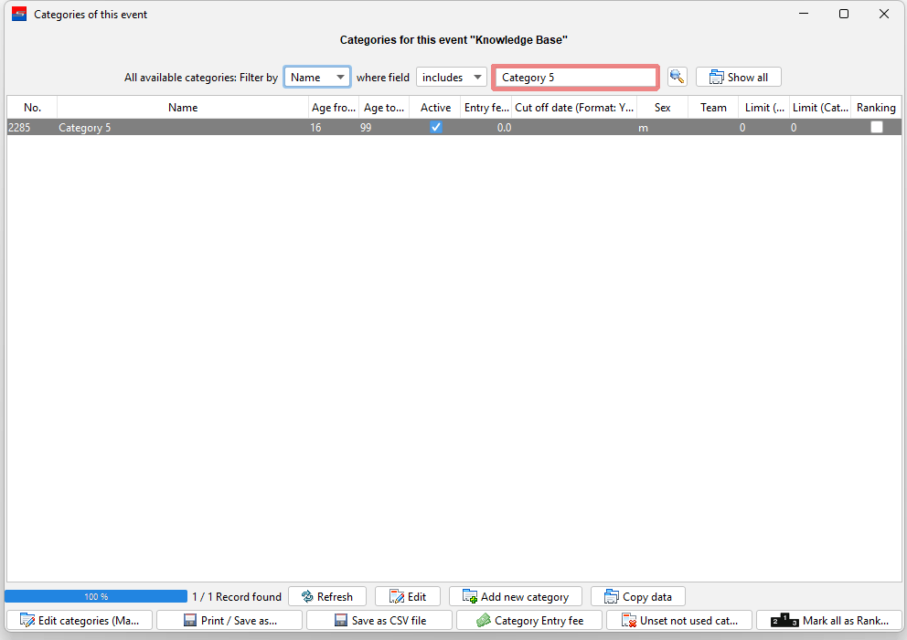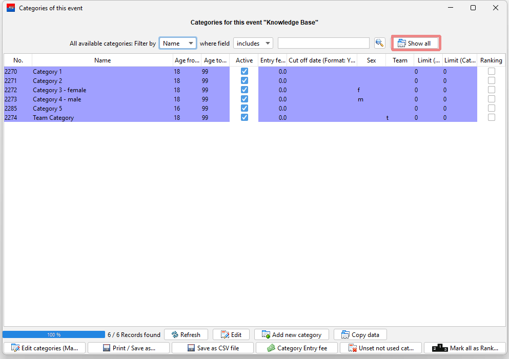 All used categories of this event are shown in the list. You can use the filter to search for category names and the “Show all” button to also show not used but configured categories of this event.