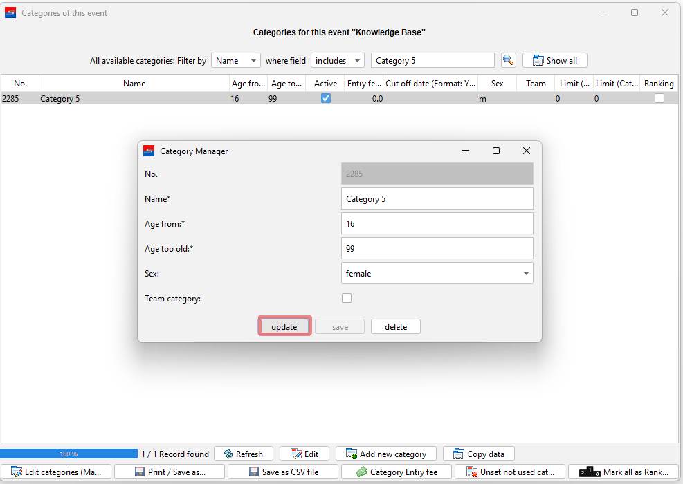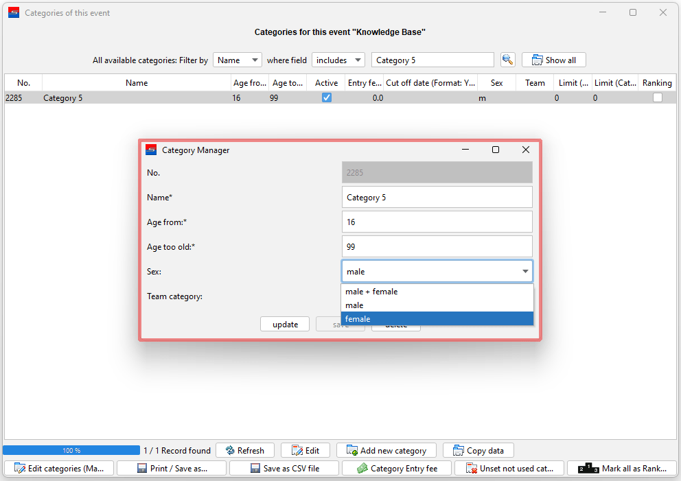 The Category Manager which contains the main data pops up and can be edited (e.g. change of gender).