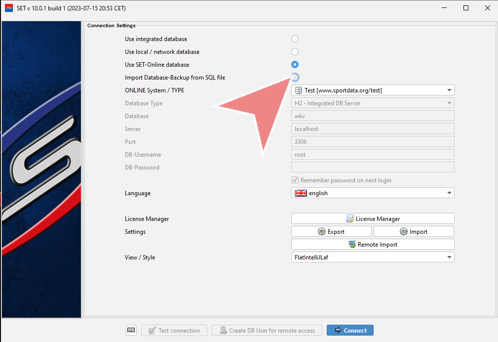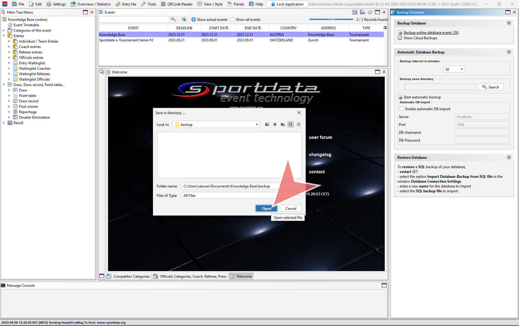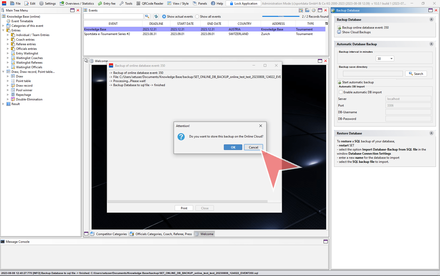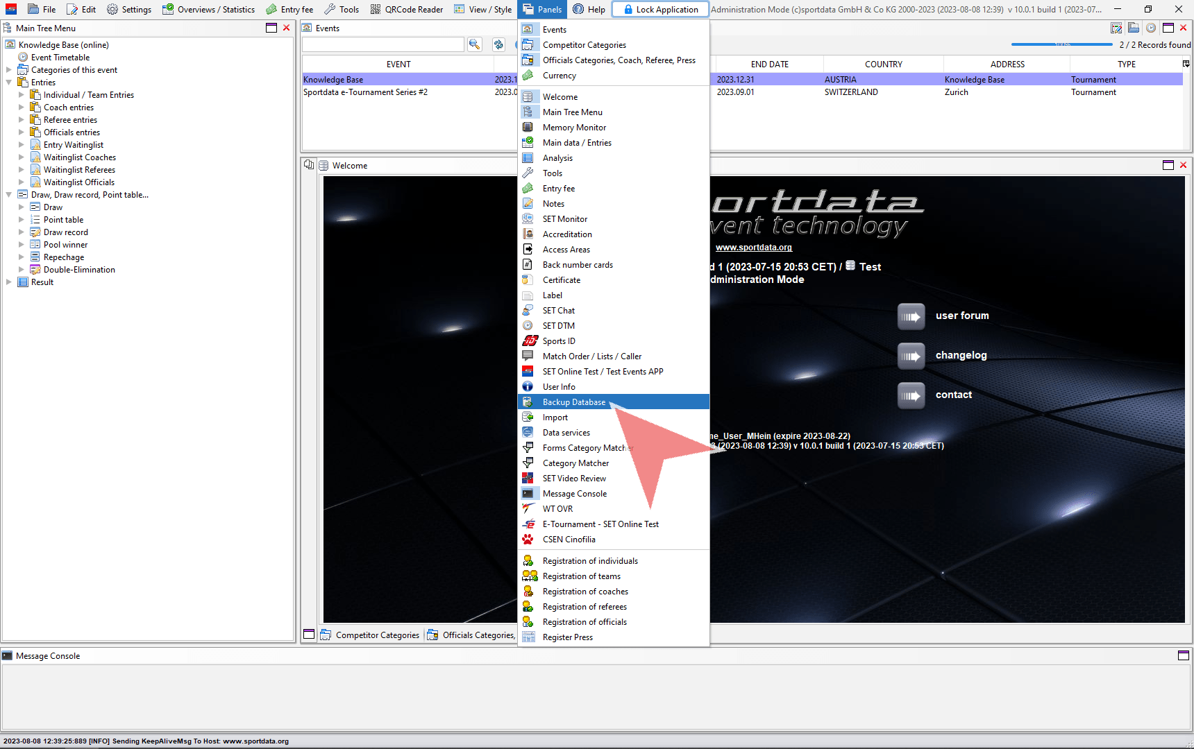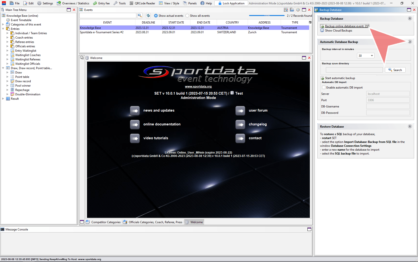 You can either be connected to an online or a local database in the “Administration Mode”. Go to “Panels” and open the panel “Backup Database”.