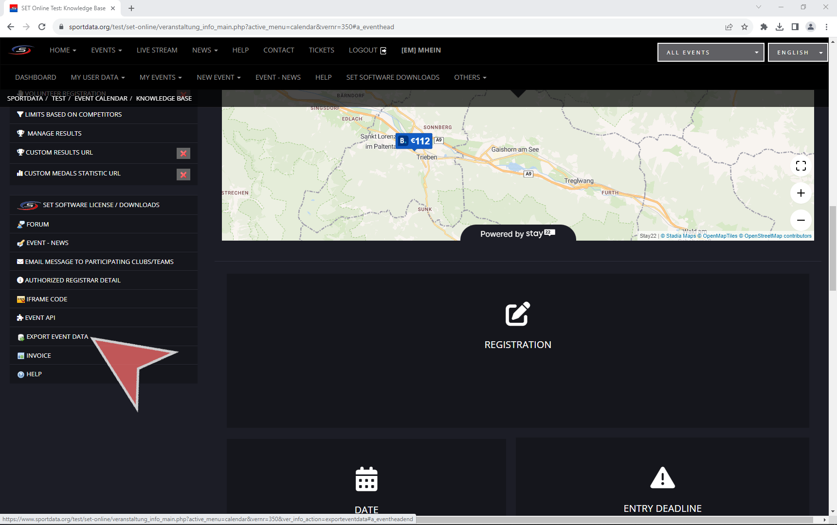 Login with your event manager account on sportdata.org and go to the event page of your event. Click in the main menu on “Export event data”.