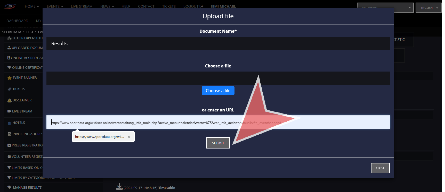 Give the file a name and either upload a file by clicking choose a file or enter a URL link. Afterwards, click submit to upload the file to the document page of the event page.