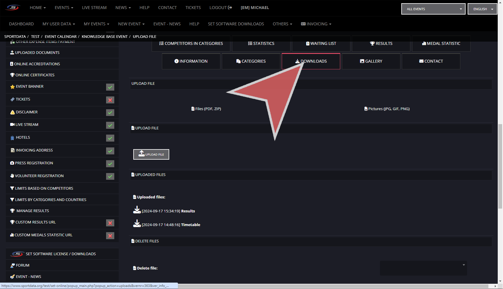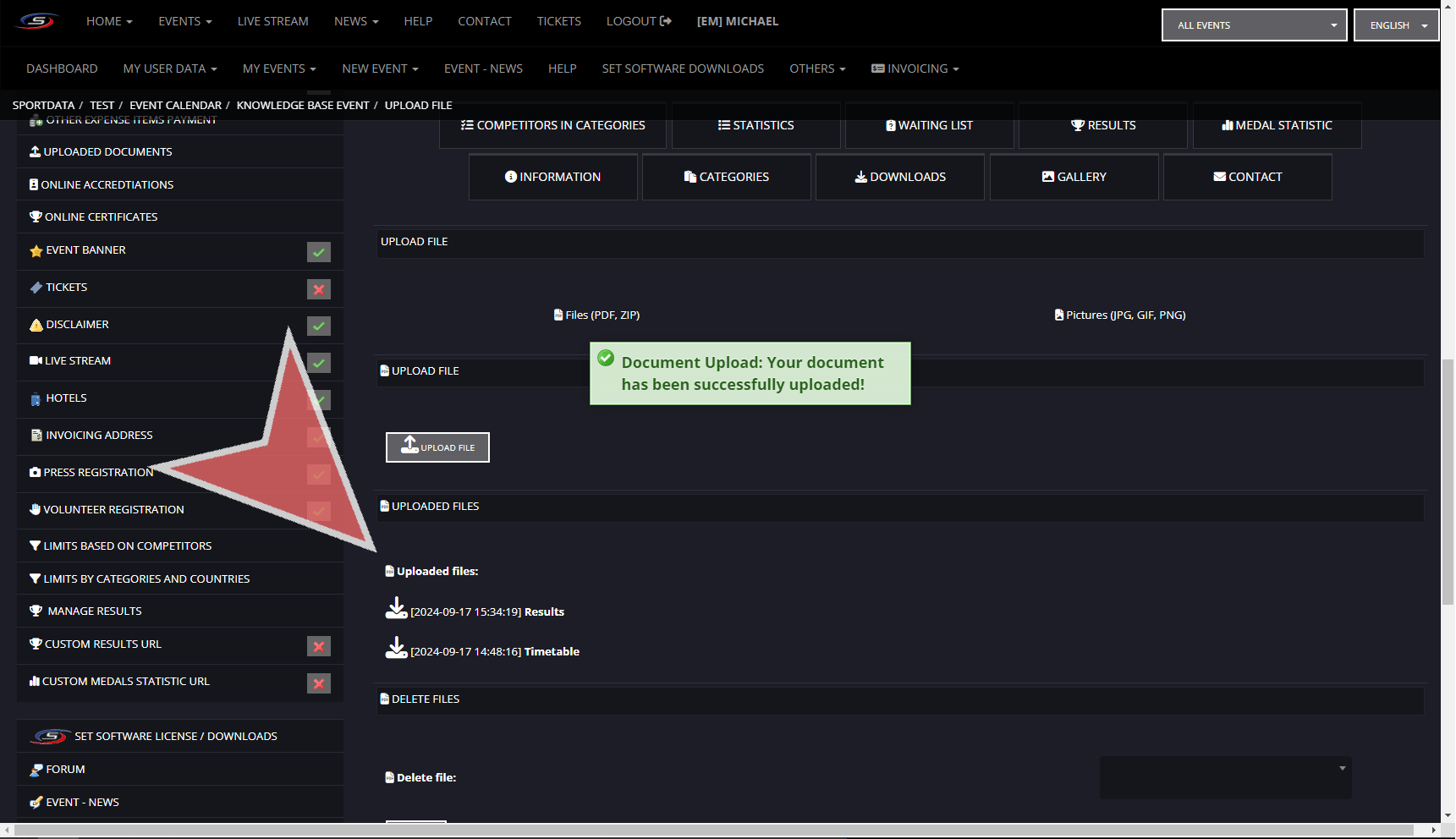 Make it easy for your participants to find all the relevant documention required for the event by uploading them to the event page. This may include documents like the event bulletin, shuttle pick-up times, competition timetable, waivers, and the result book. The format is either a PDF or a URL.
