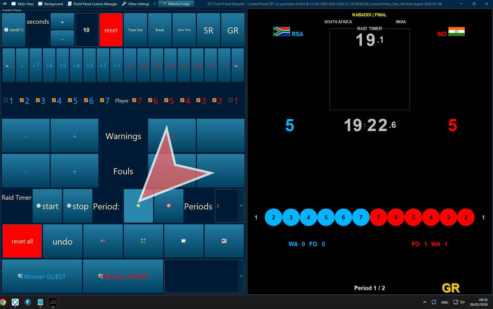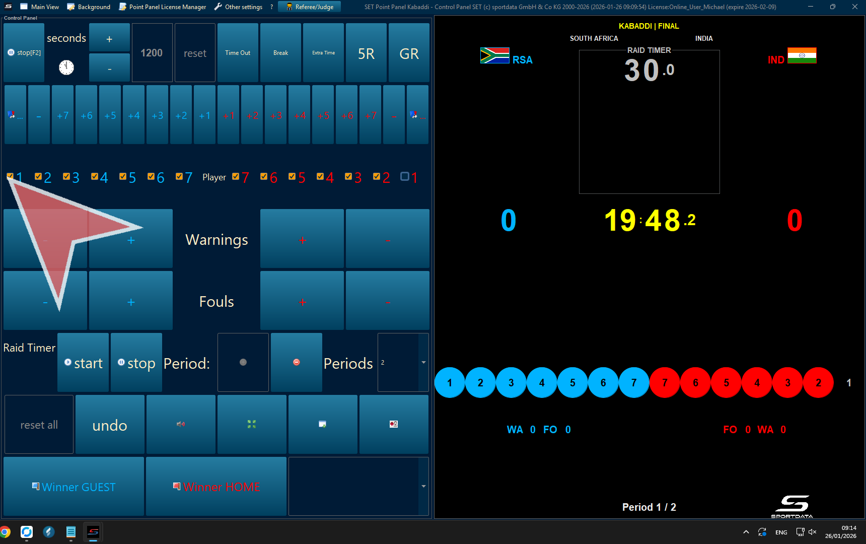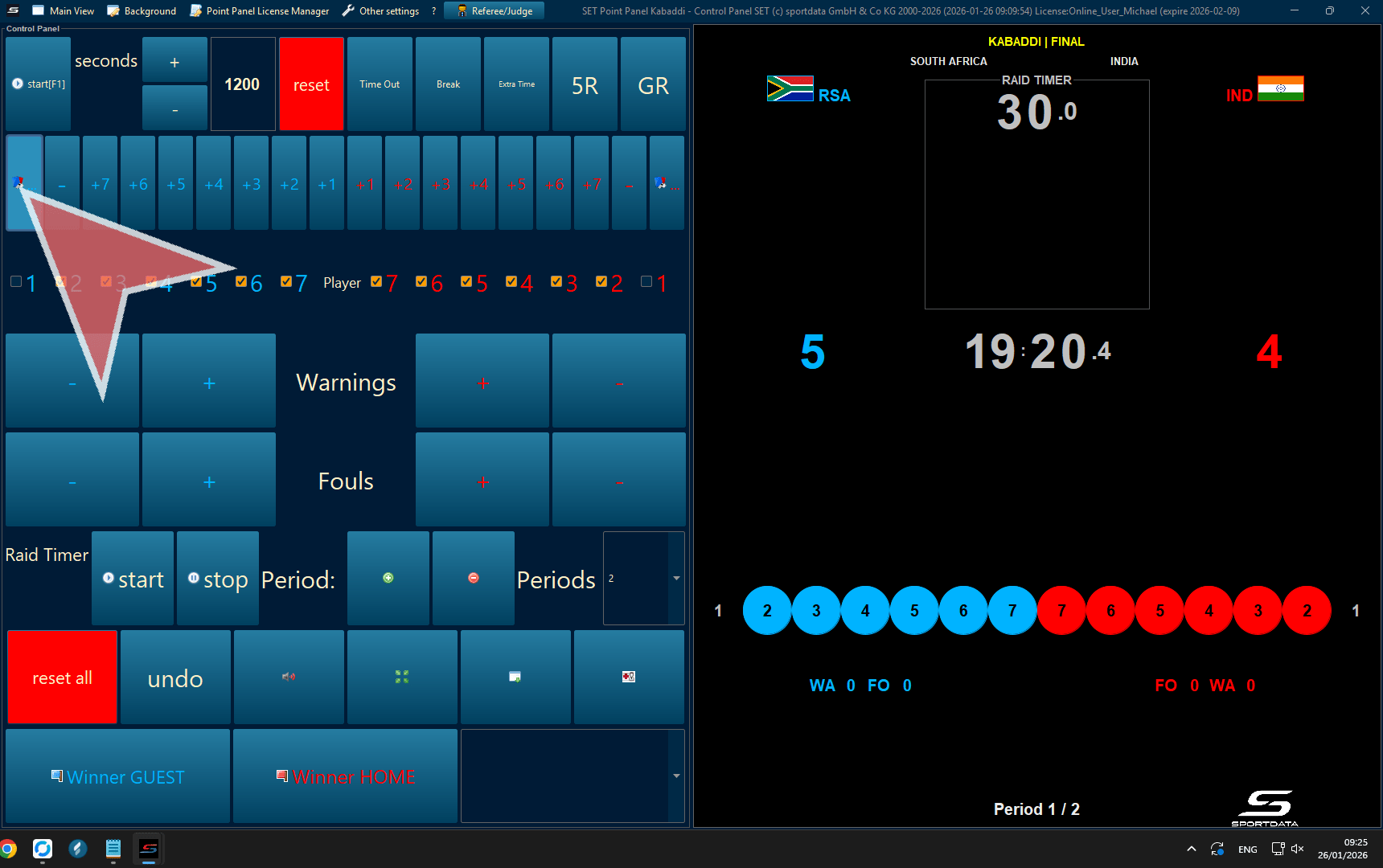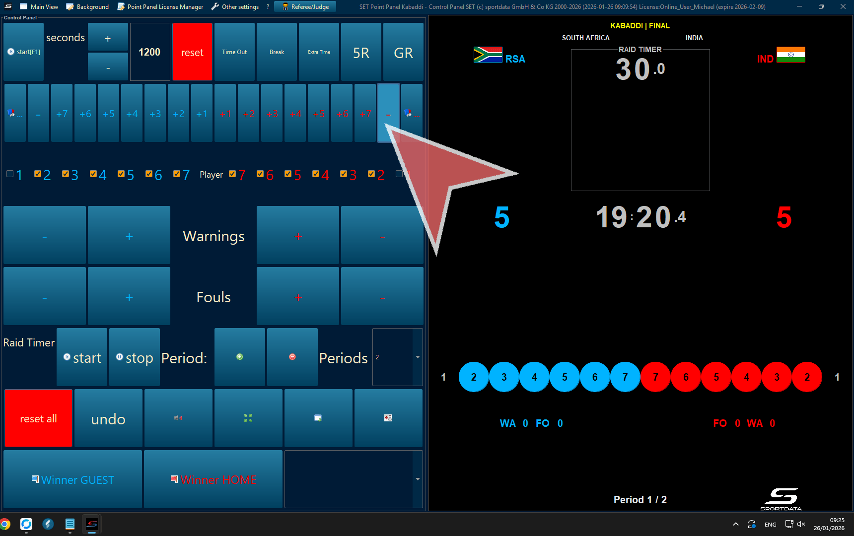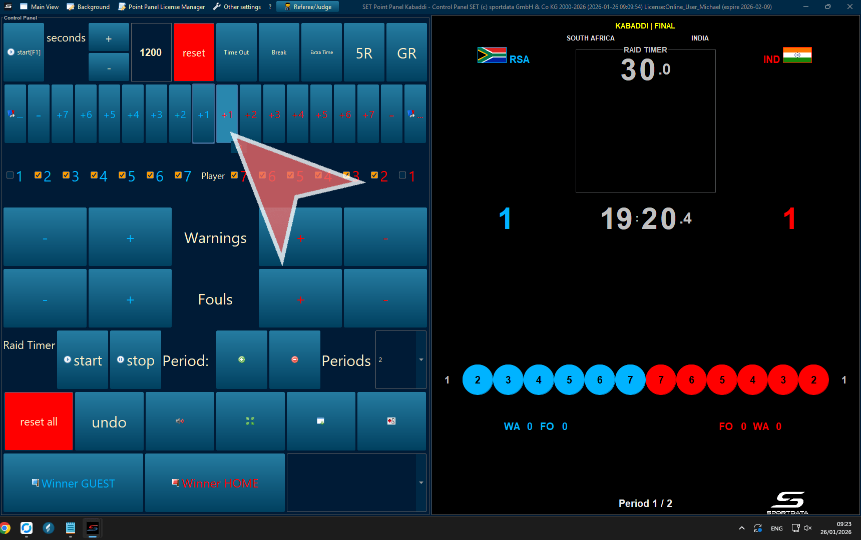 To change halfs, press the green plus sign to go into the second half. Make sure that the match is set to 2 periods. You can verify the period in which zou are bz looking at the bottom right hand side of the point panel display. To return back to the first period, simply press the red minus symbol.