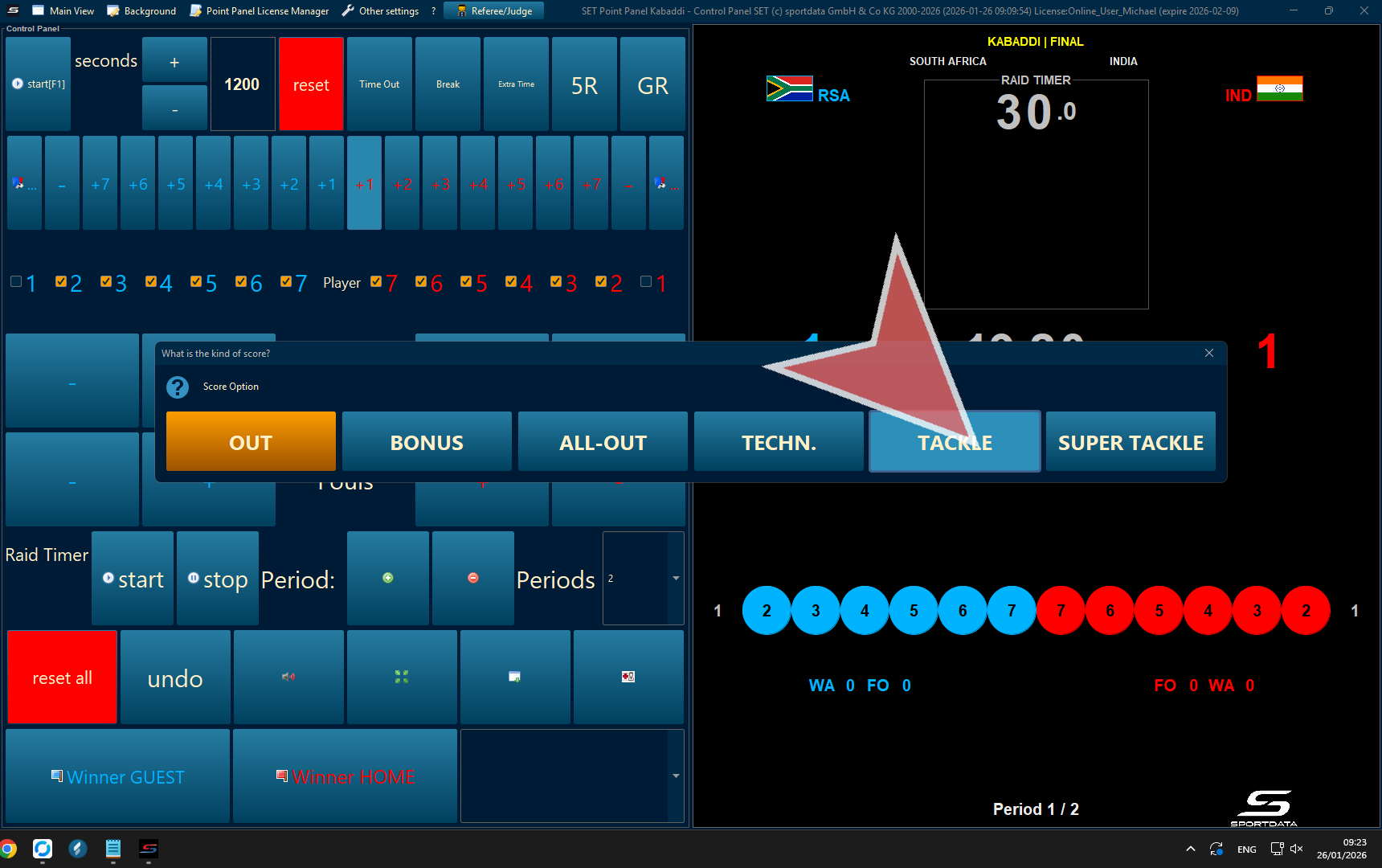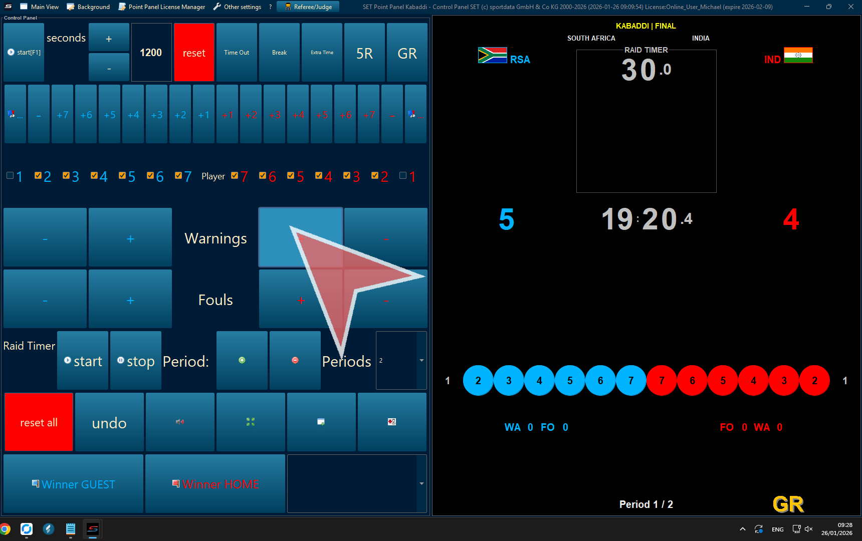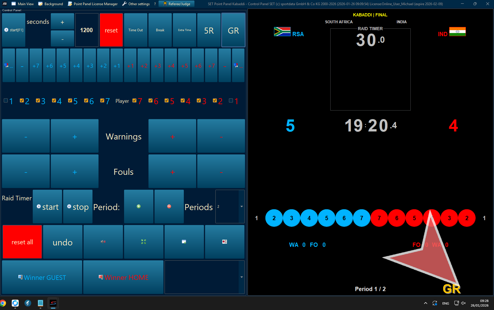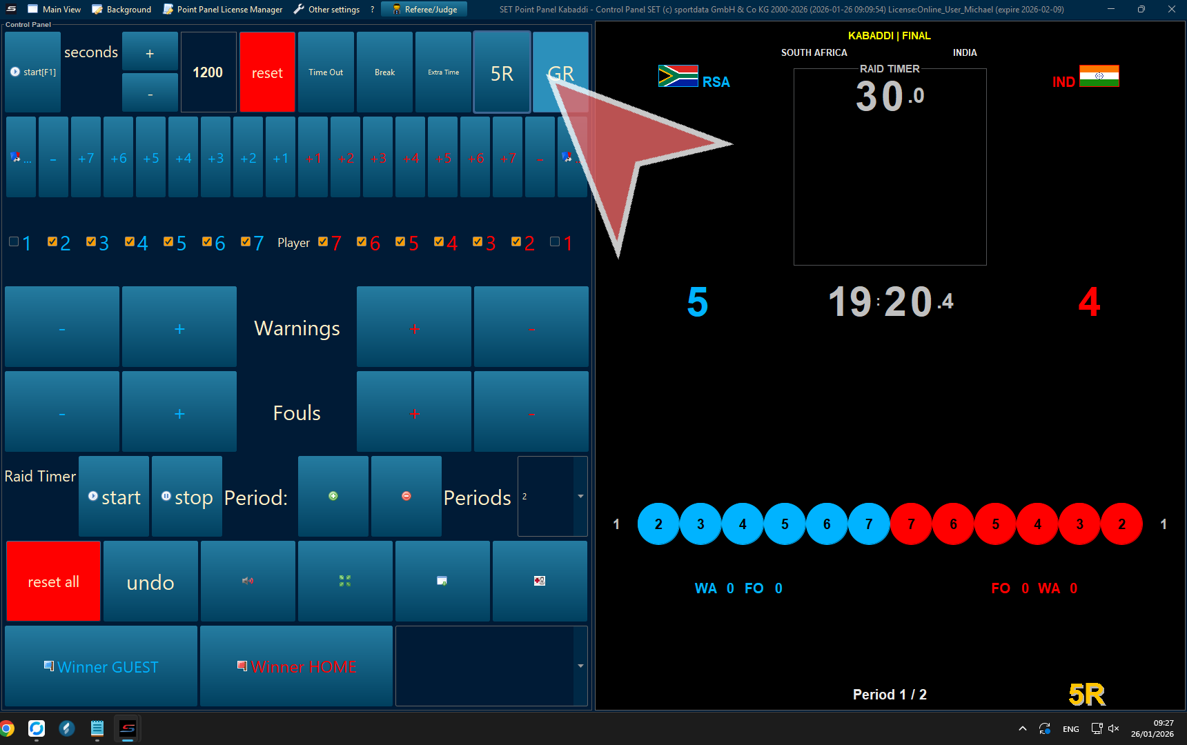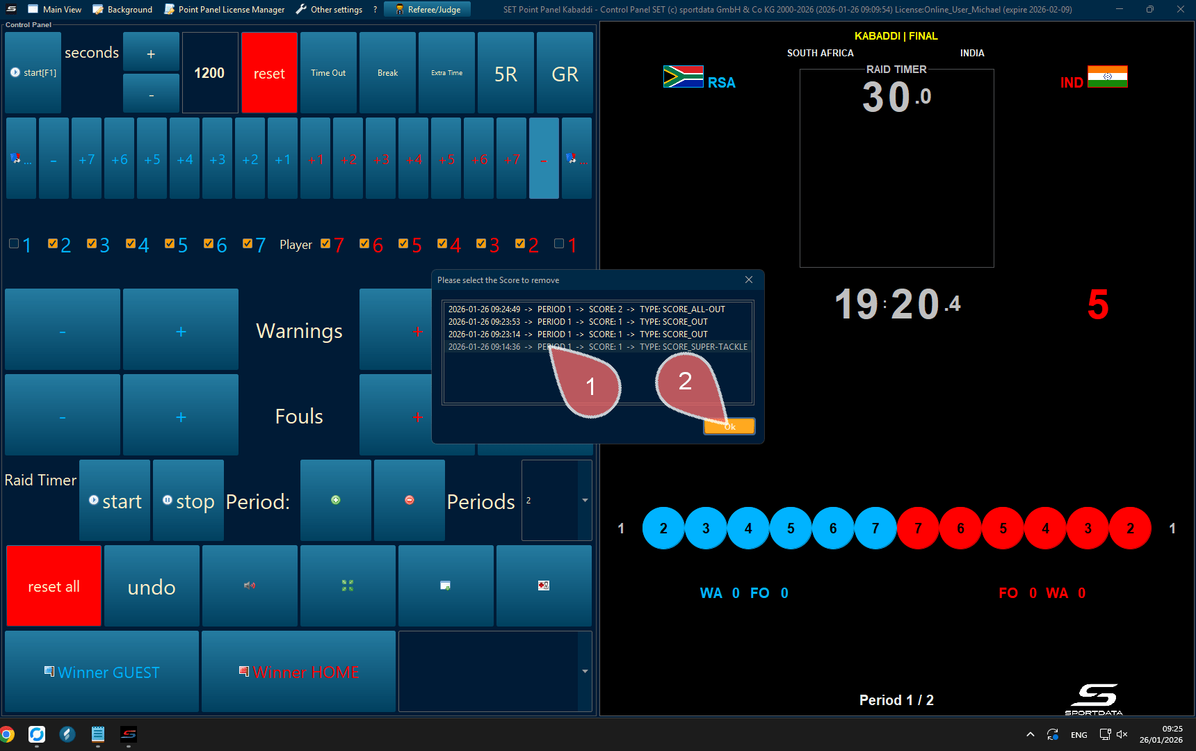 To change halfs, press the green plus sign to go into the second half. Make sure that the match is set to 2 periods. You can verify the period in which zou are bz looking at the bottom right hand side of the point panel display. To return back to the first period, simply press the red minus symbol.