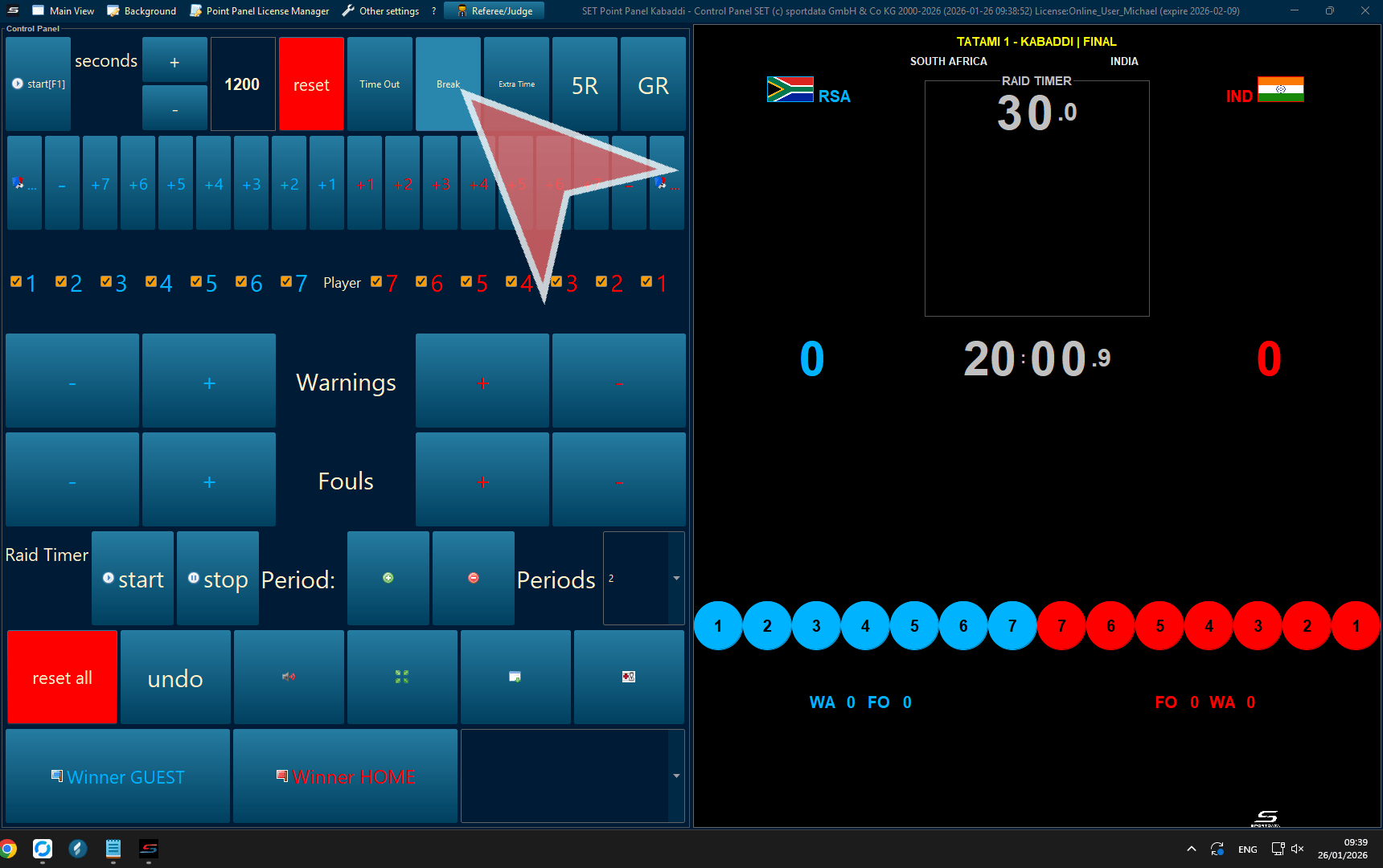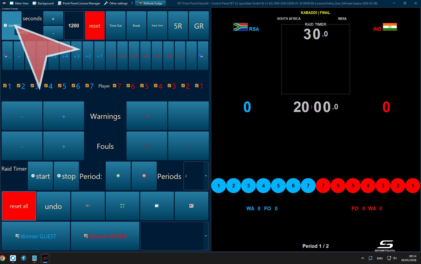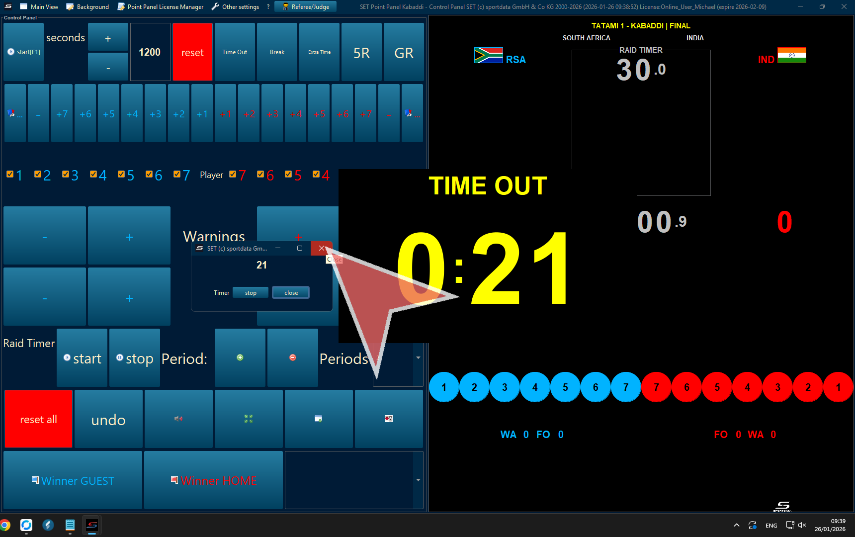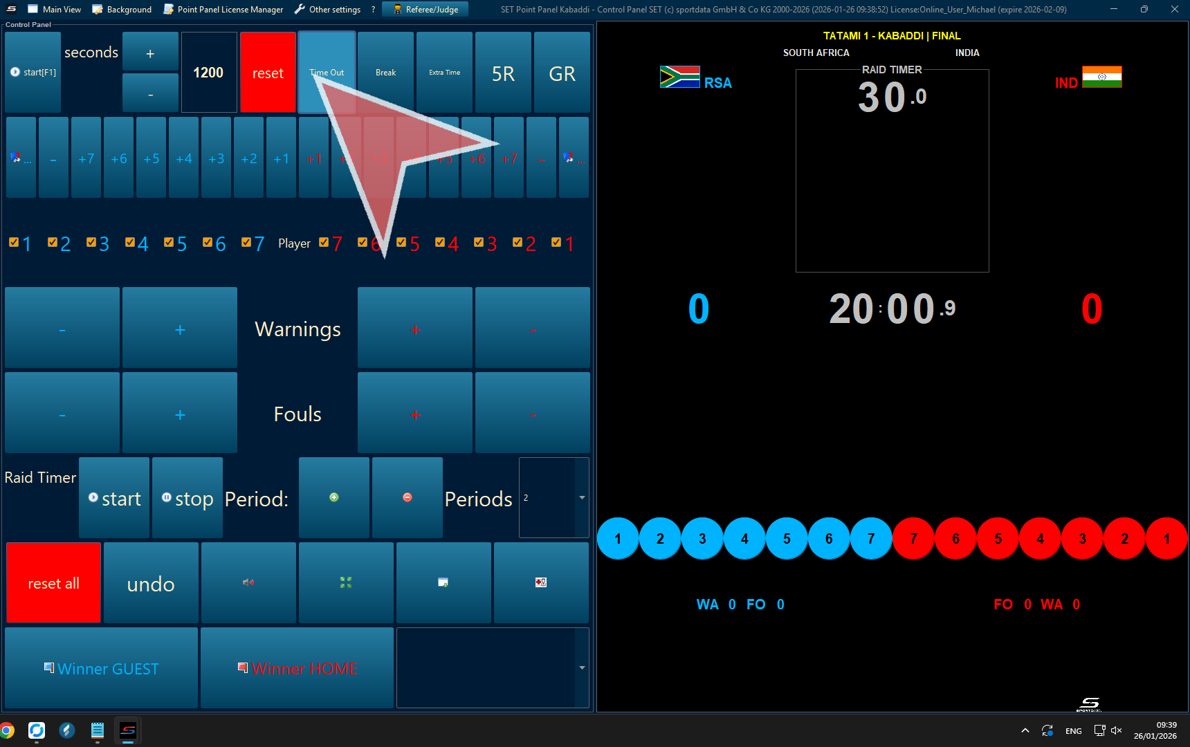 Point panel is where the scoreboard operator will input the match data. To update the match time, click the time field, change the number of seconds, and then click reset. Common times you might use are 20 minutes (1200 sec) or 15 minutes (900 sec). If you need to include milliseconds, simply add a period, for example 30.3.