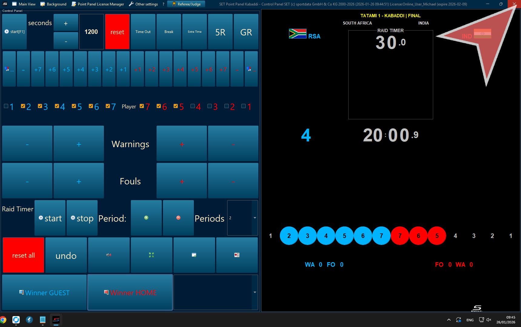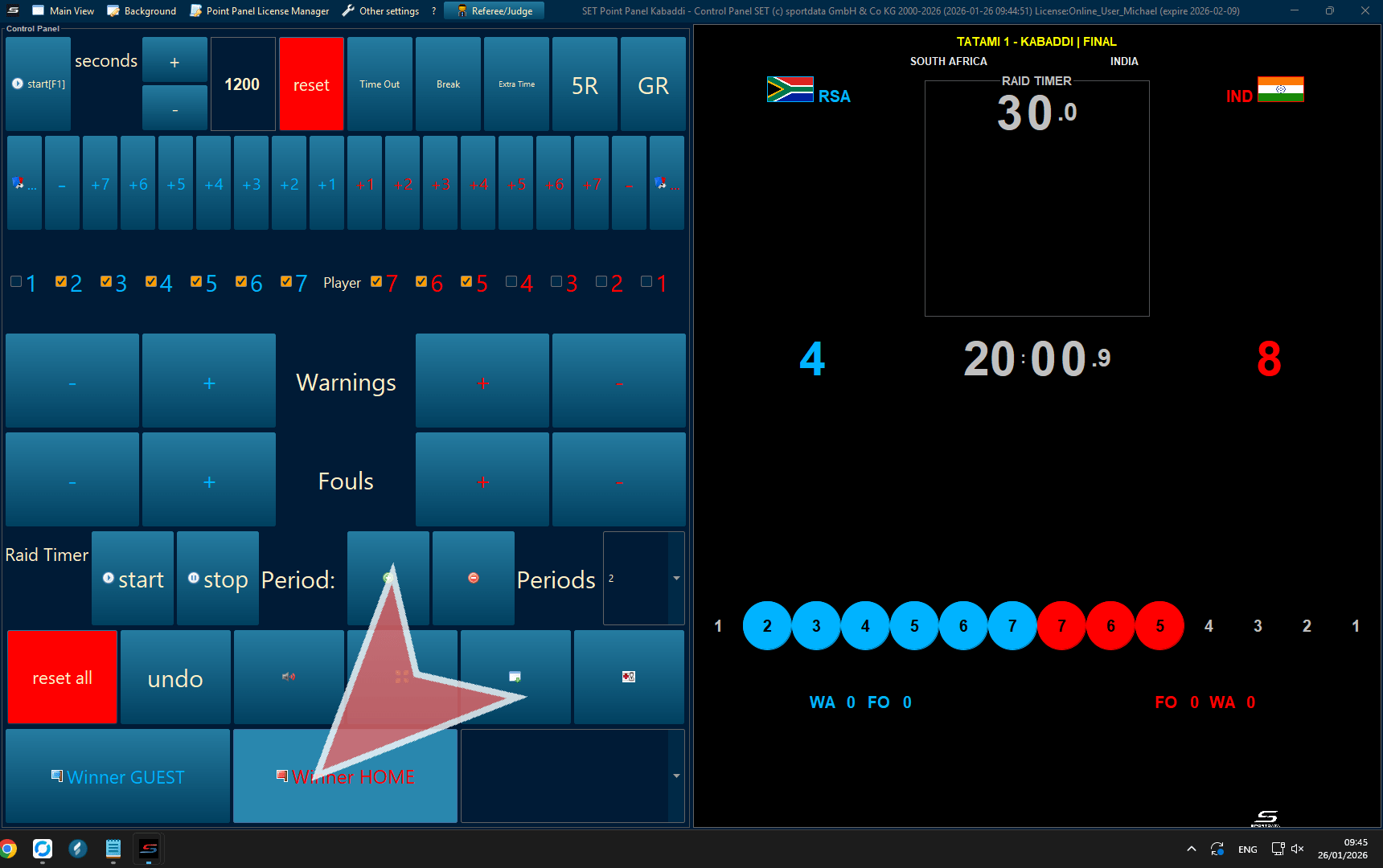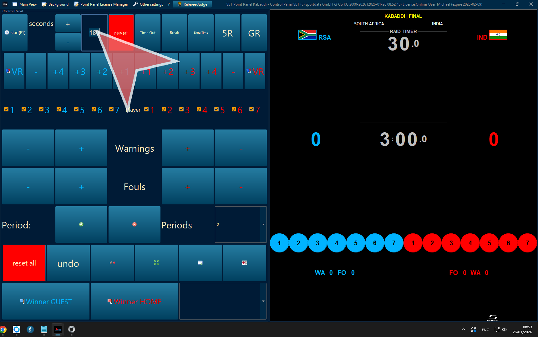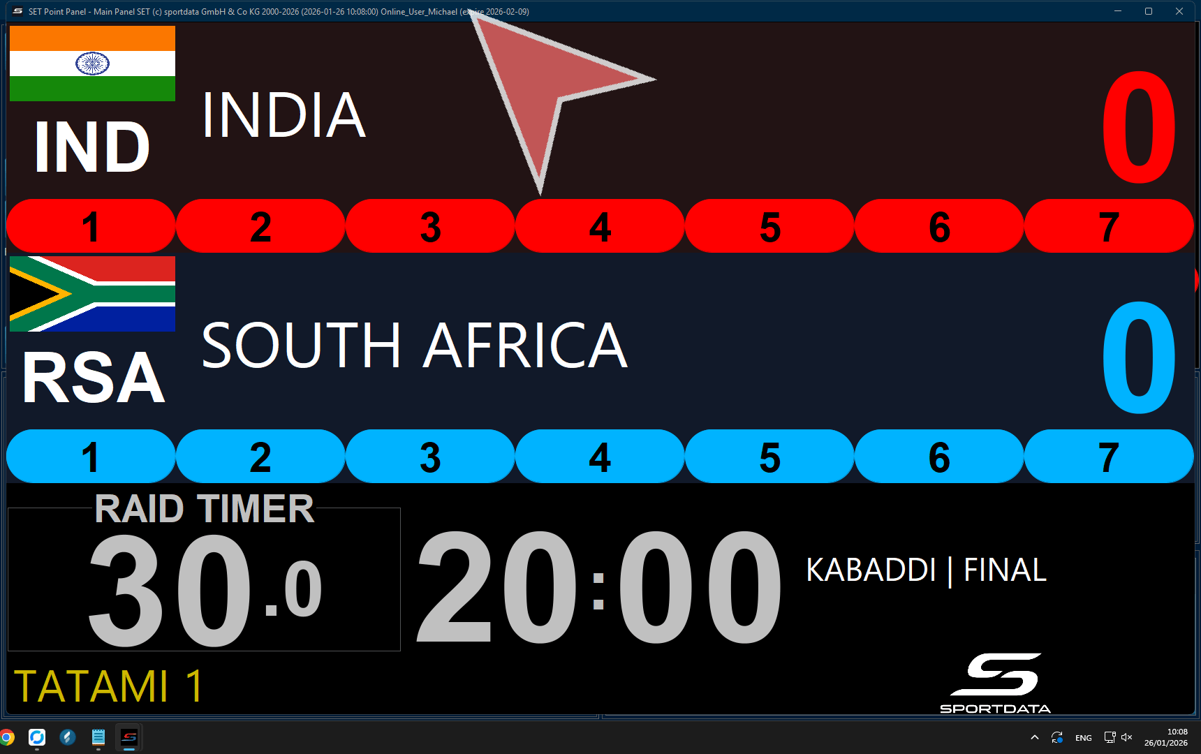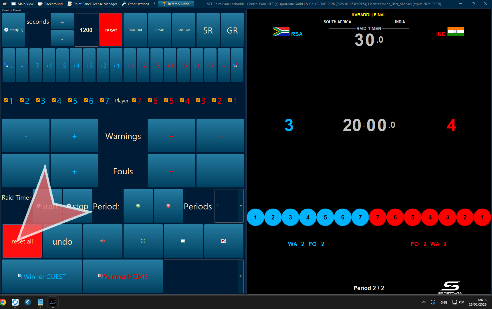 Point panel is where the scoreboard operator will input the match data. To update the match time, click the time field, change the number of seconds, and then click reset. Common times you might use are 20 minutes (1200 sec) or 15 minutes (900 sec). If you need to include milliseconds, simply add a period, for example 30.3.