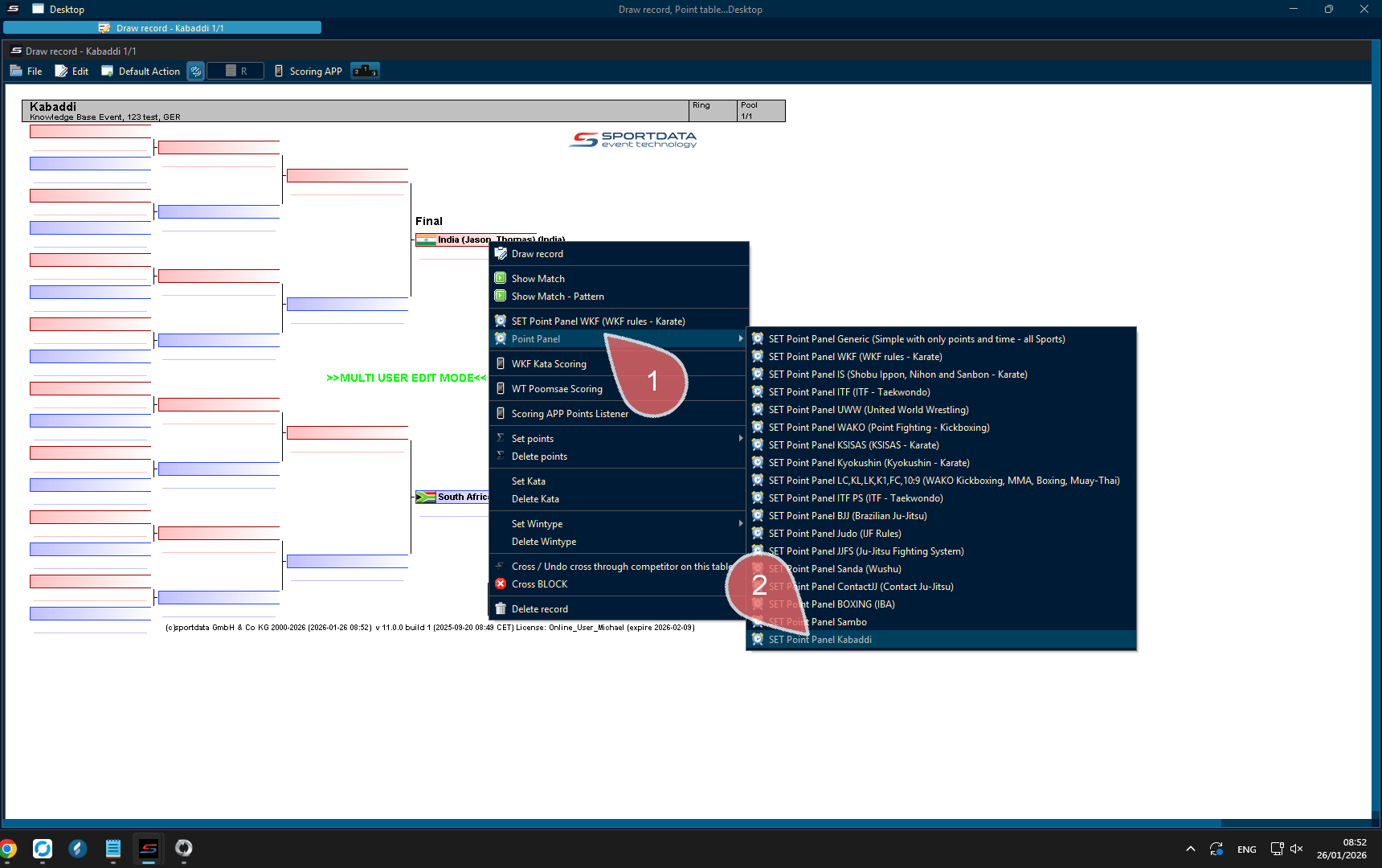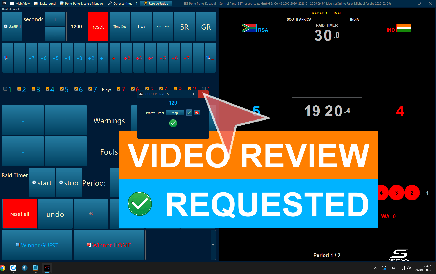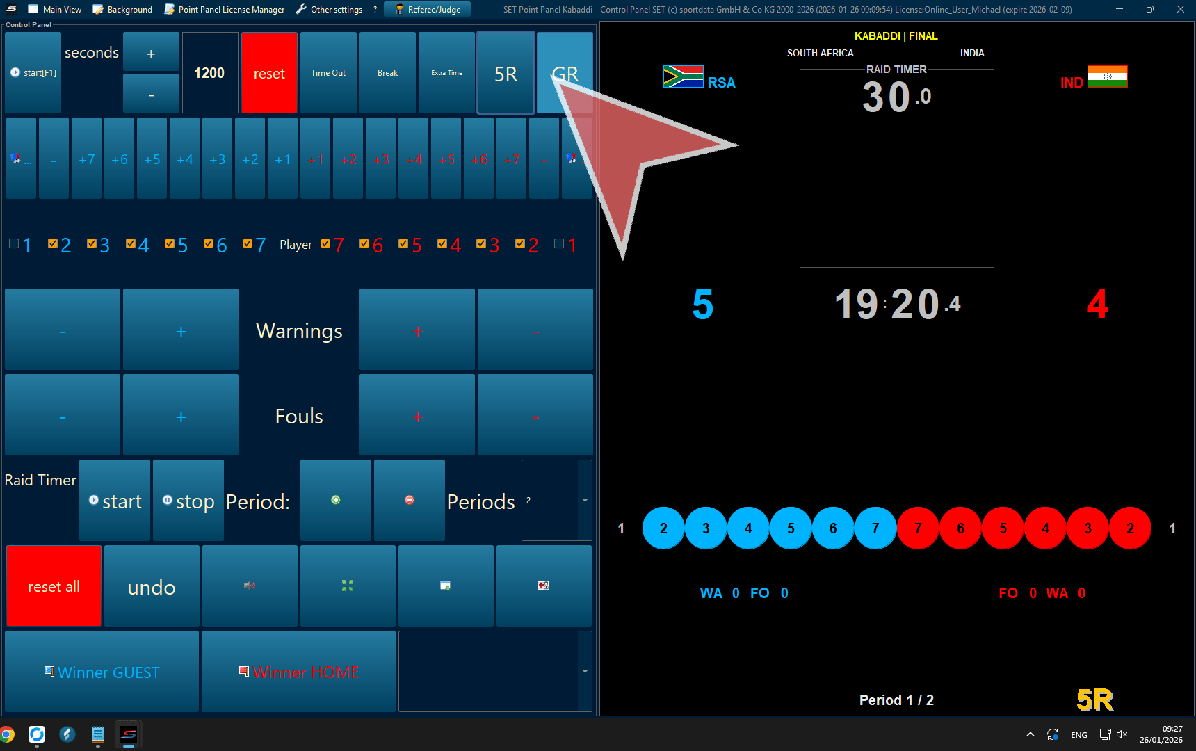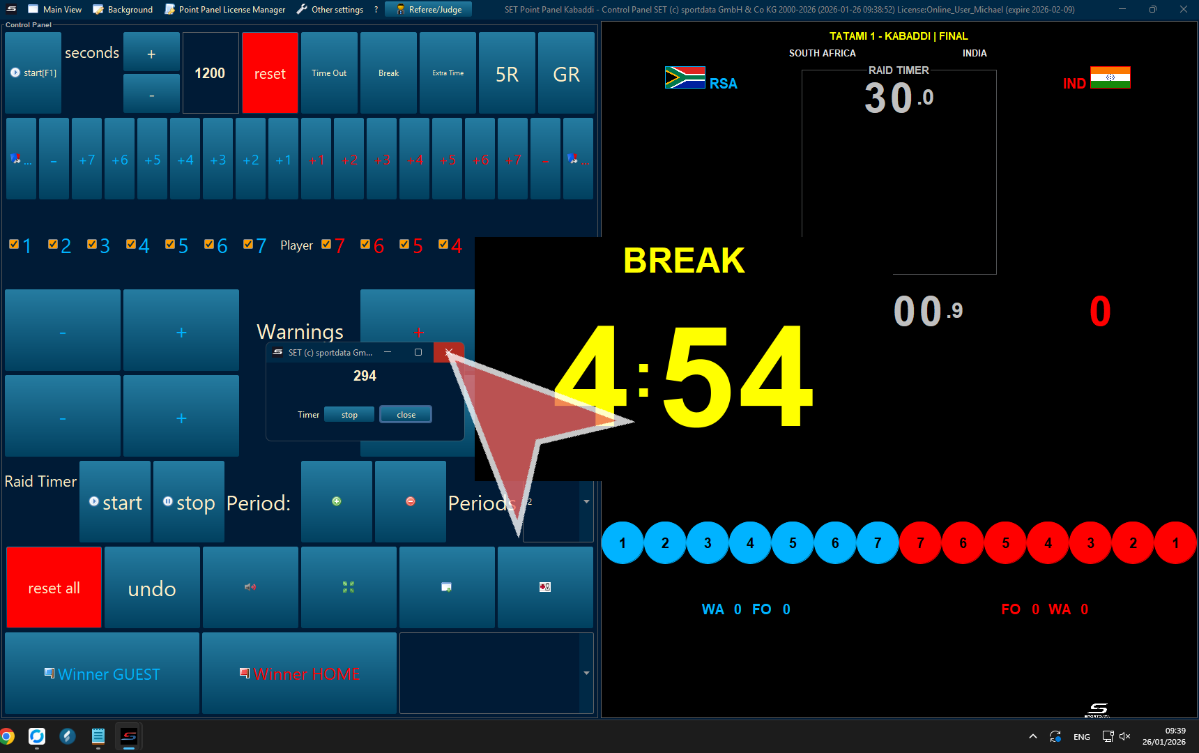 Point panel is where the scoreboard operator will input the match data. To update the match time, click the time field, change the number of seconds, and then click reset. Common times you might use are 20 minutes (1200 sec) or 15 minutes (900 sec). If you need to include milliseconds, simply add a period, for example 30.3.
