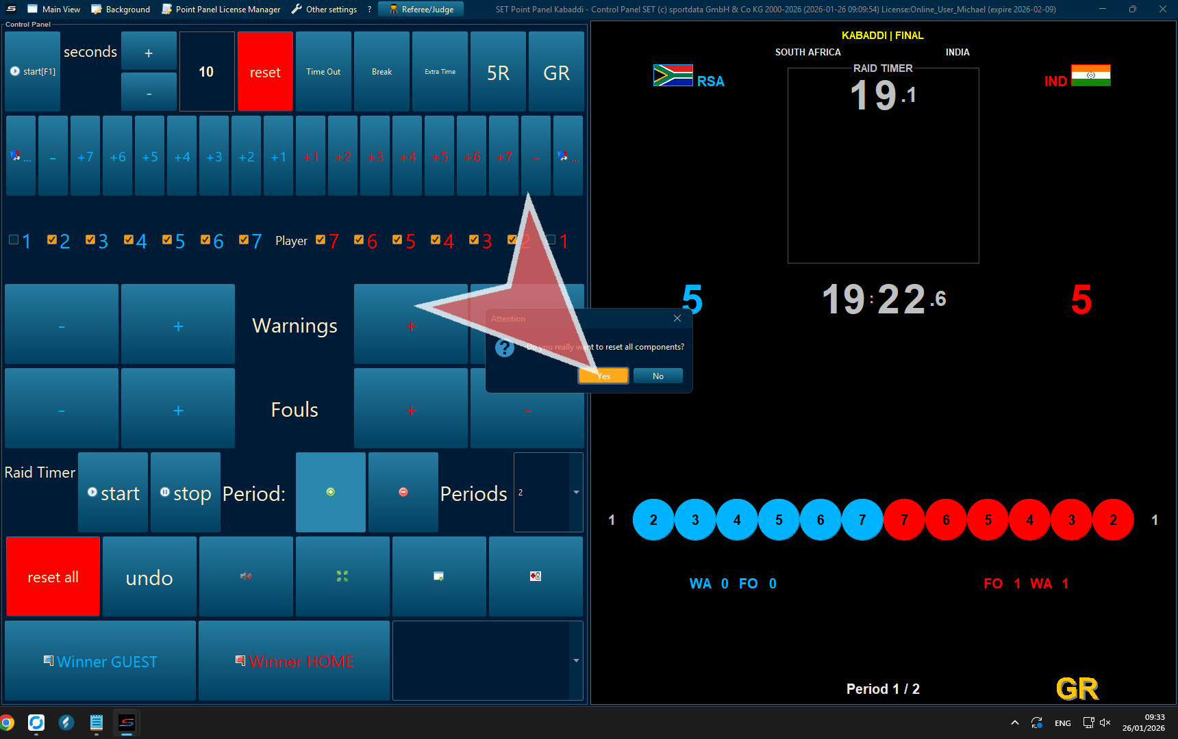 Proceed to confirm reset all components to start the new half as it will only reset the times, active players, but not the points, warnings, or fouls.