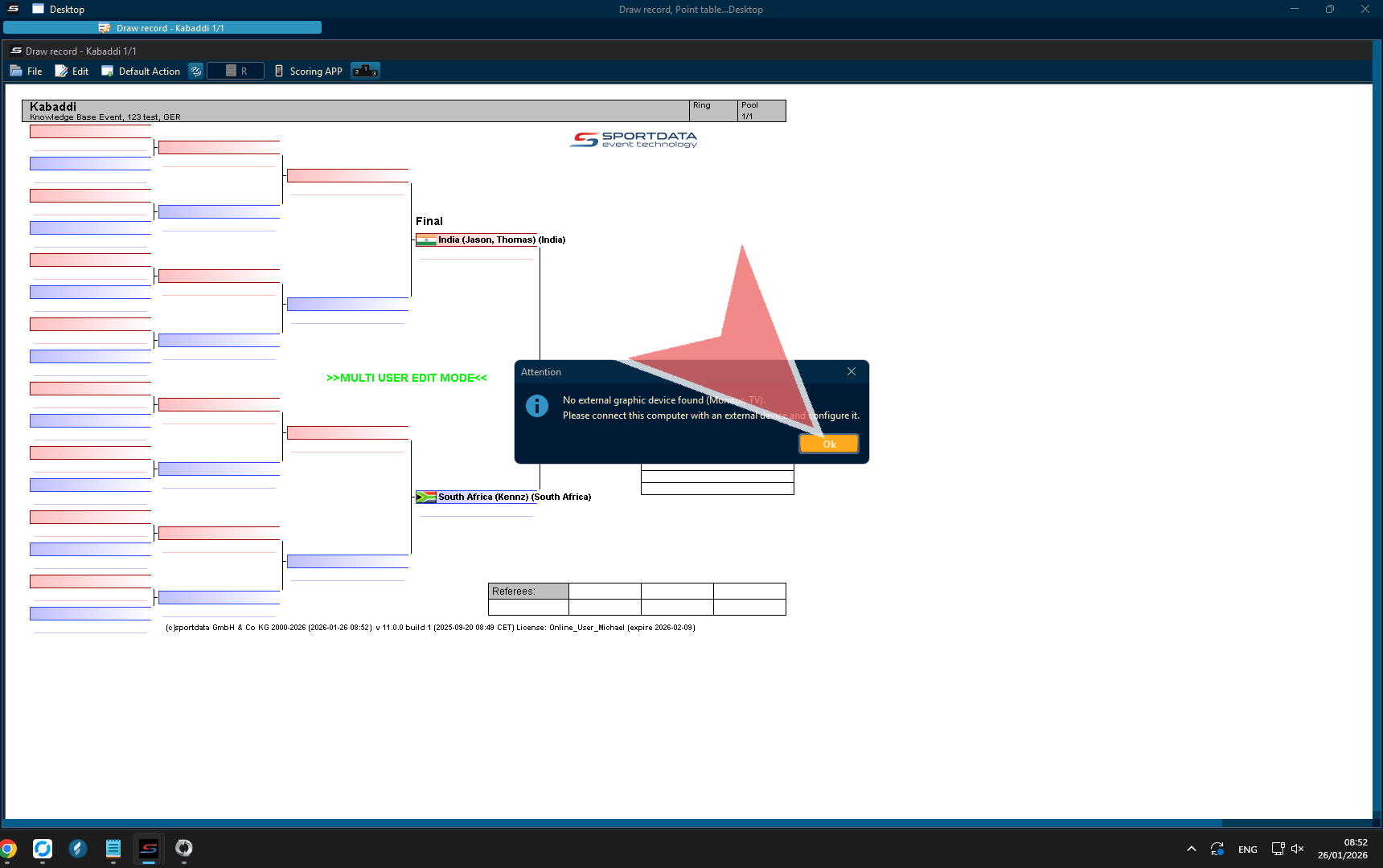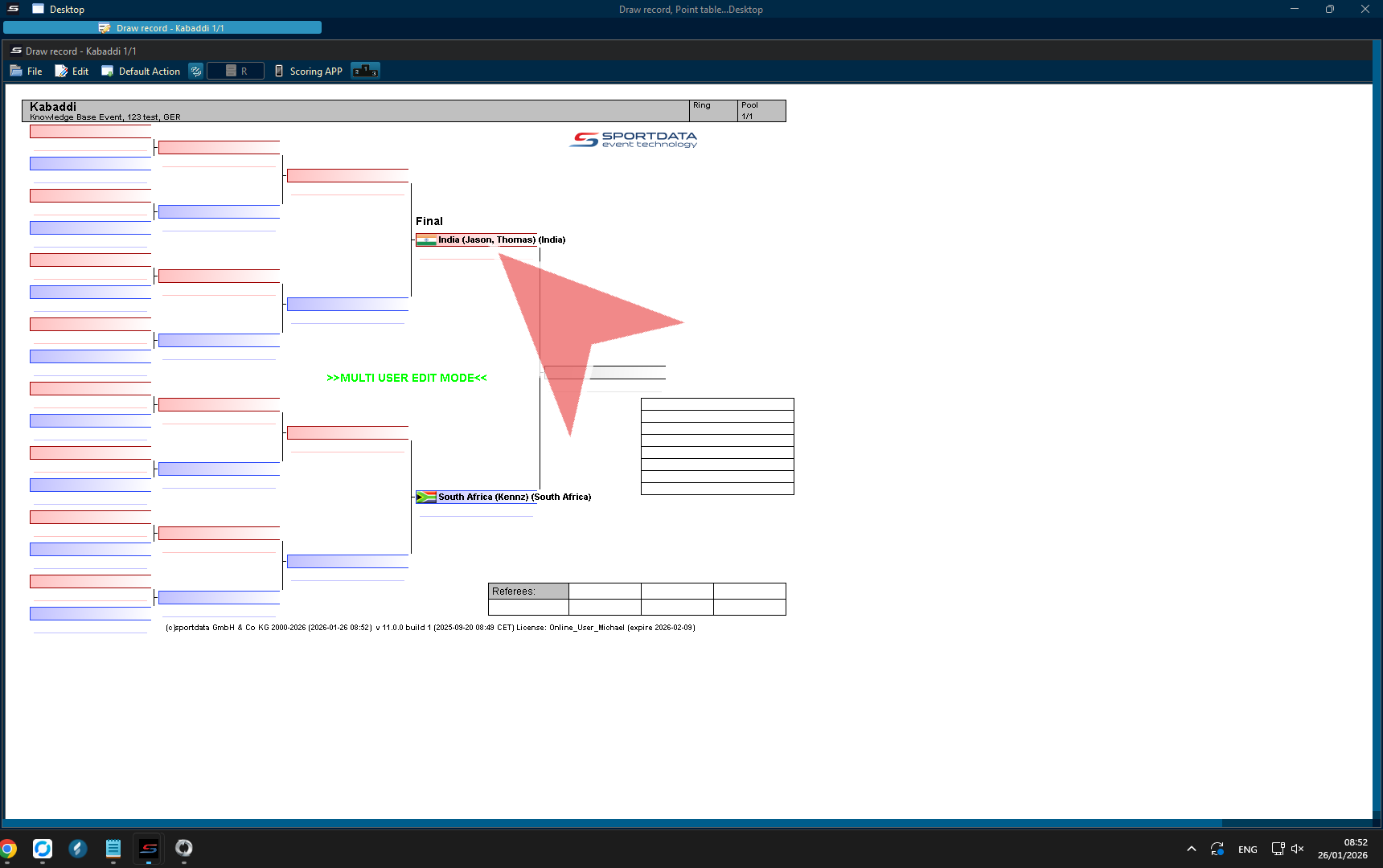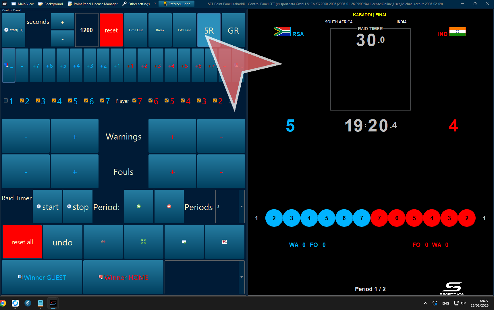 Click on the colour and athlete number in ascending order to show the number of active athletes on the court.