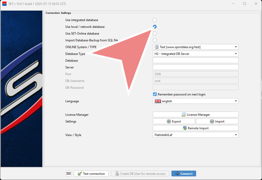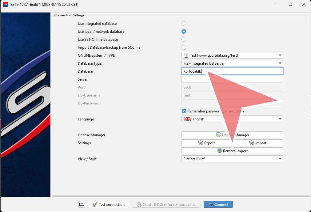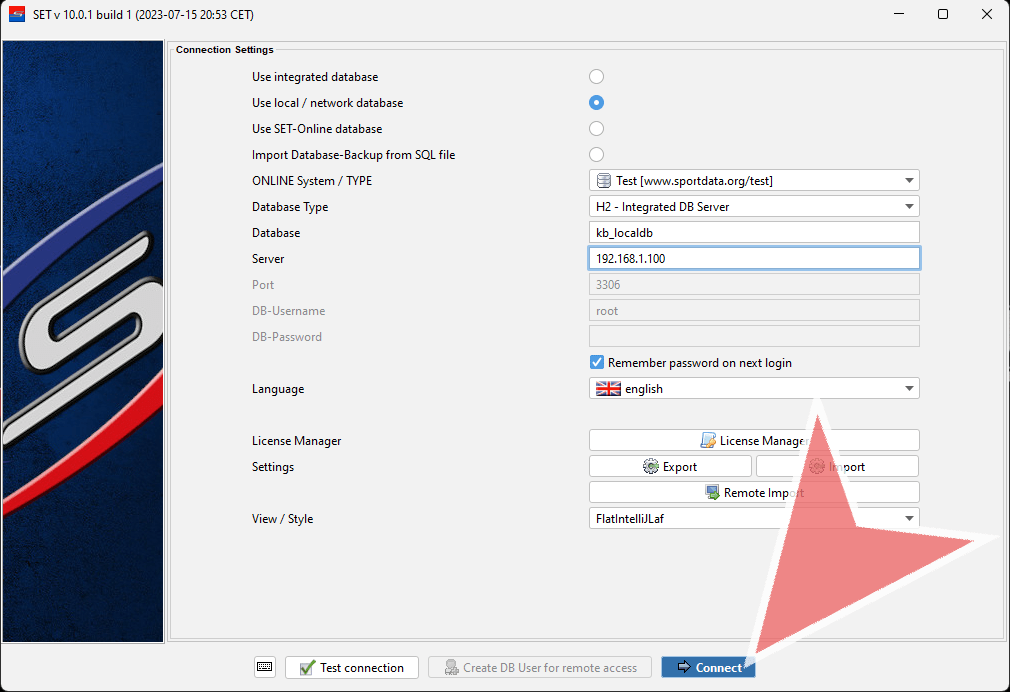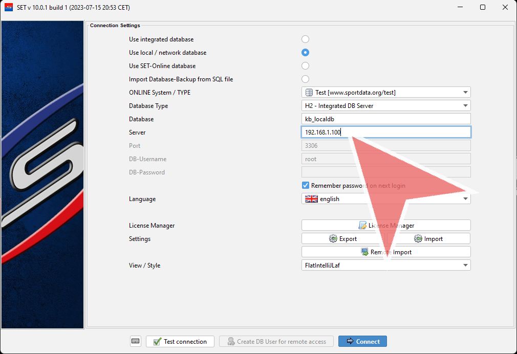 Enter the IP-address of the local database server, e.g. 192.168.1.100. Make sure that the laptop which you want to connect to the local database has the same IP-address range and is able to “ping” the local database server.