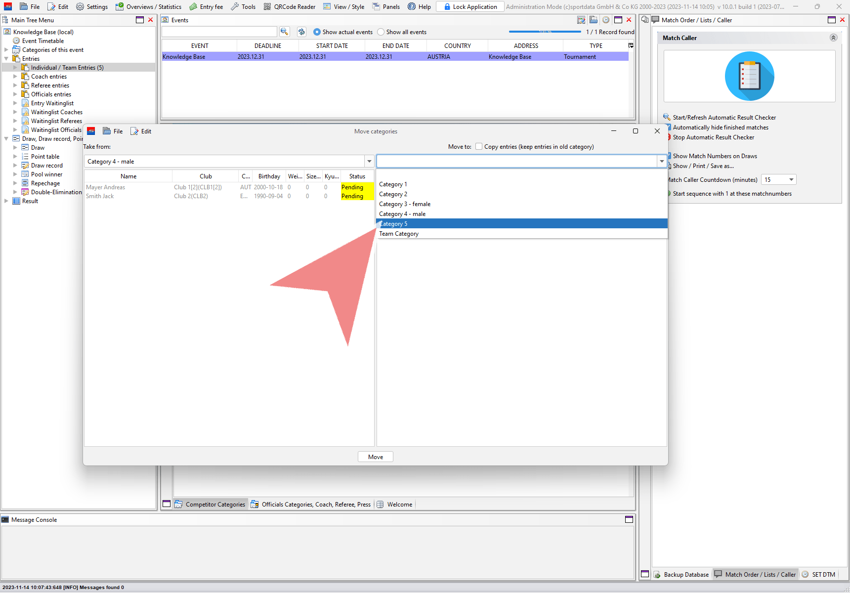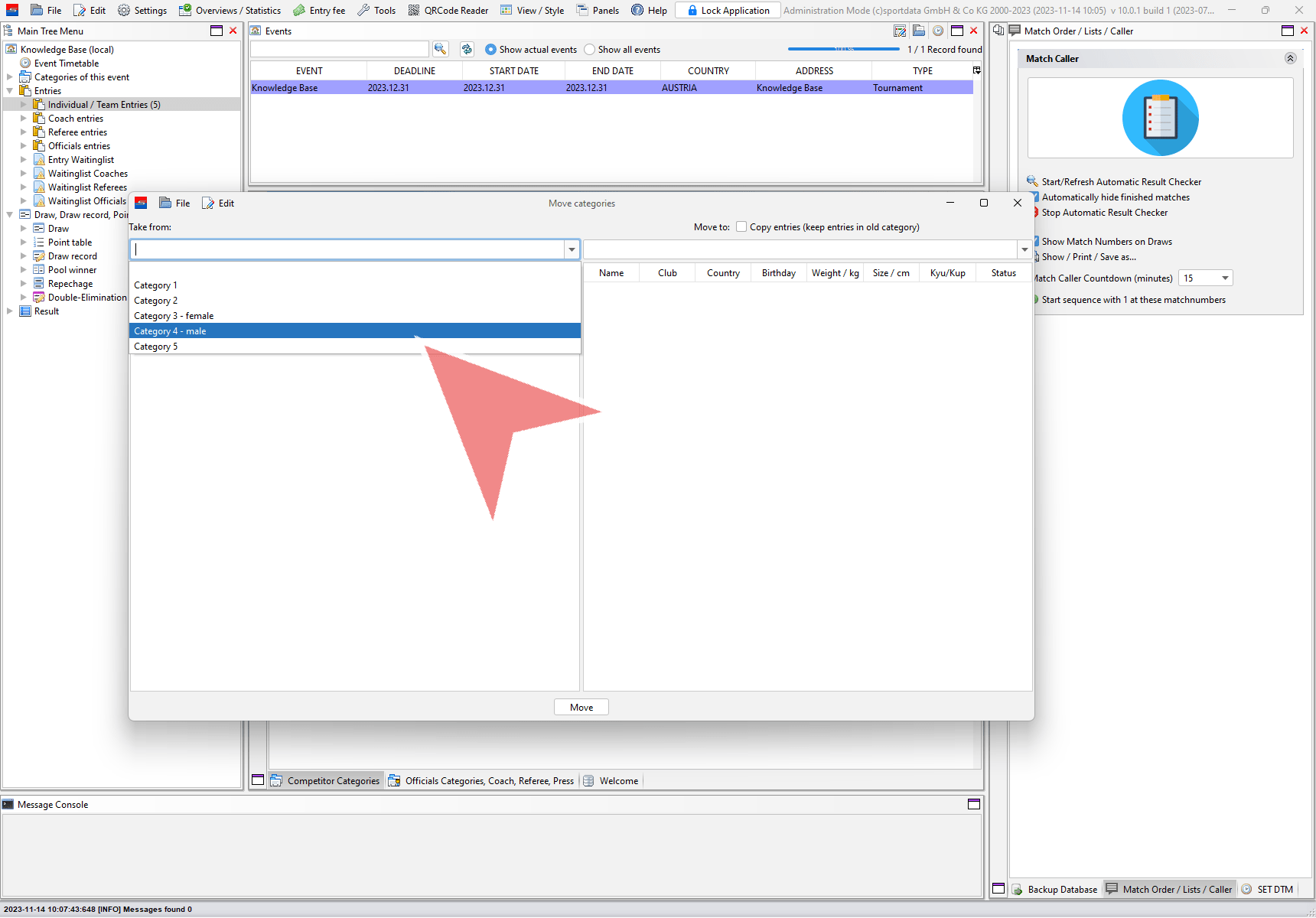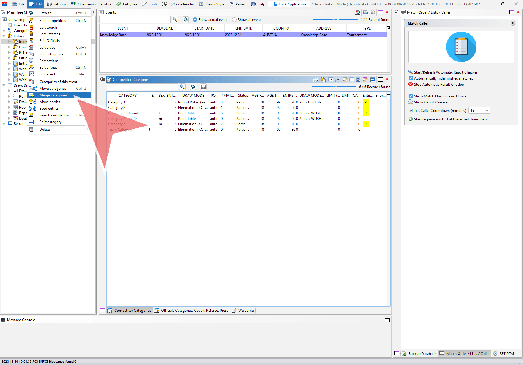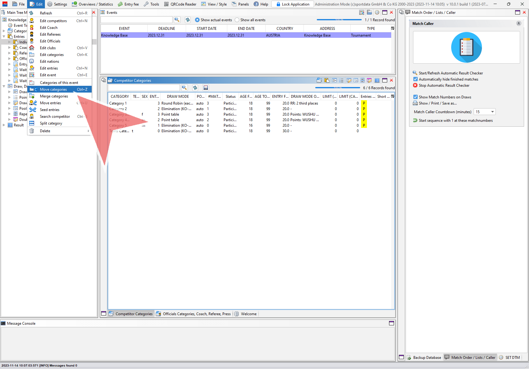 Moving categories means to move all entries of one category to another category. Login with the administration mode, go to “Edit” in the menu bar and select “Move categories”