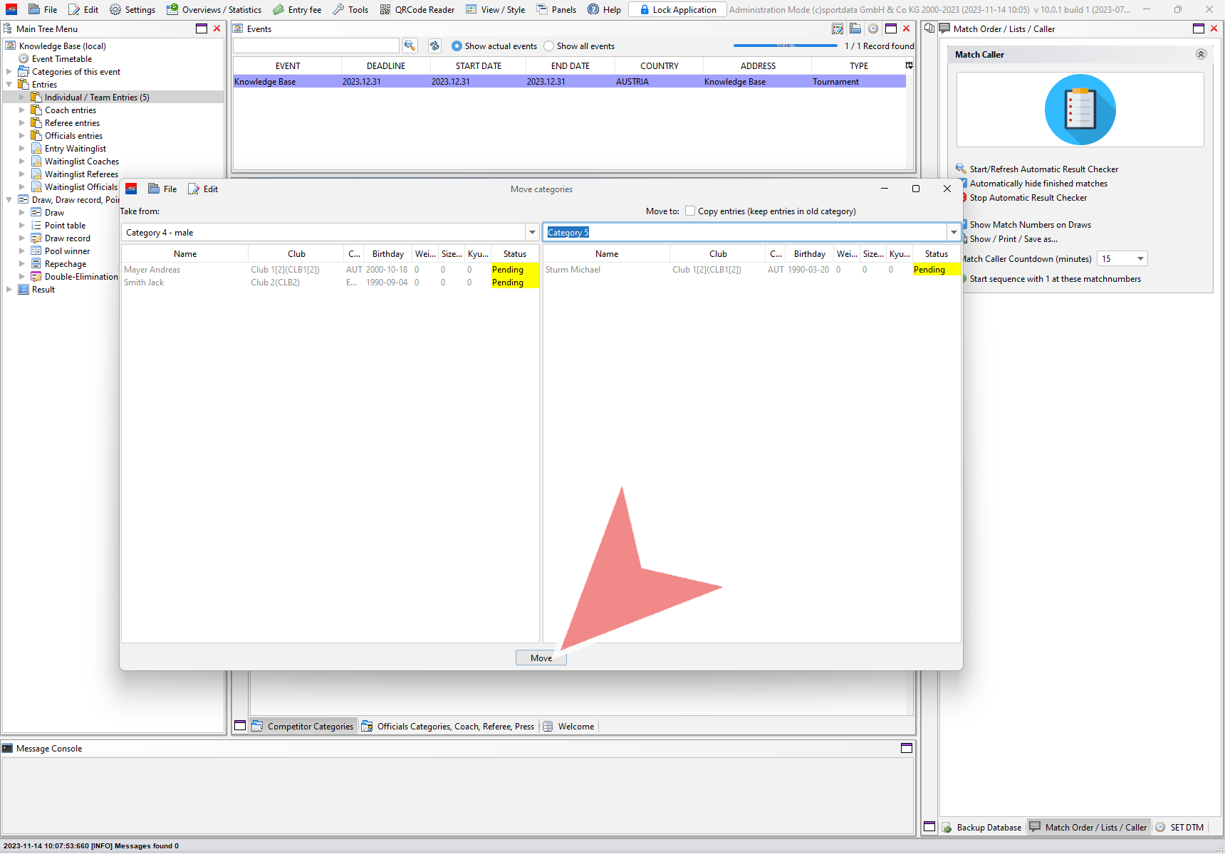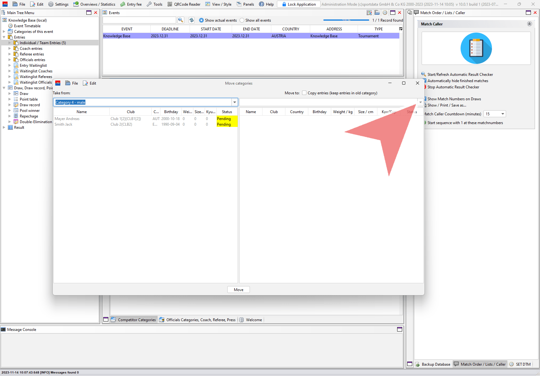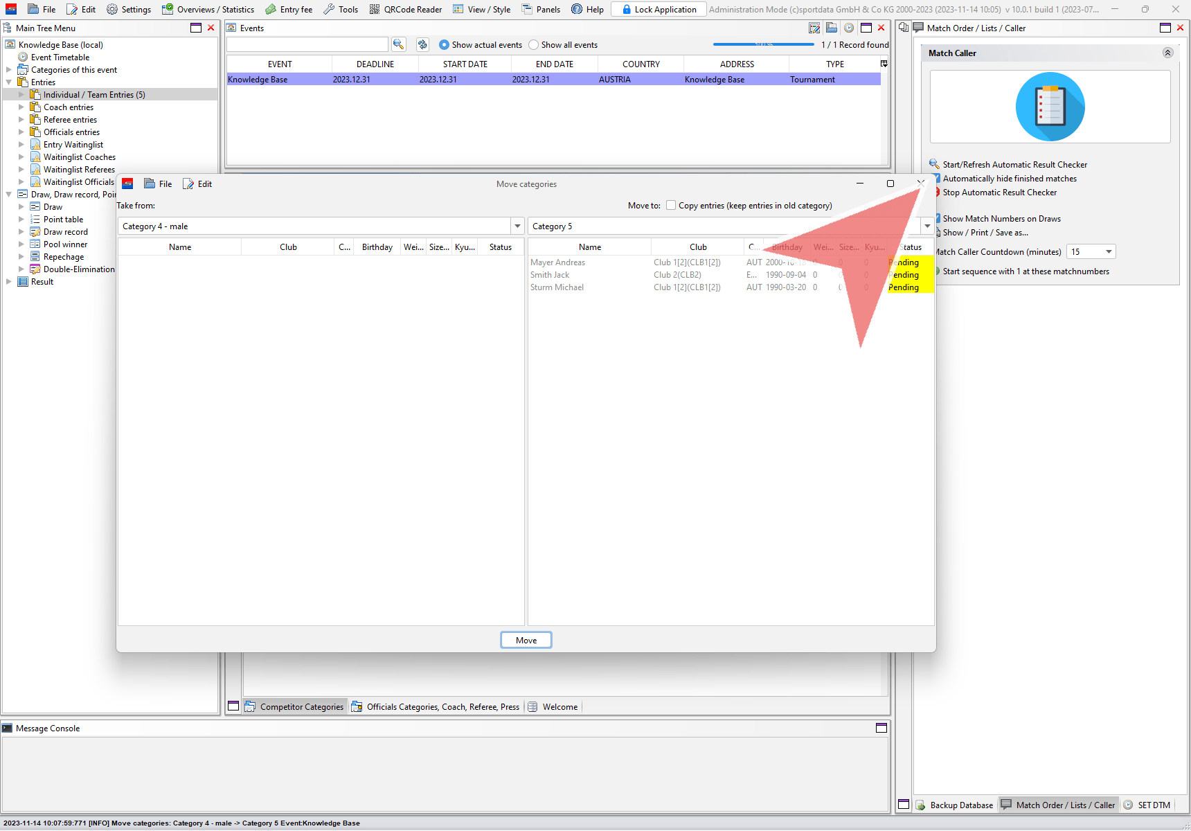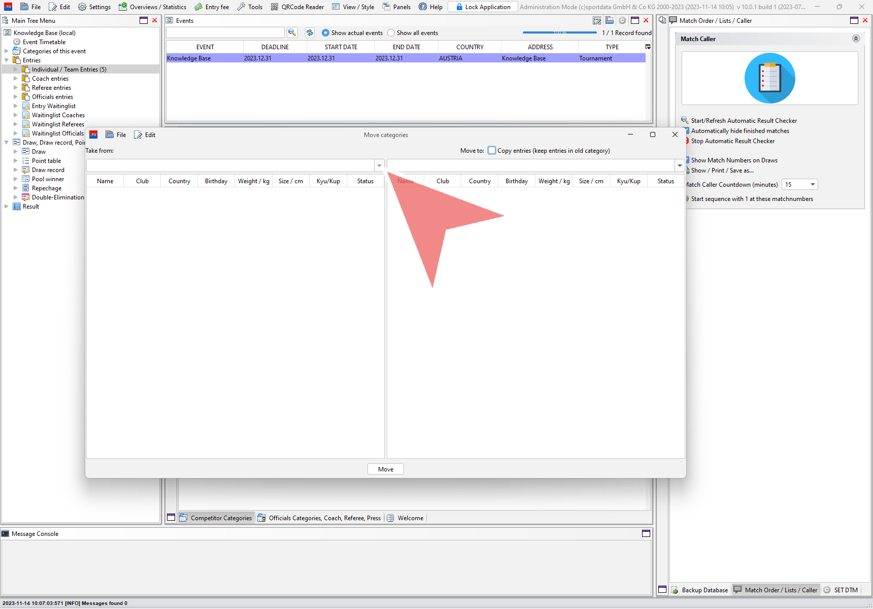 Moving categories means to move all entries of one category to another category. Login with the administration mode, go to “Edit” in the menu bar and select “Move categories”