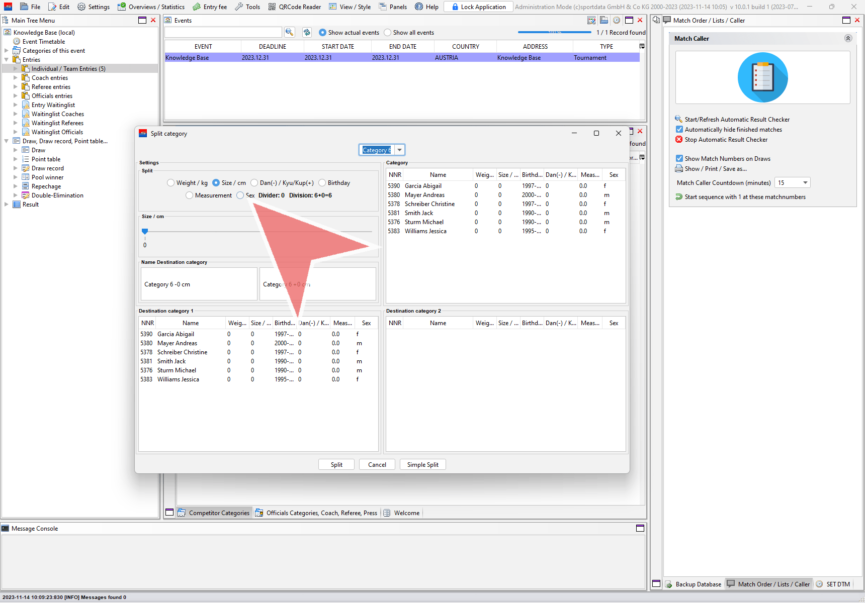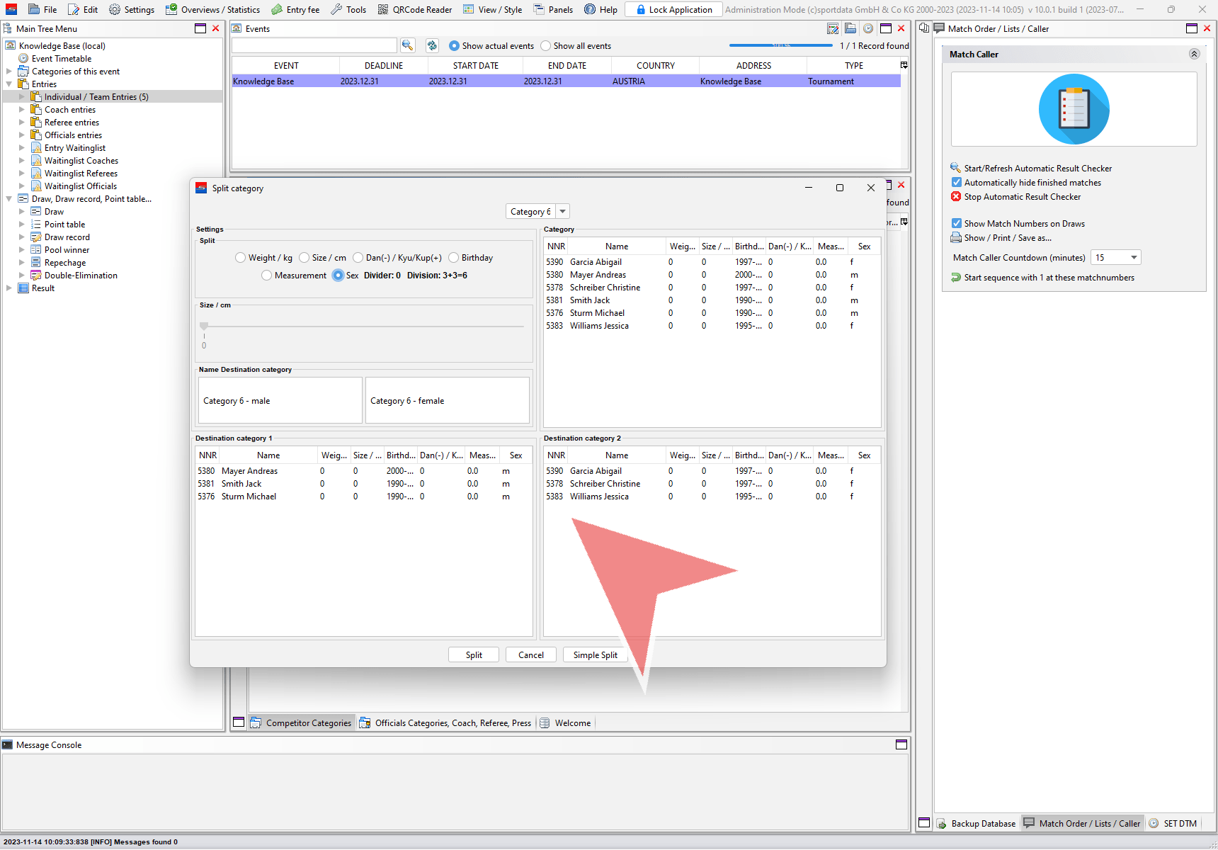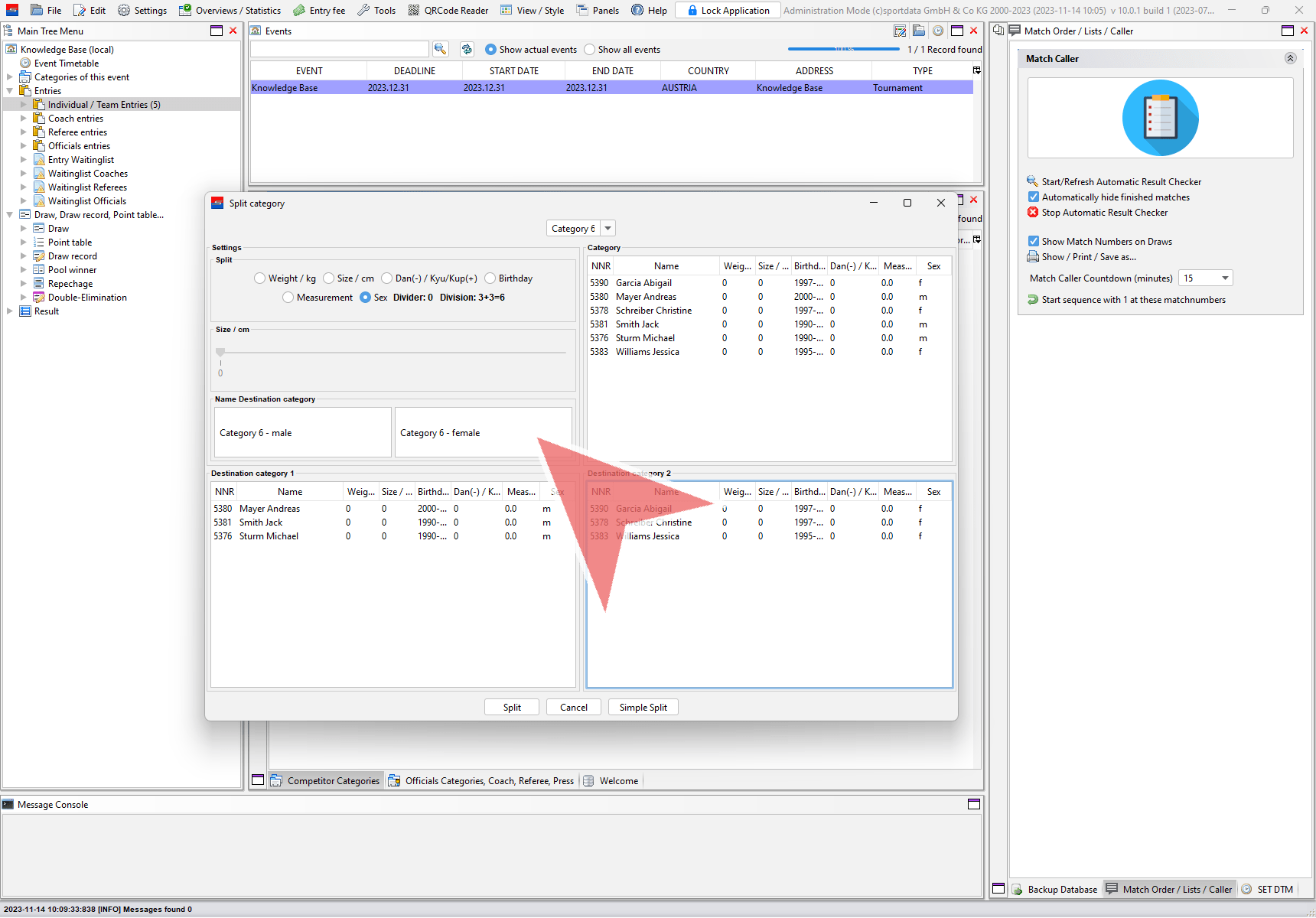 On the top right side you find all entries of the selected category. Below you find the possible two new categories devided by the chosen split method (here by gender).