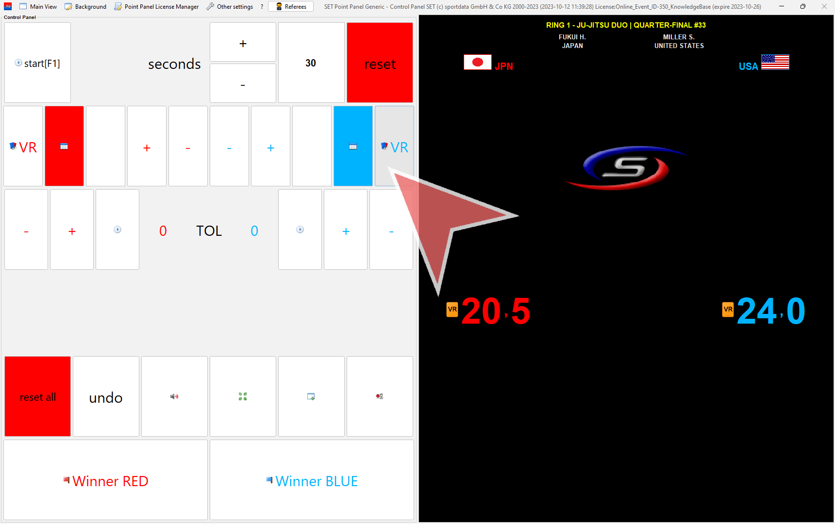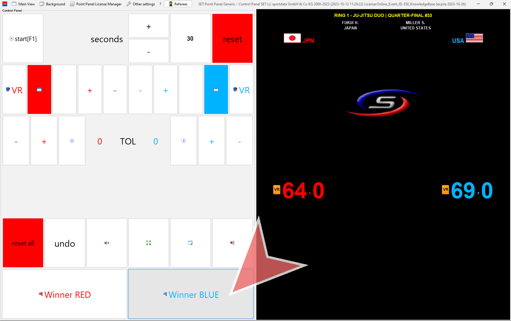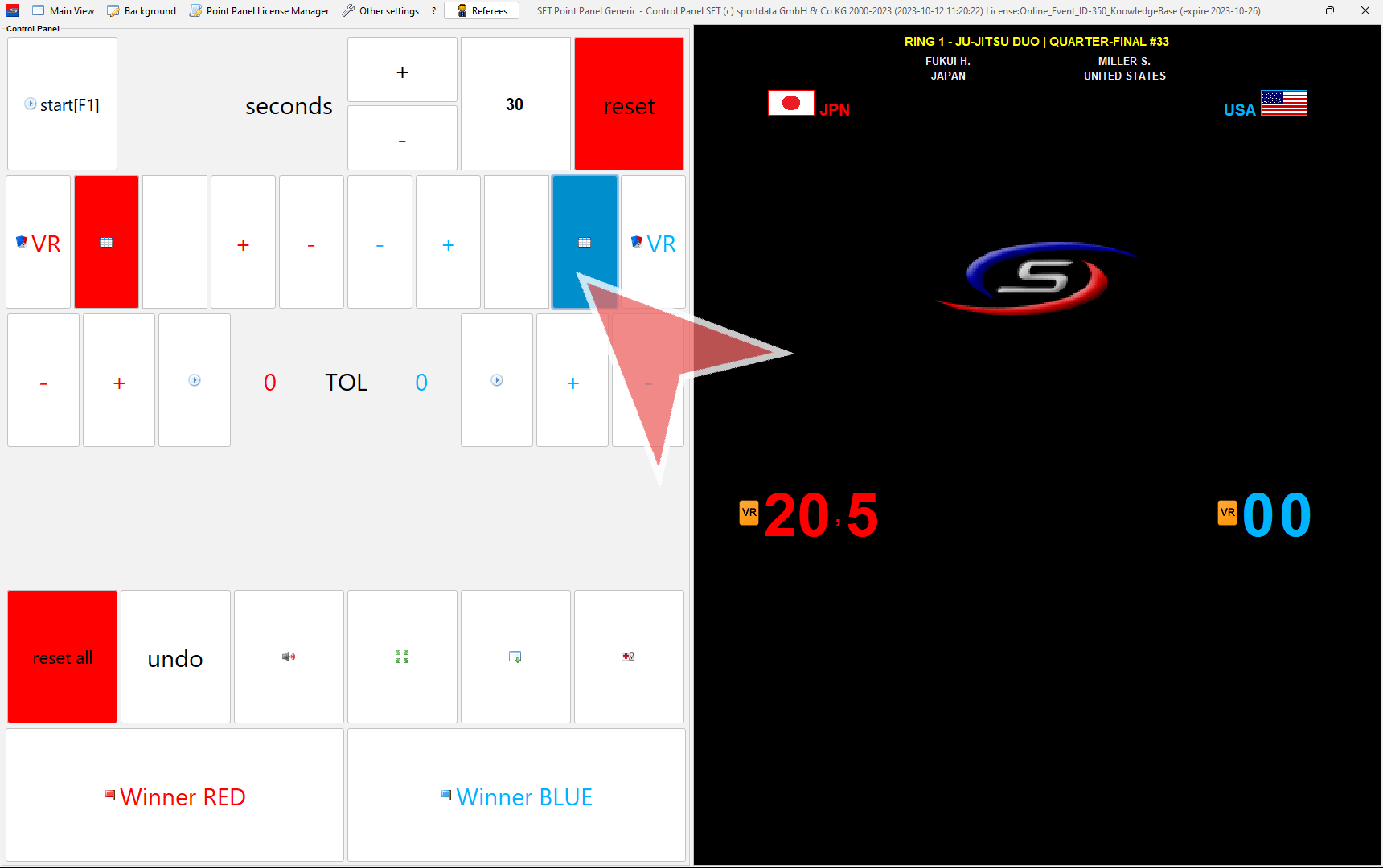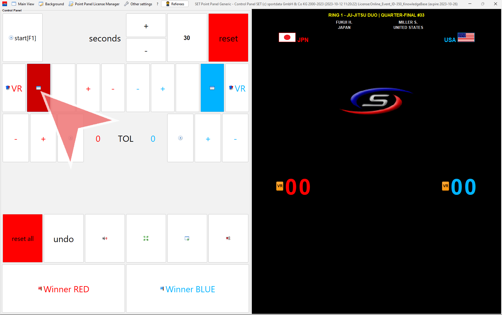 In case a coach challenges a decision, click on the “VR”-button in red (left) or blue (right).