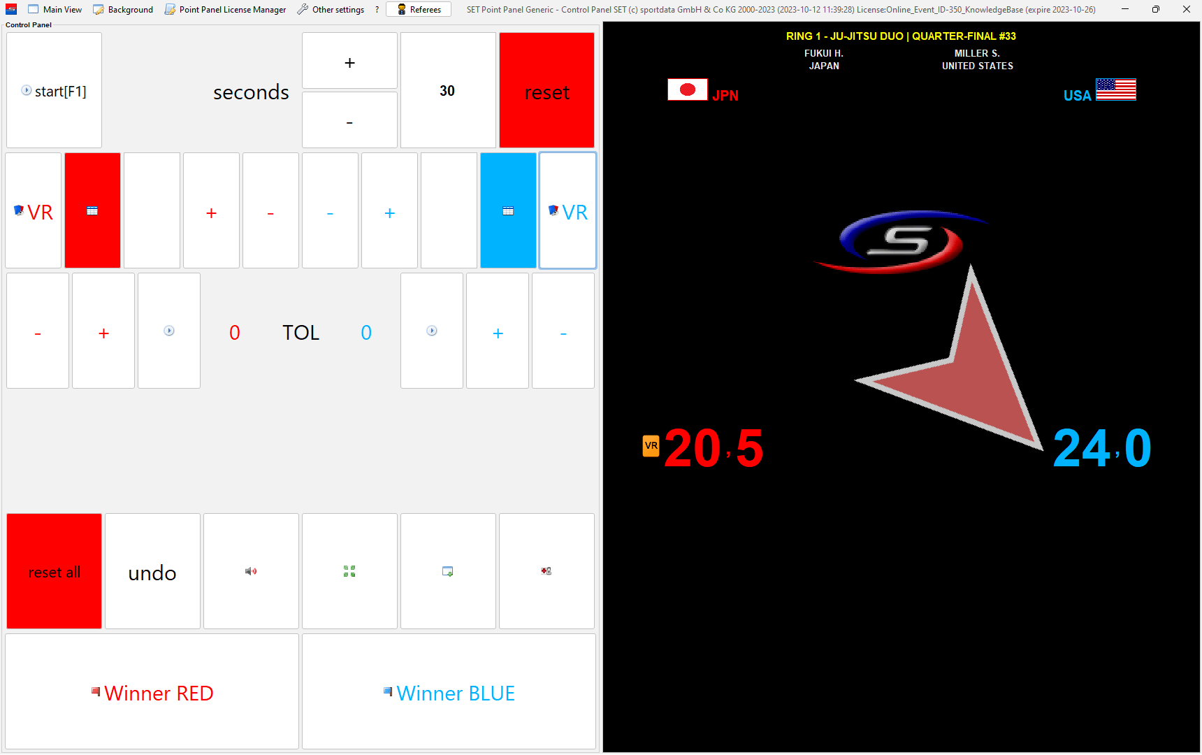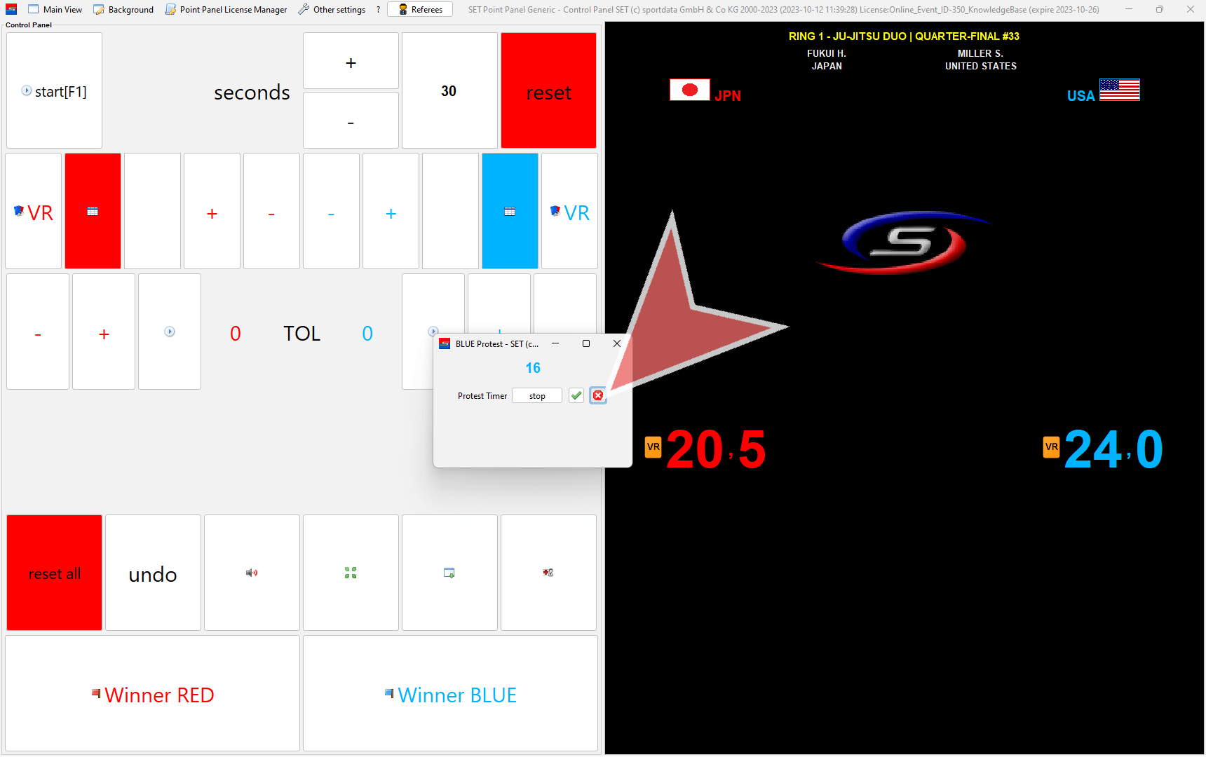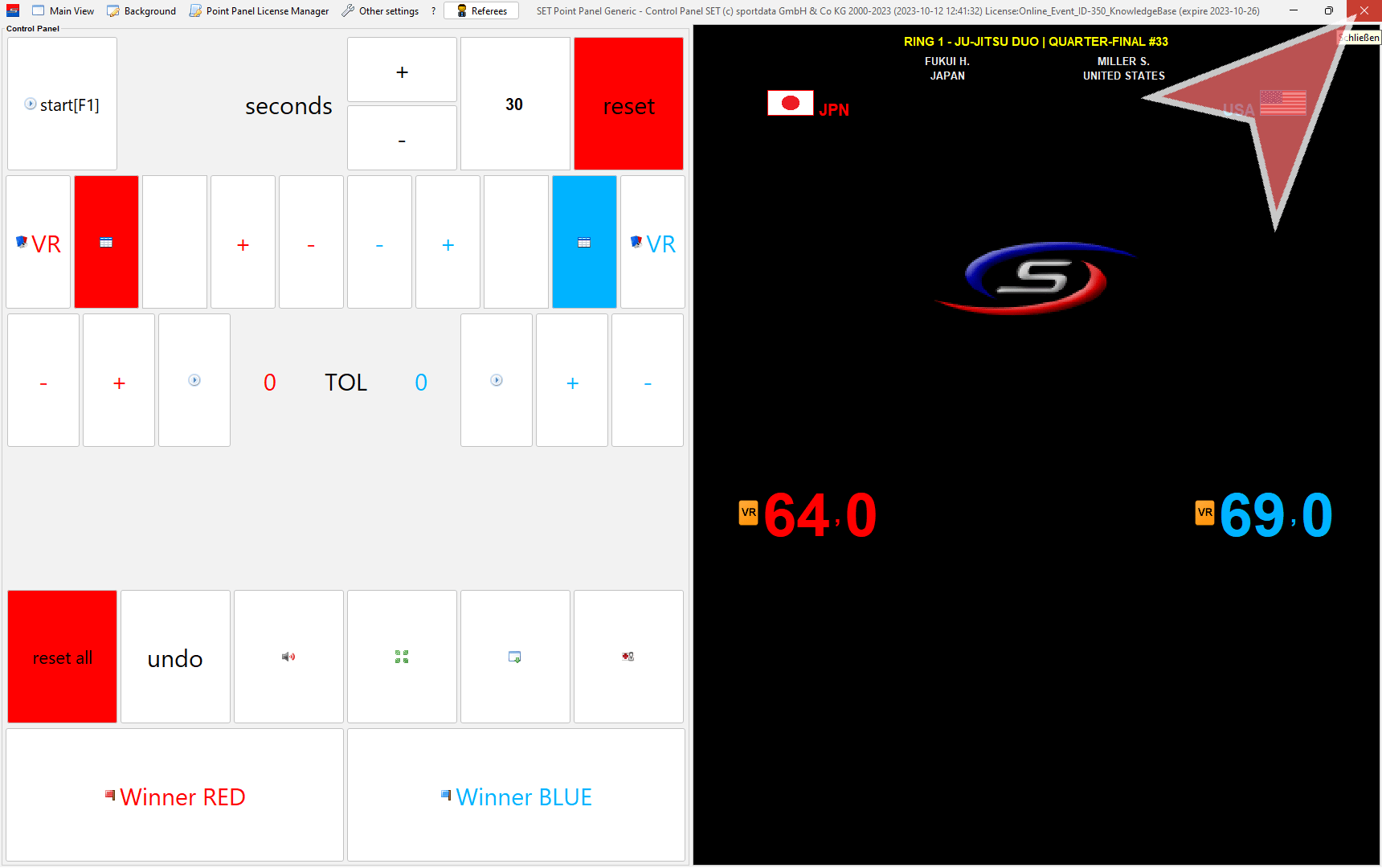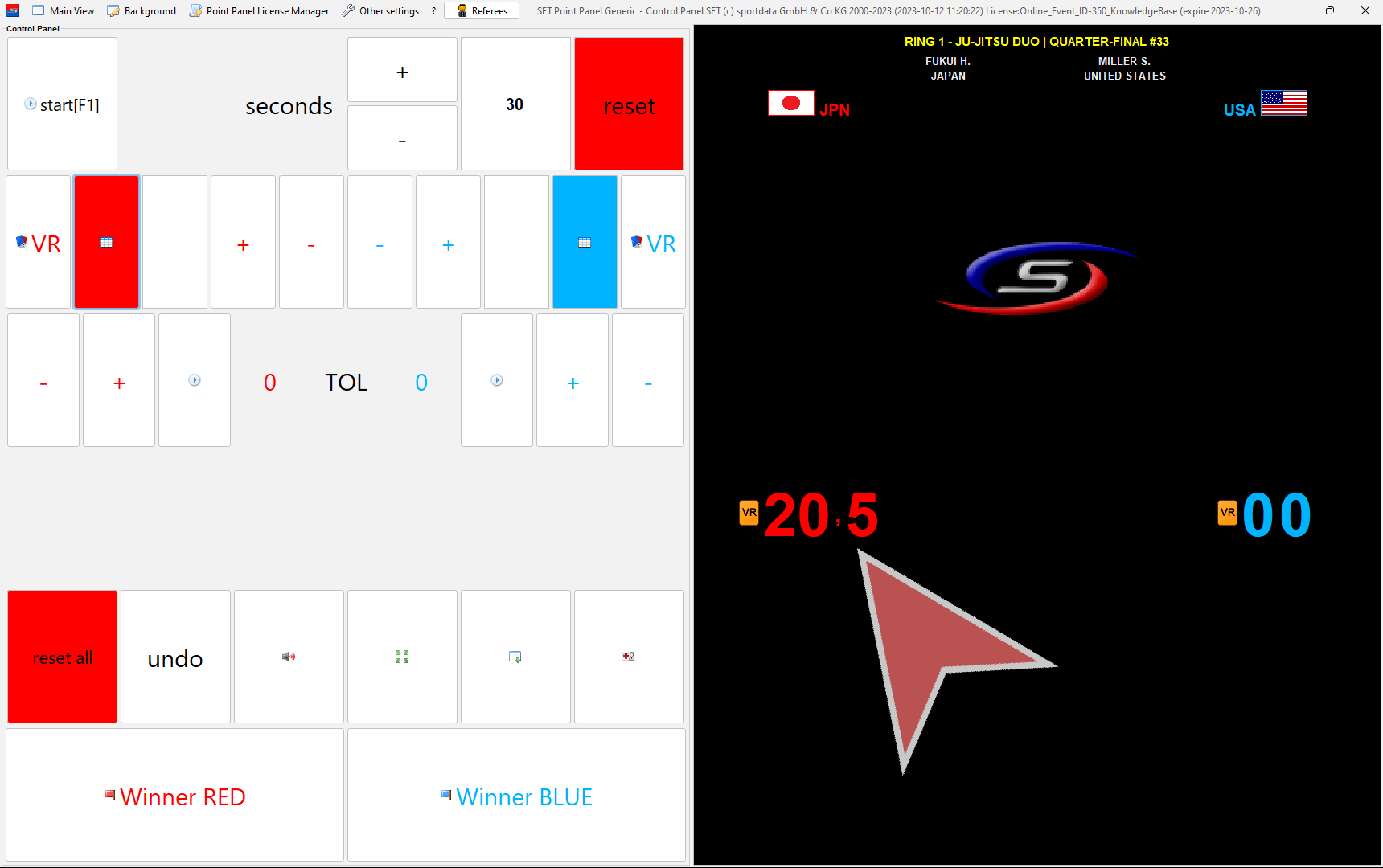 In case a coach challenges a decision, click on the “VR”-button in red (left) or blue (right).