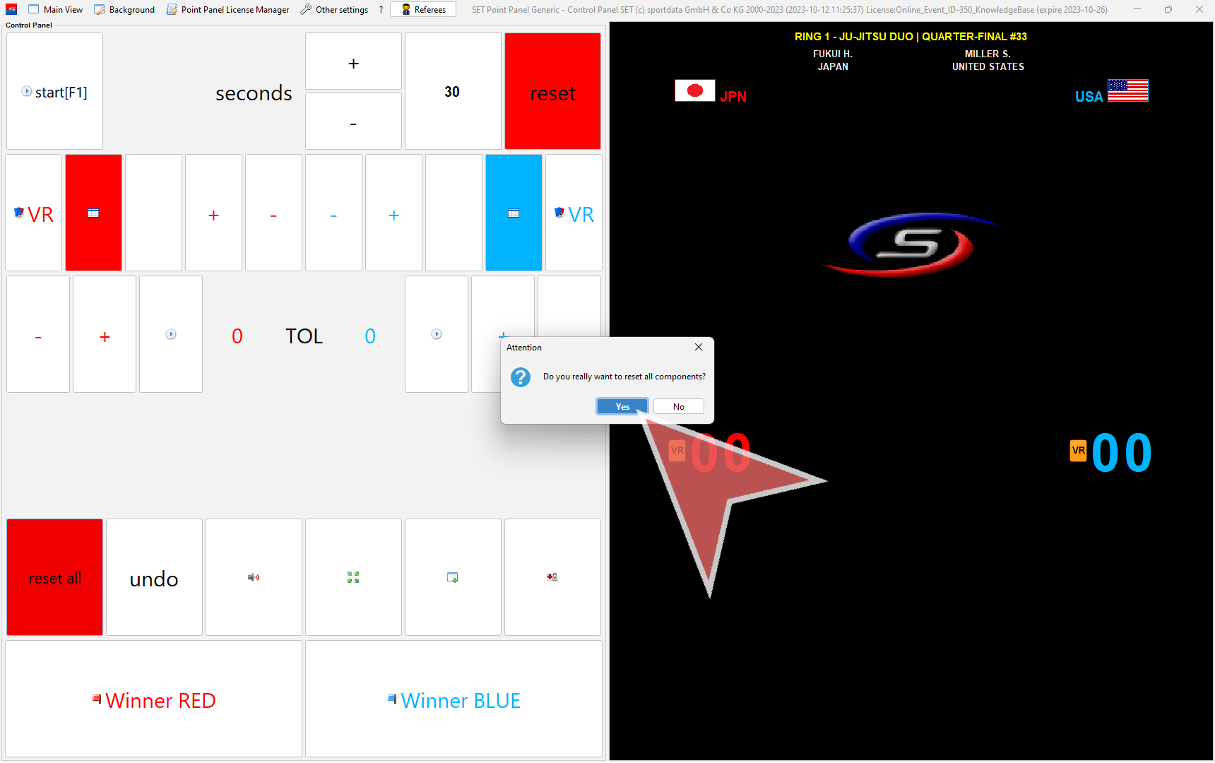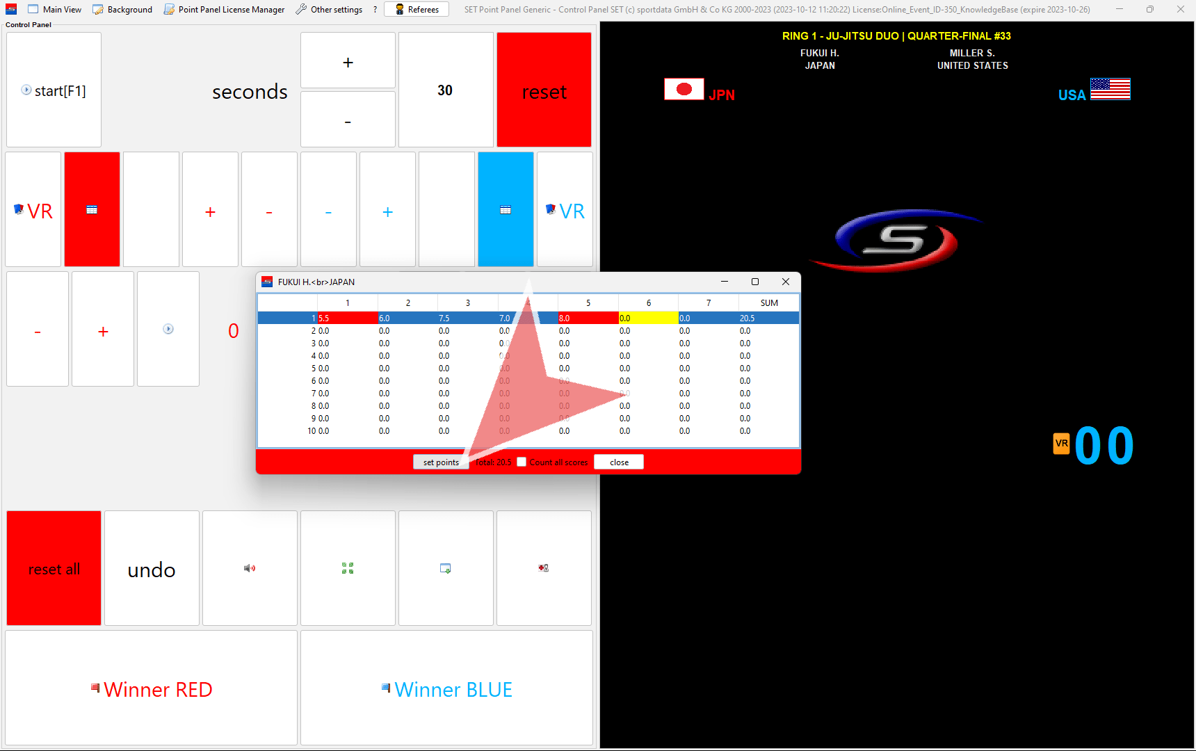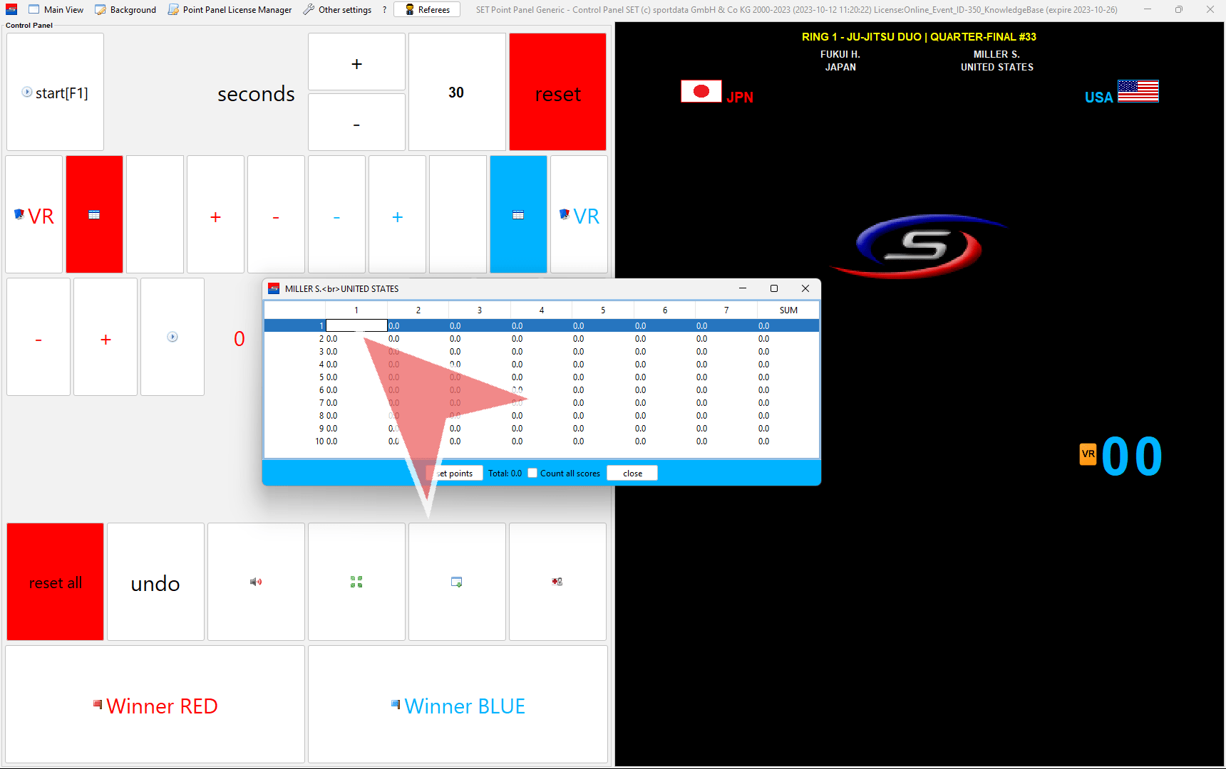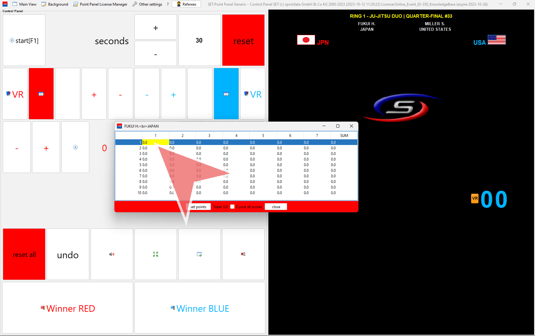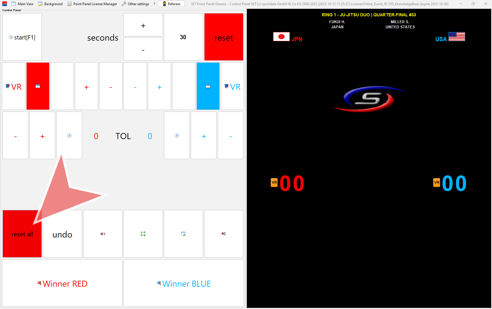 This is the view of the scoreboard. Before each fight click on “reset all”.