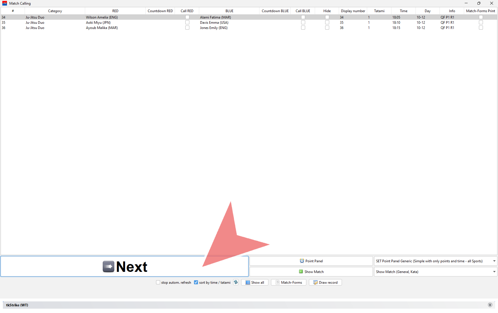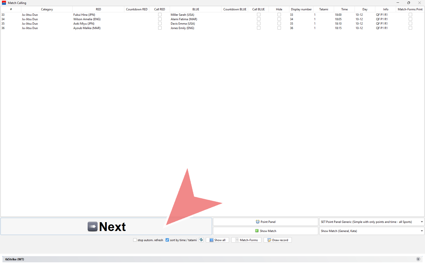 In the match caller you find all matches that are scheduled for your Mat. Click on the “Next”-button to open the next match.