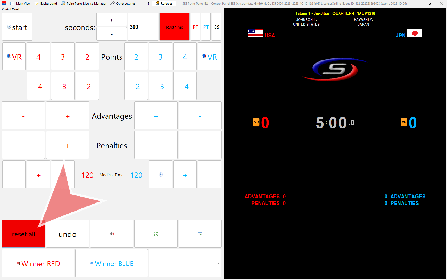 The scoreboard opens automatically. Before each match click on “reset all”.