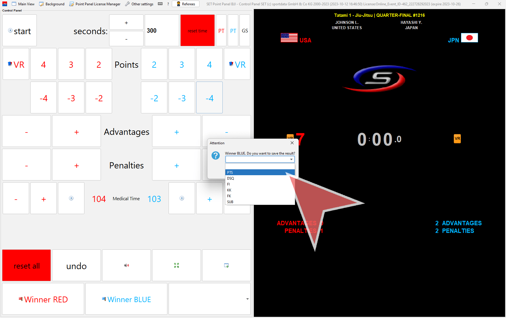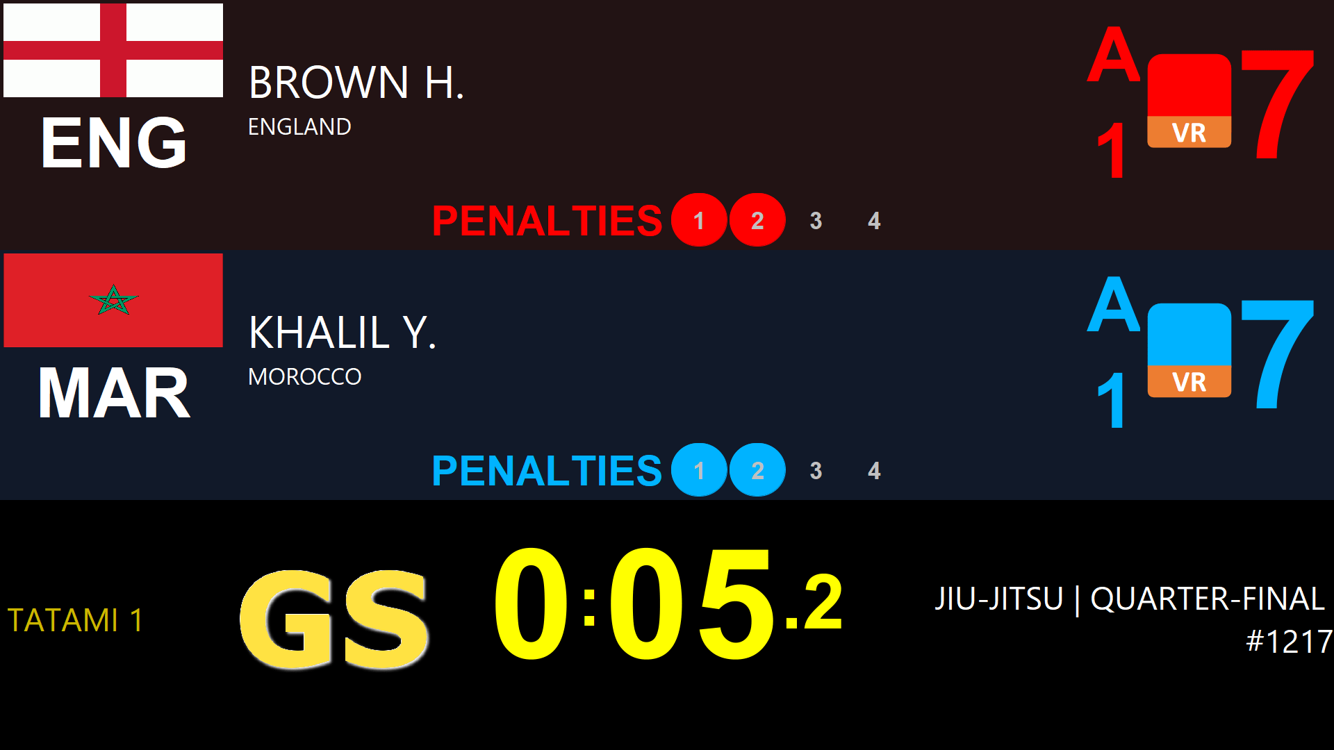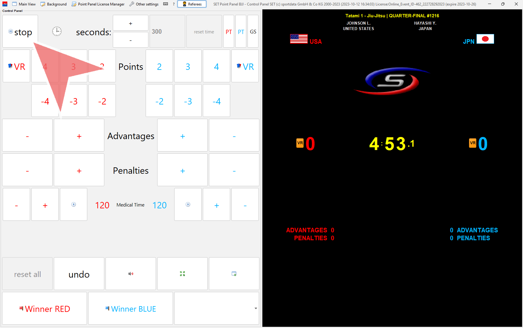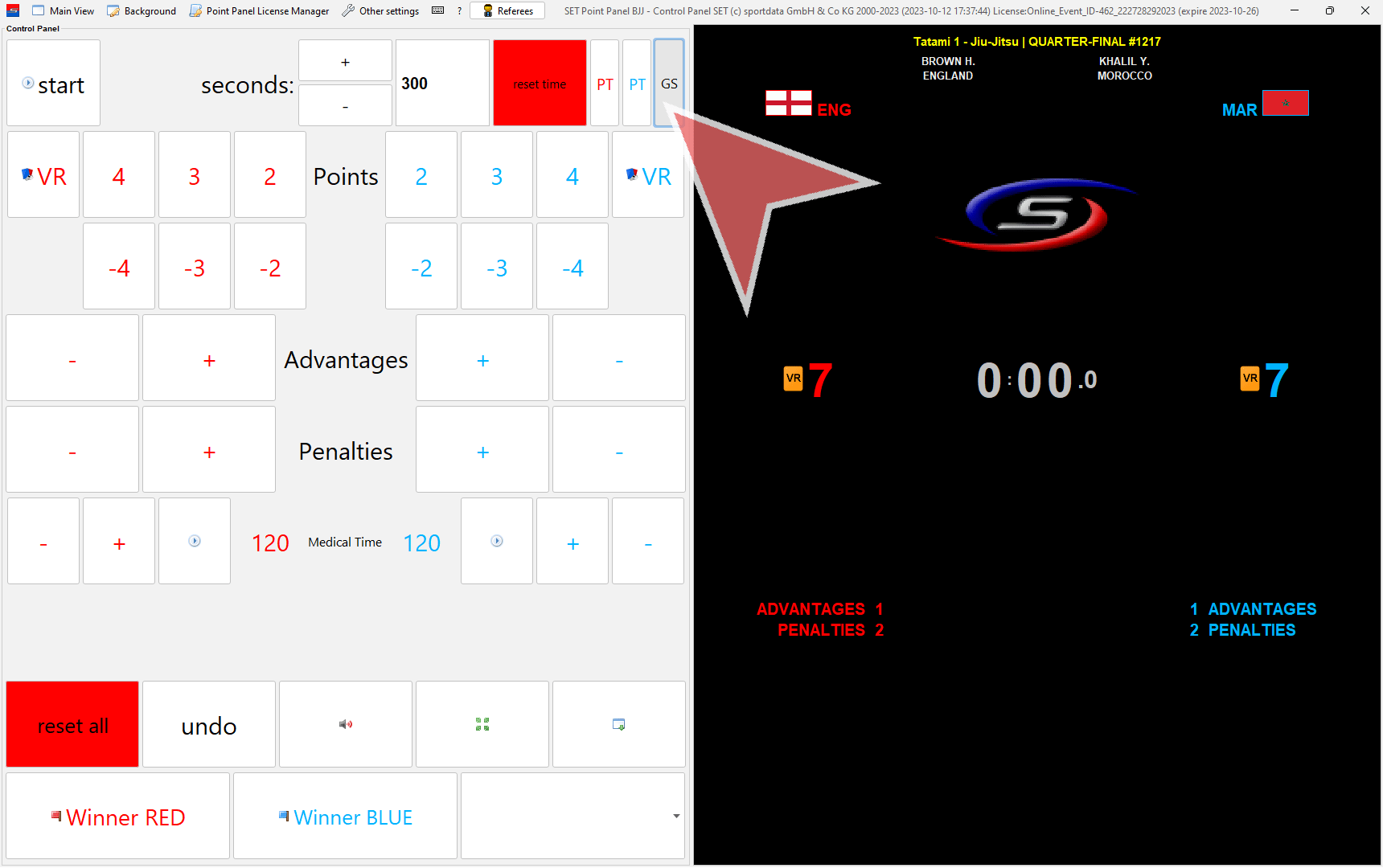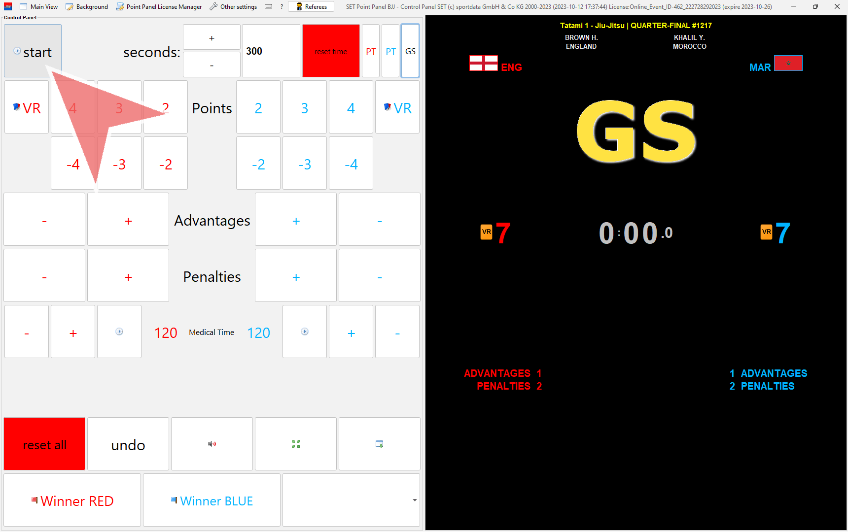 A golden “GS” on the scorebaord an the screens indicates the Golden Score phase. Click on “start” to start the time. Once a winner is determinded, stop the time and select the wintype and winner manually.