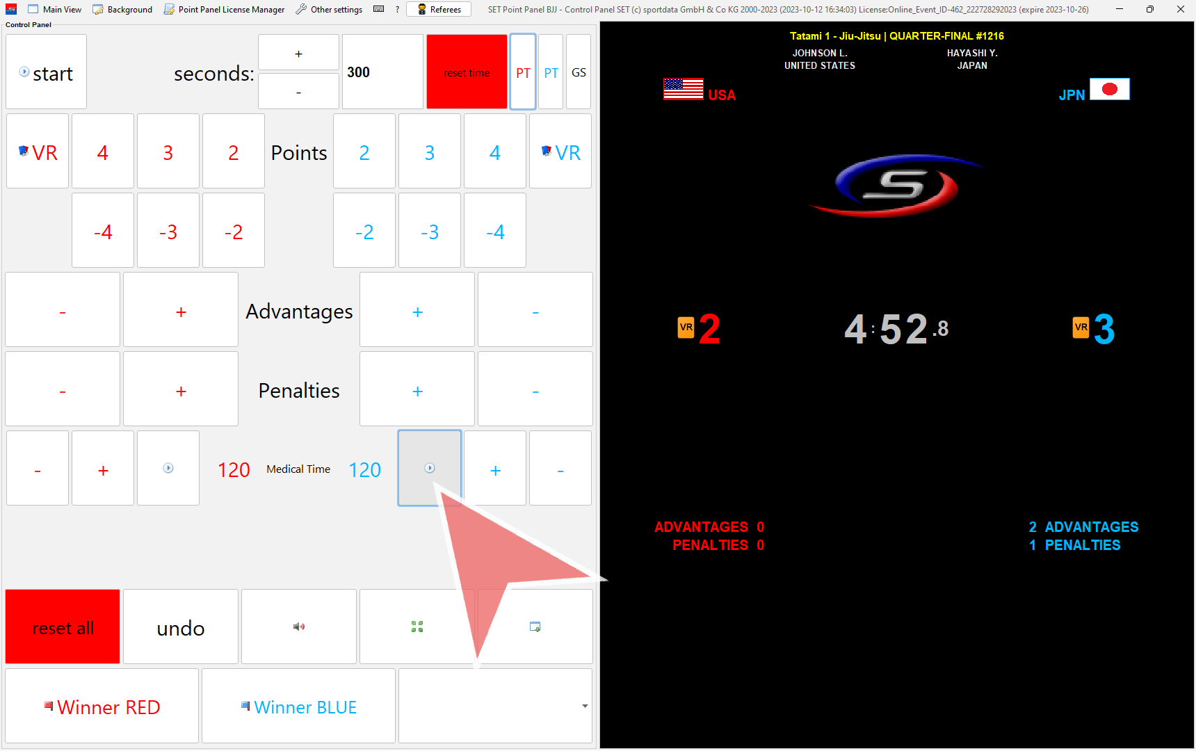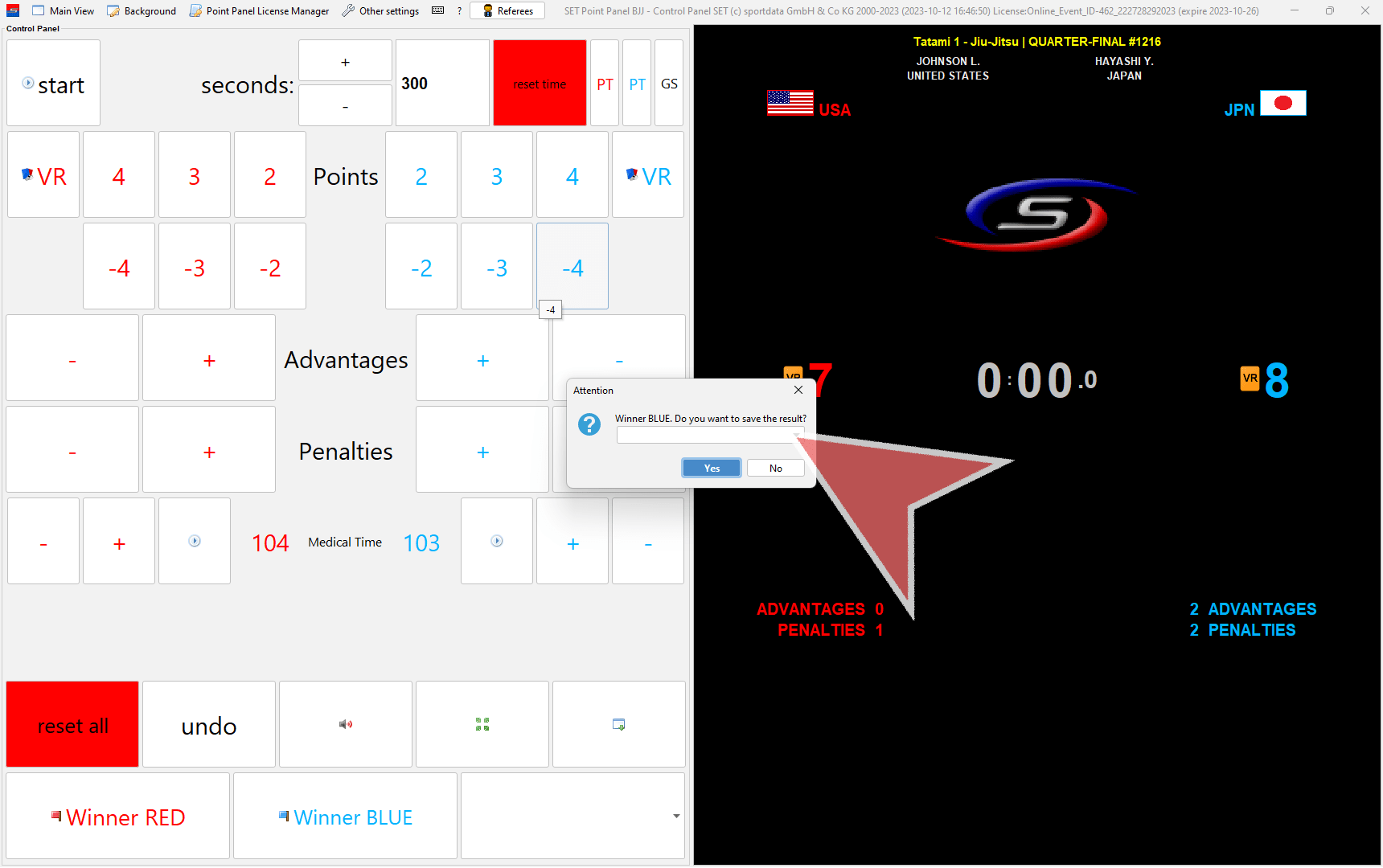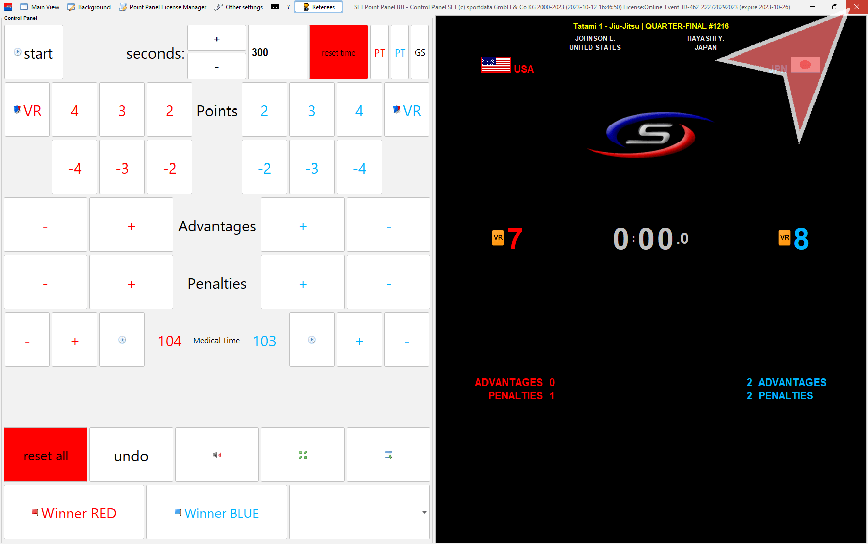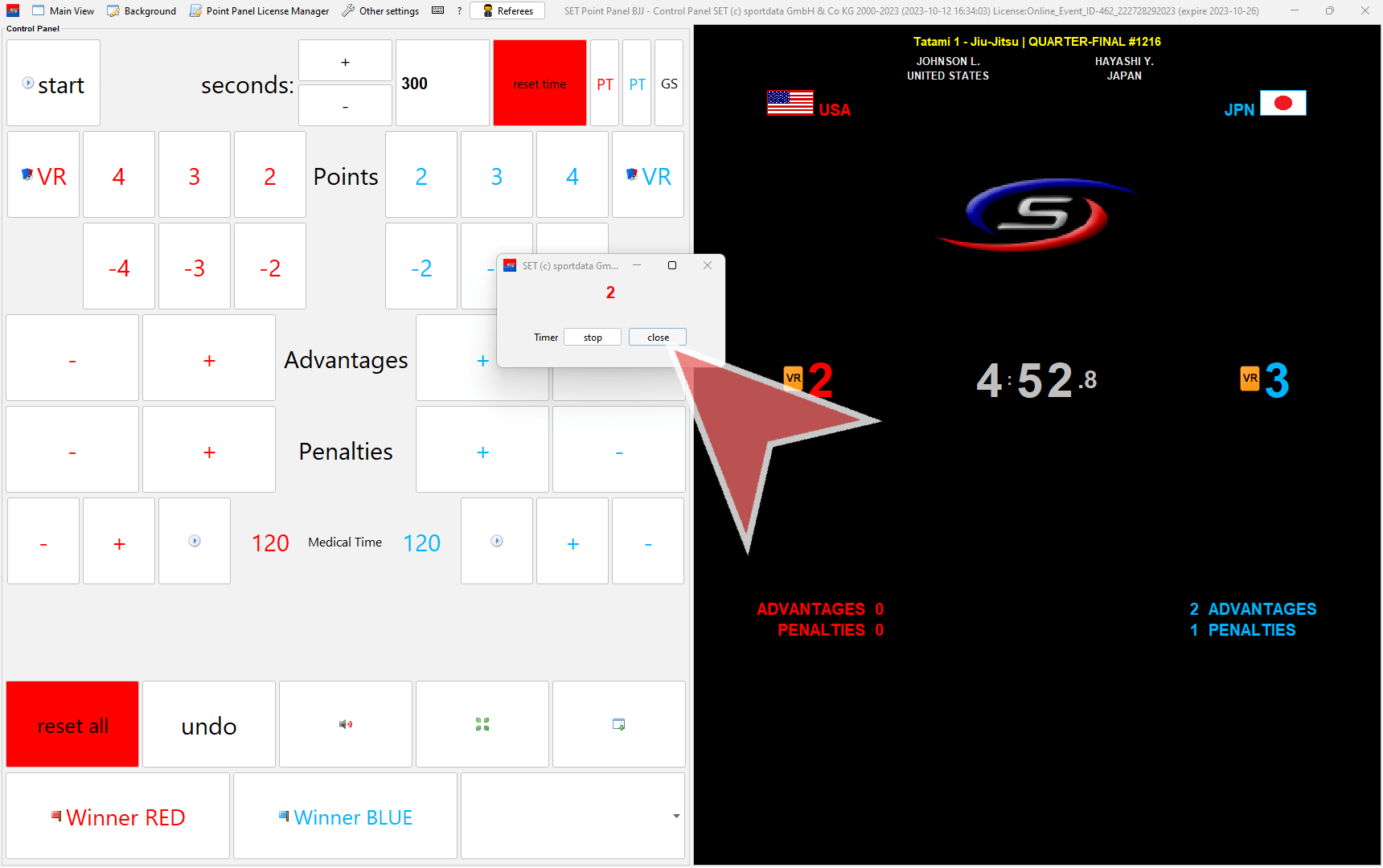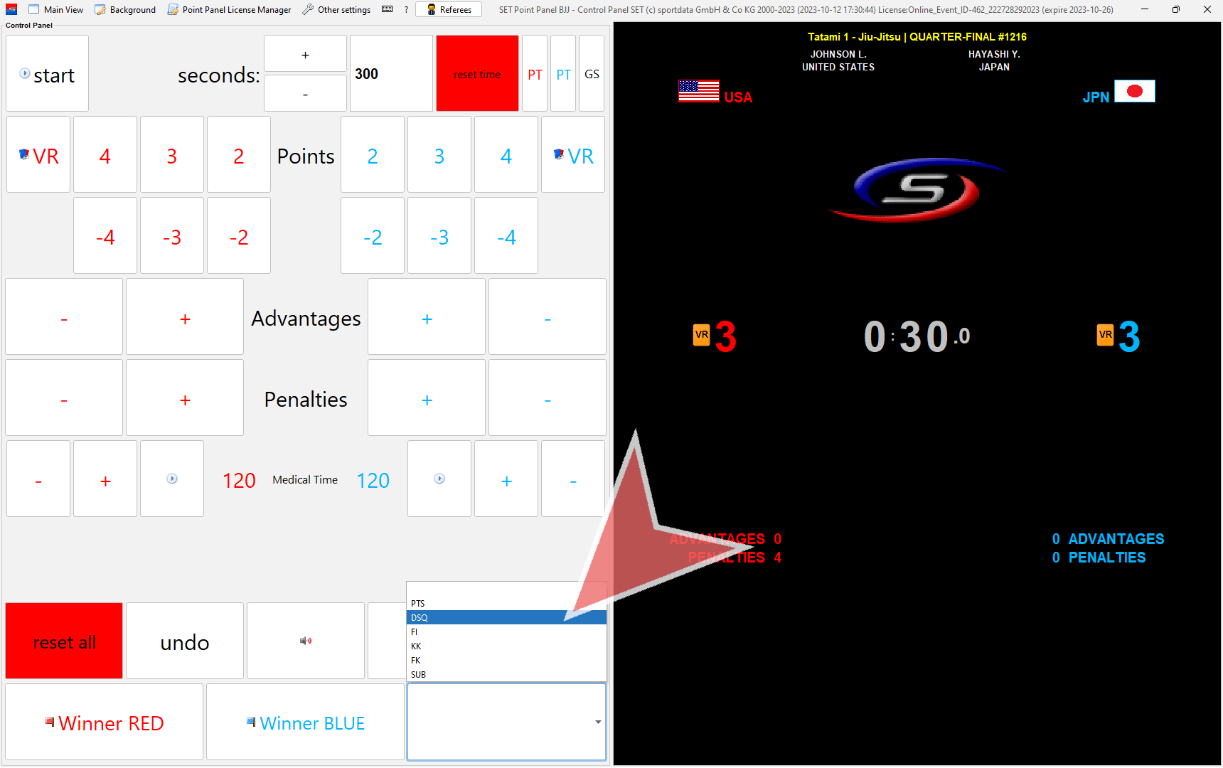 A golden “GS” on the scorebaord an the screens indicates the Golden Score phase. Click on “start” to start the time. Once a winner is determinded, stop the time and select the wintype and winner manually.