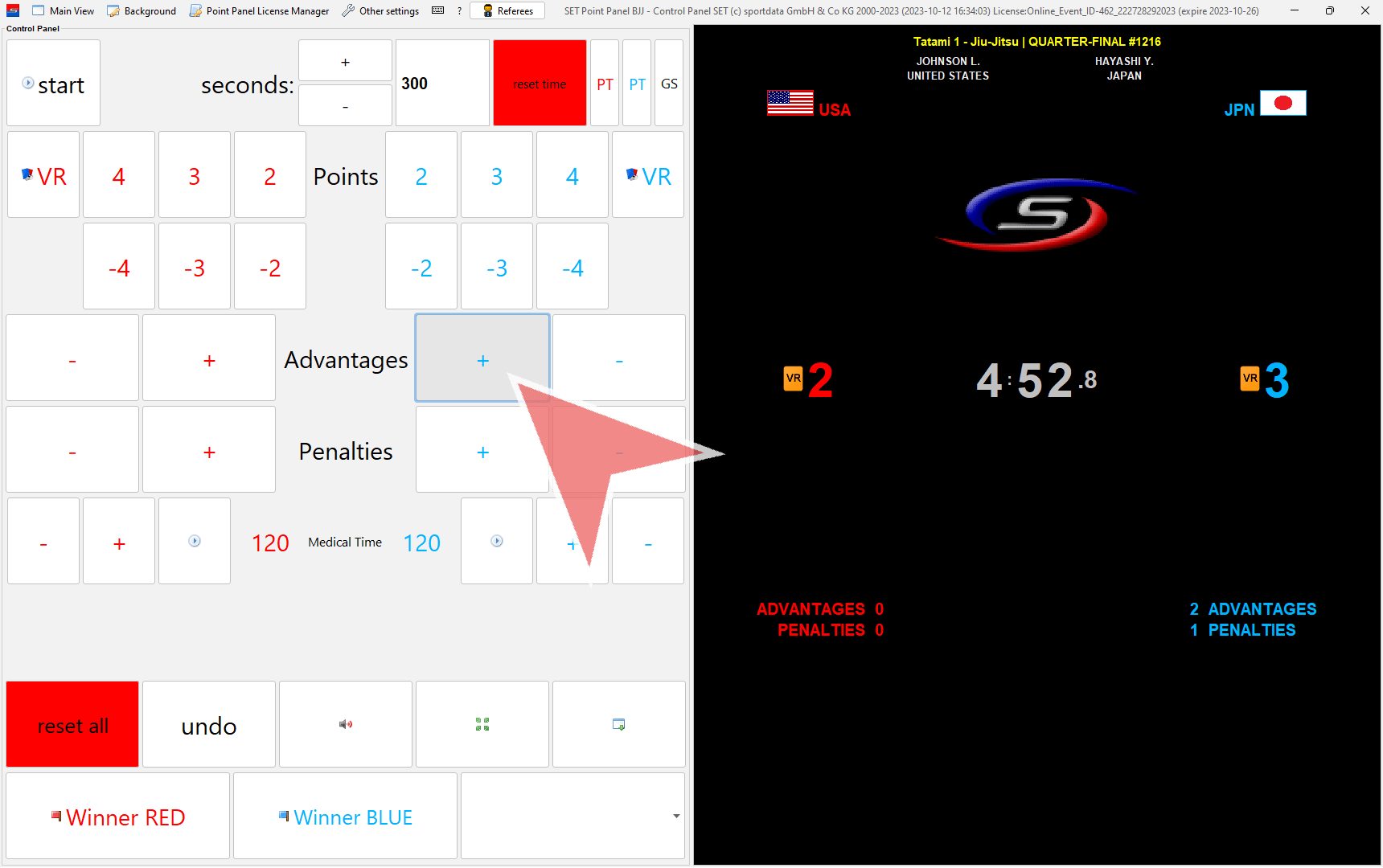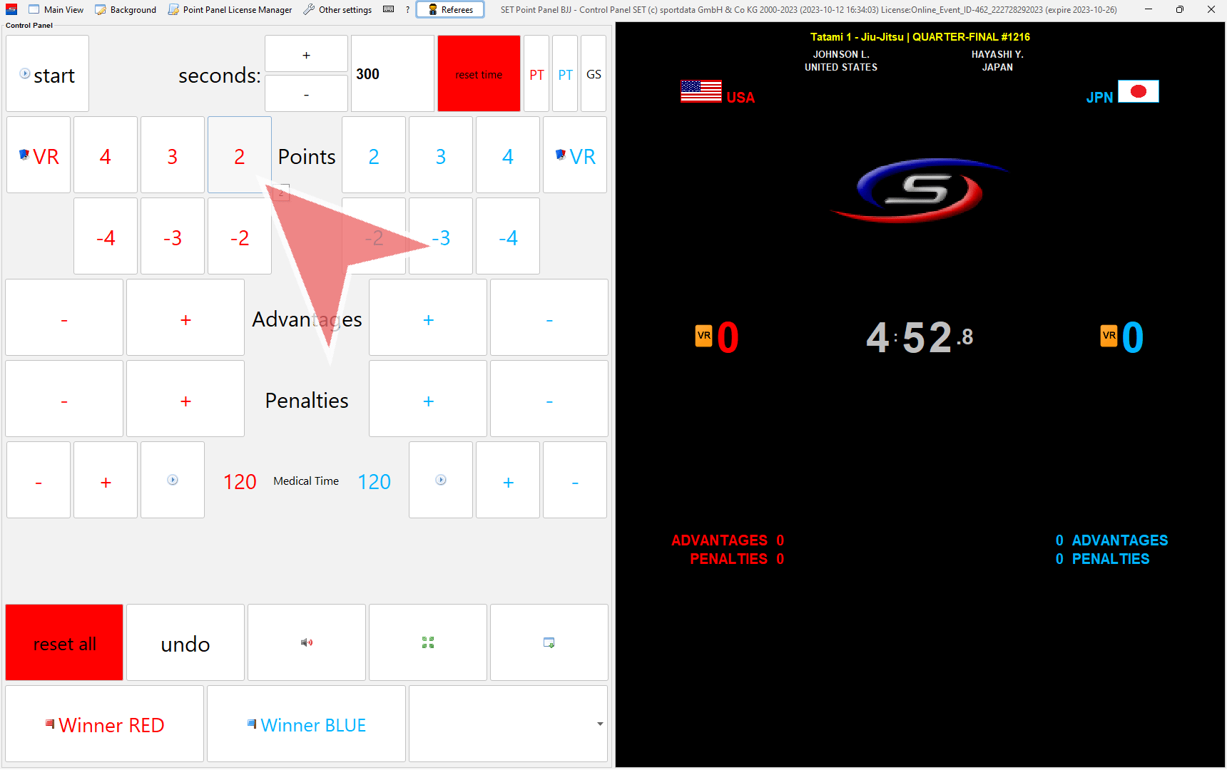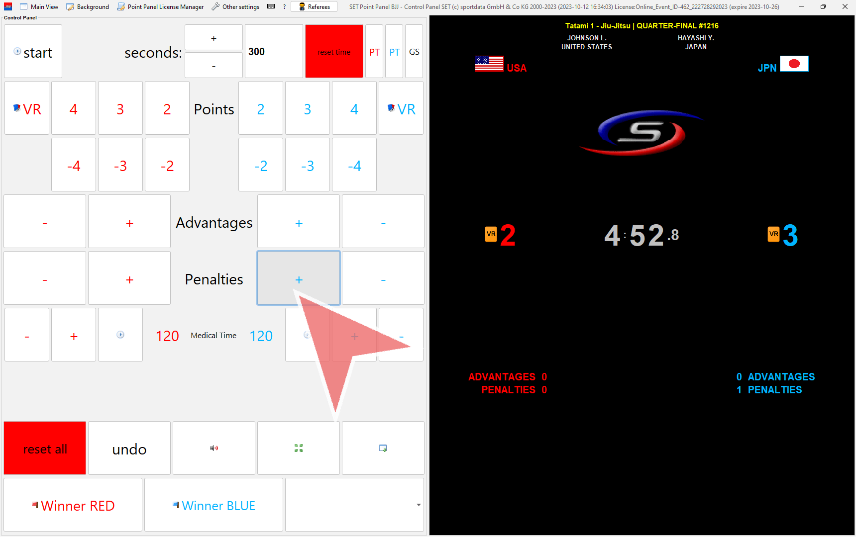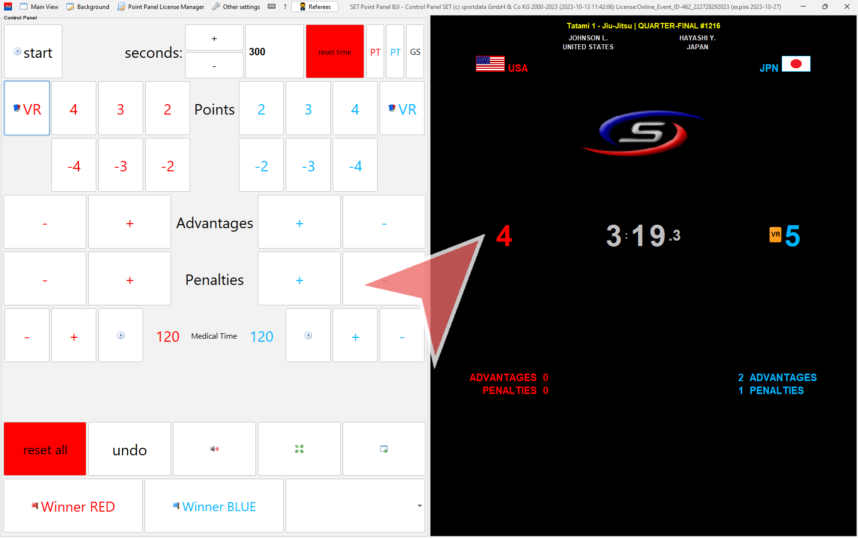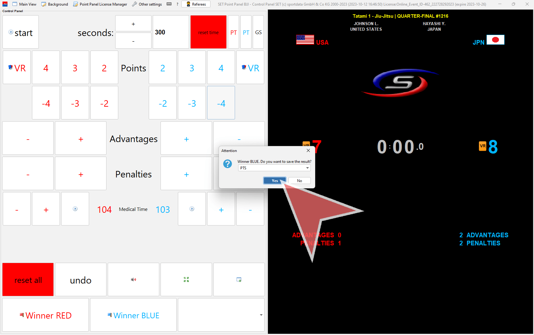 A golden “GS” on the scorebaord an the screens indicates the Golden Score phase. Click on “start” to start the time. Once a winner is determinded, stop the time and select the wintype and winner manually.
