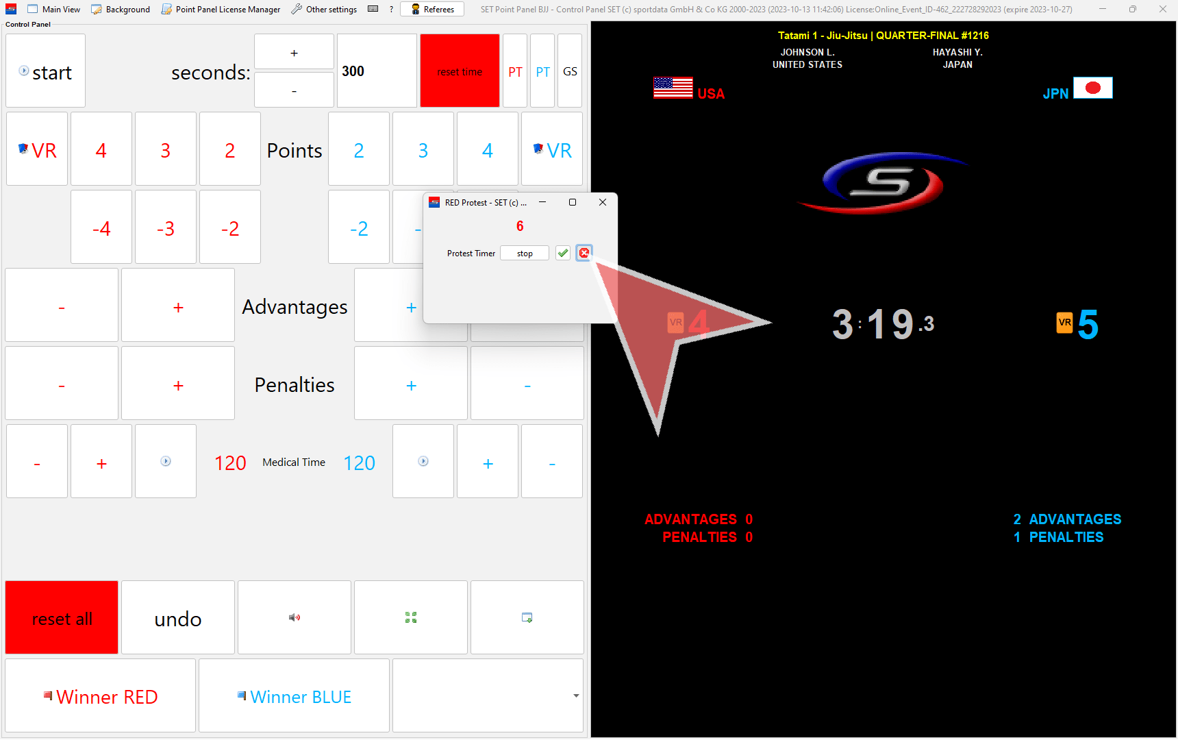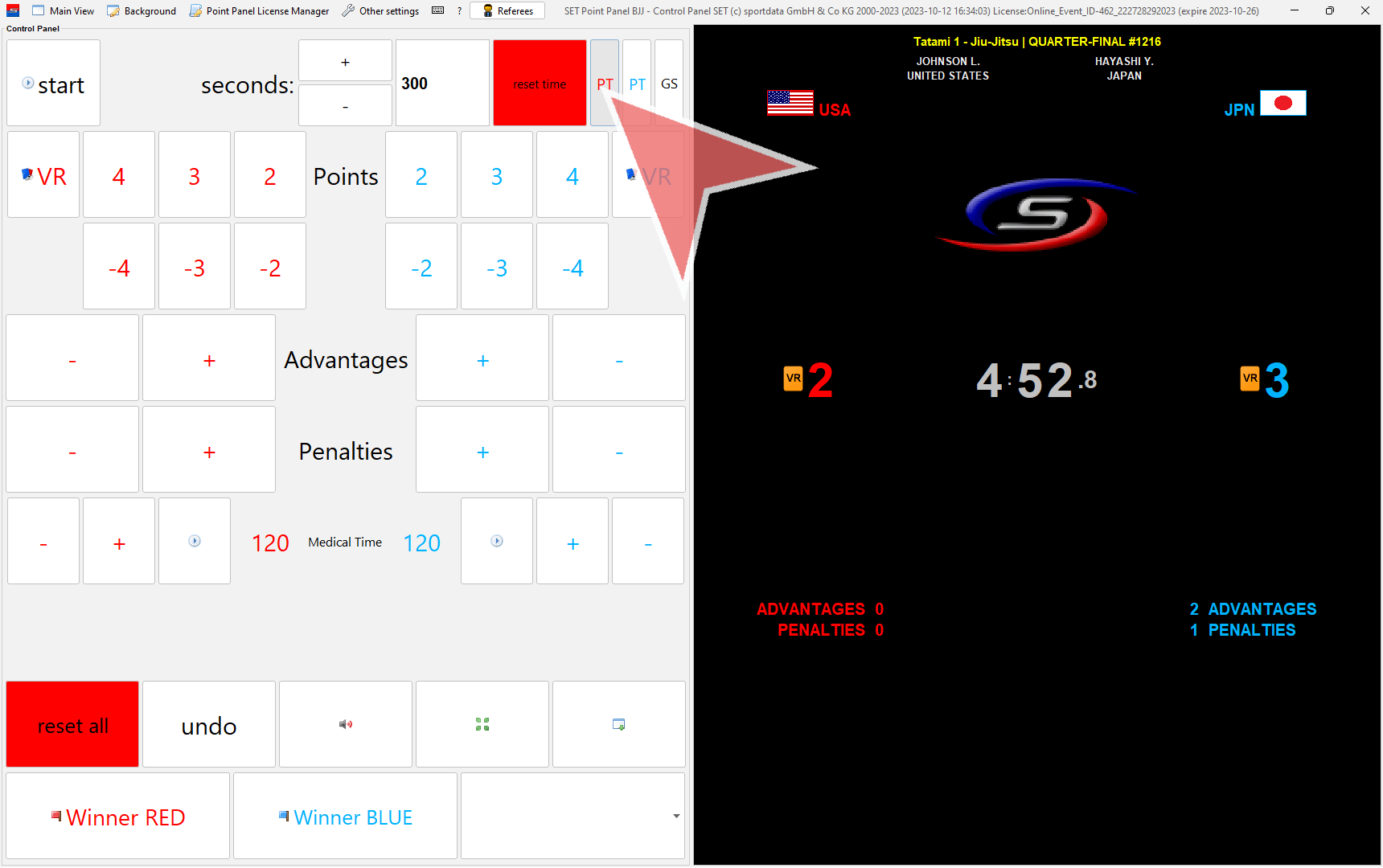 In case the referee indicated stalling (passivity) for one or both of the competitors, click on “PT” in the according color and a 10 seconds timer starts automatically.