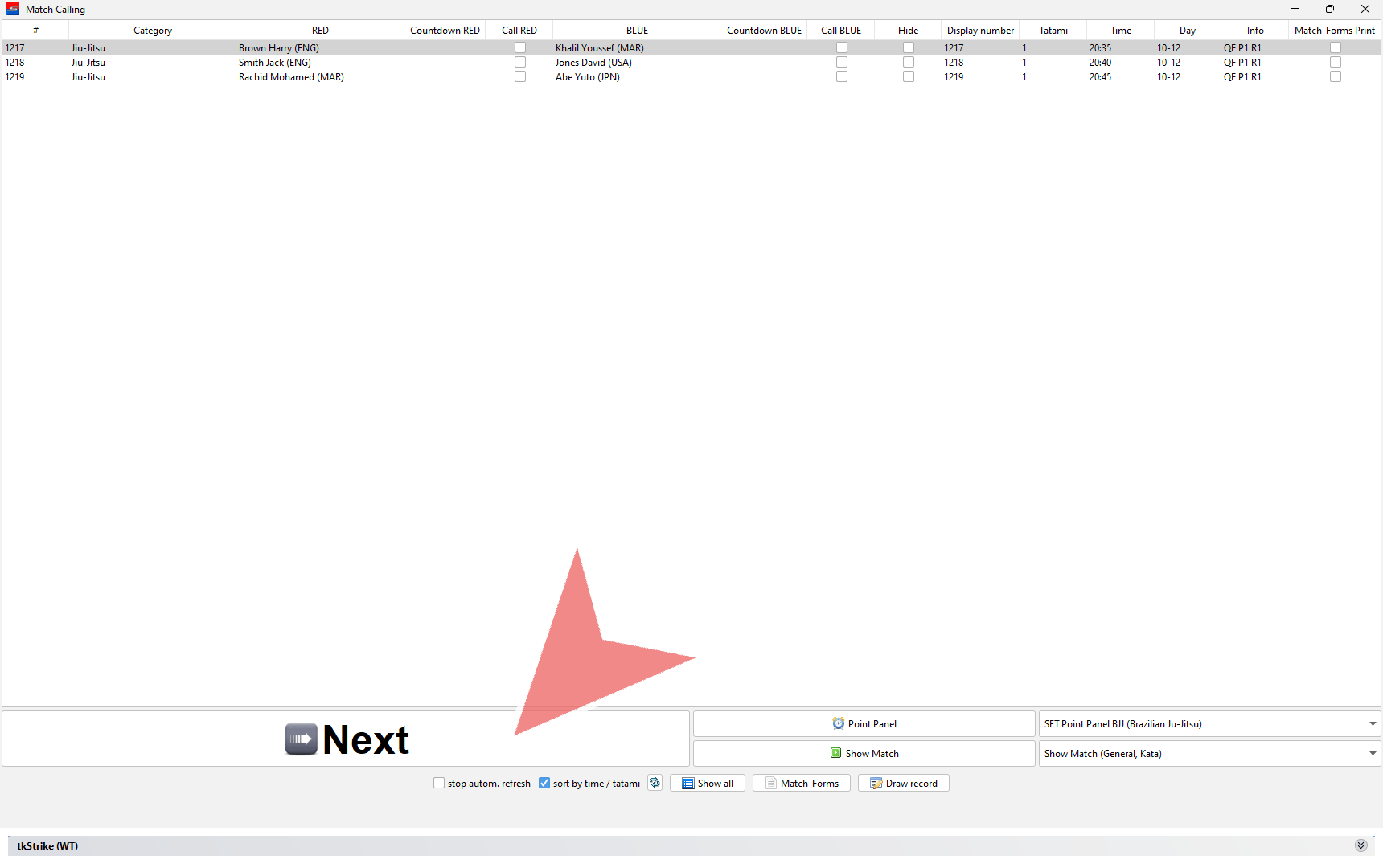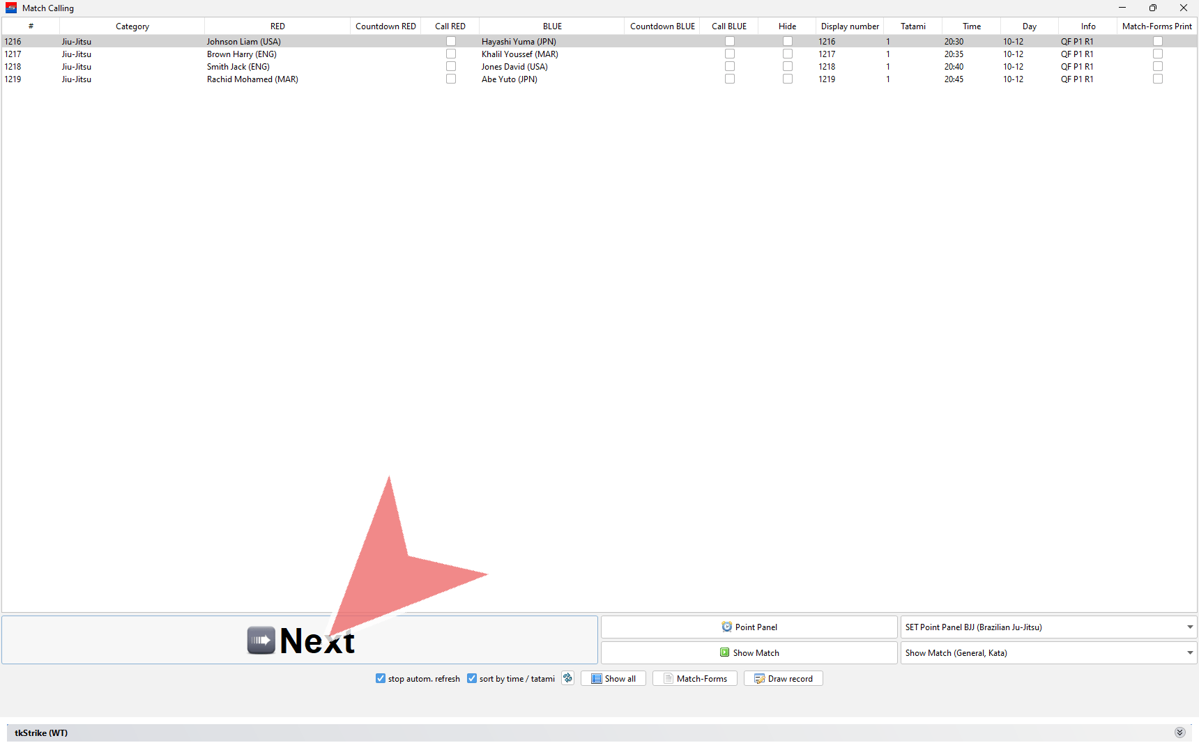 You find the order of all matches that are scheduled for your tatami in the match caller. Click on “Next” to open the next match.