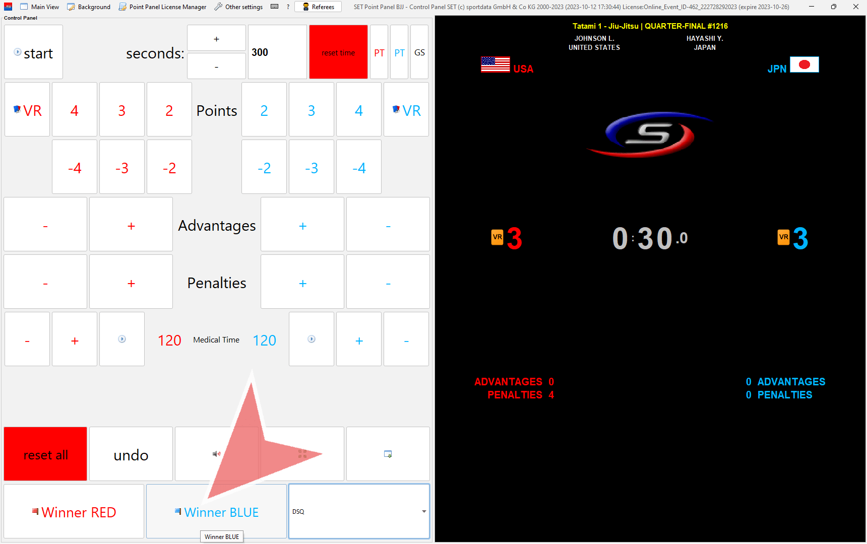 Afterwards press on “Winner RED” or “Winner BLUE” to announce the winner.