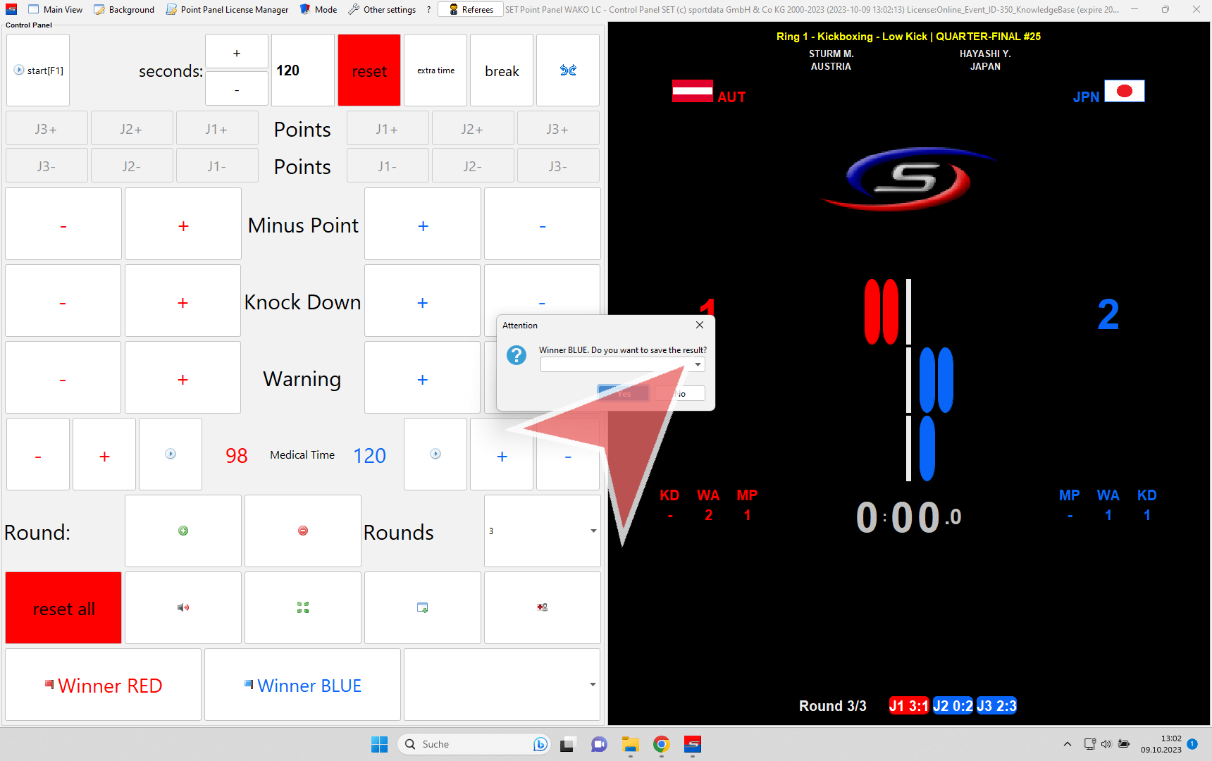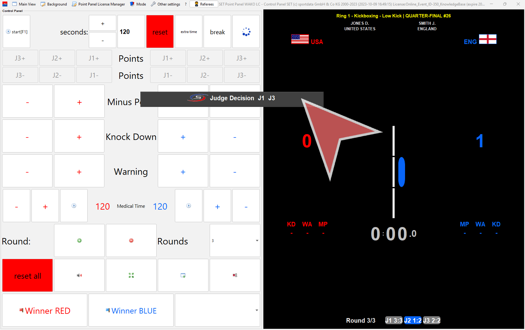 In case a judge has a tie after the 3rd round, the points given in the last round are considered. In case this is equal as well, he automatically shows up to do a judge decision (decide if red or blue was better). After the judge decided with his electronic scoring device, the pop up disappears, the score of the winner starts blinking and the winner can be selected.