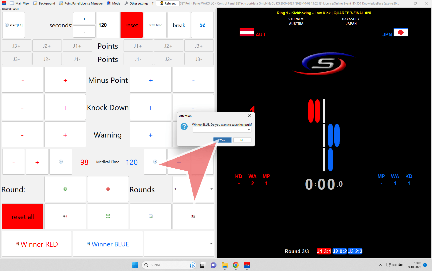 Once the winner is determined after the 3rd round or due to other reasons (e.g. opponent received 4th warning) the score of the winner starts blinking and a pop up window to confirm the winner shows up.