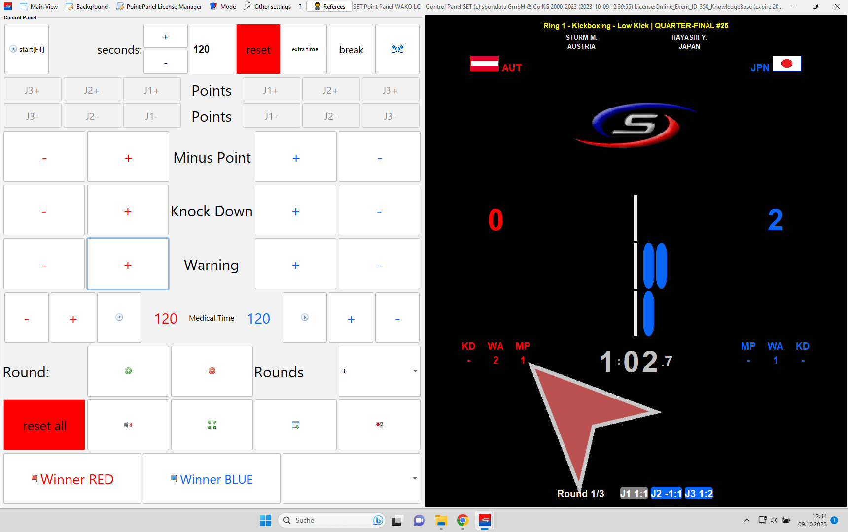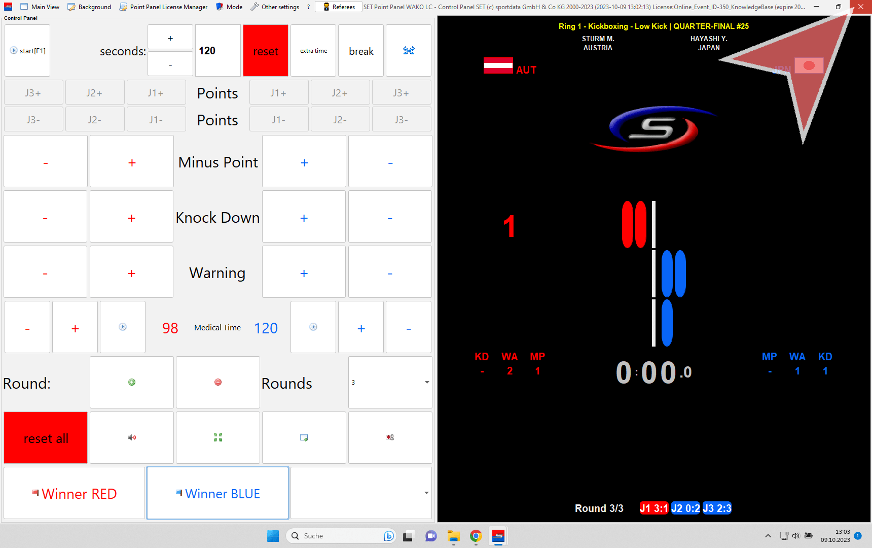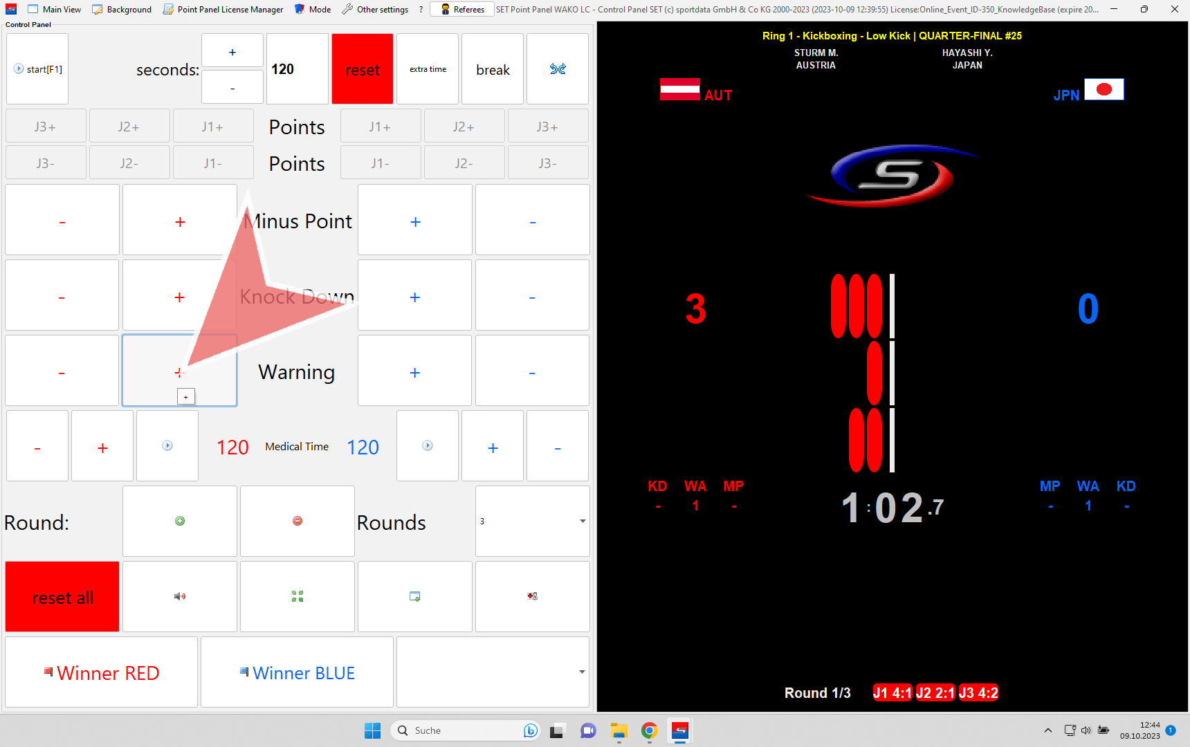 The second warning automatically gives a minus score and changes the scores accodingly (-3 Points from each judge). In case the referee gives a direct minus point, use the “plus”-button next to “Minus Point”.