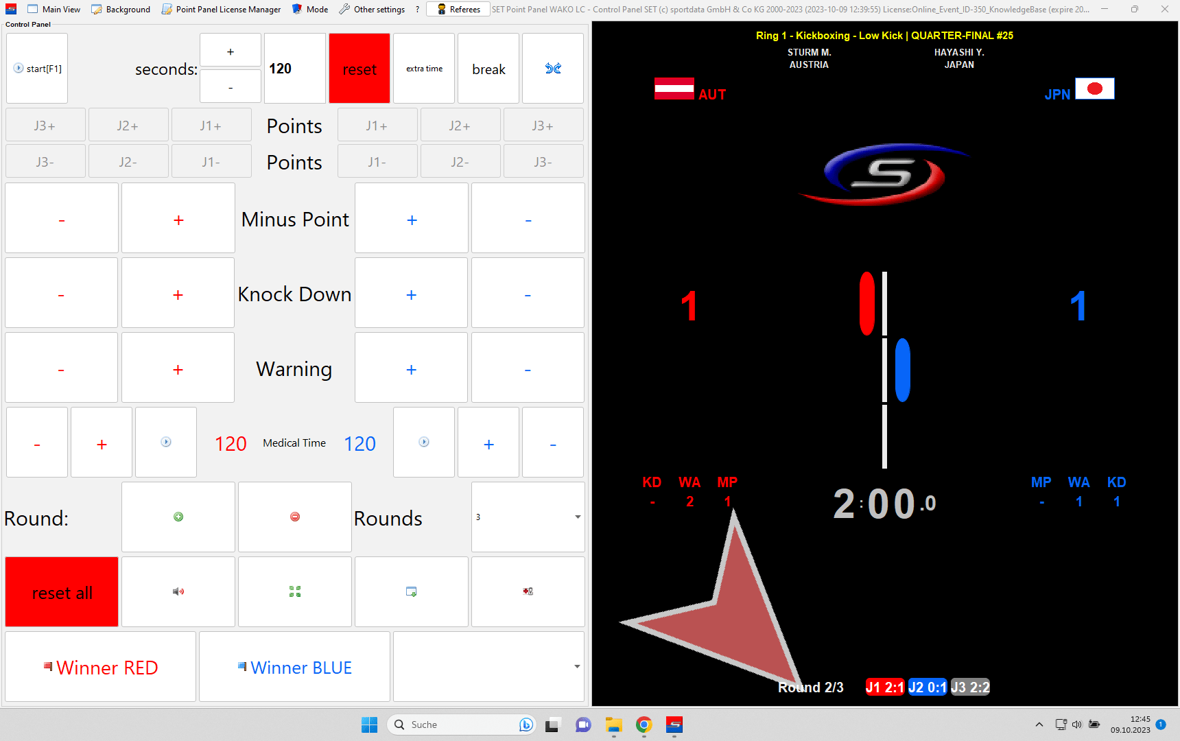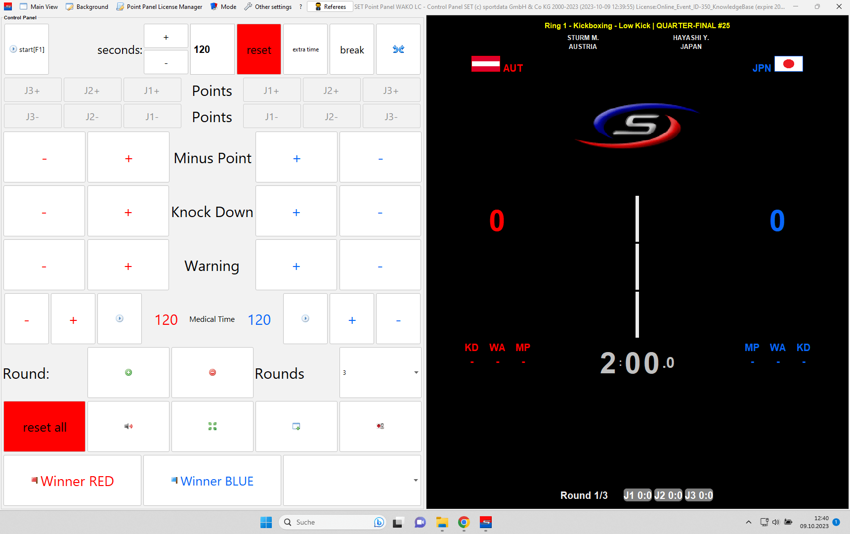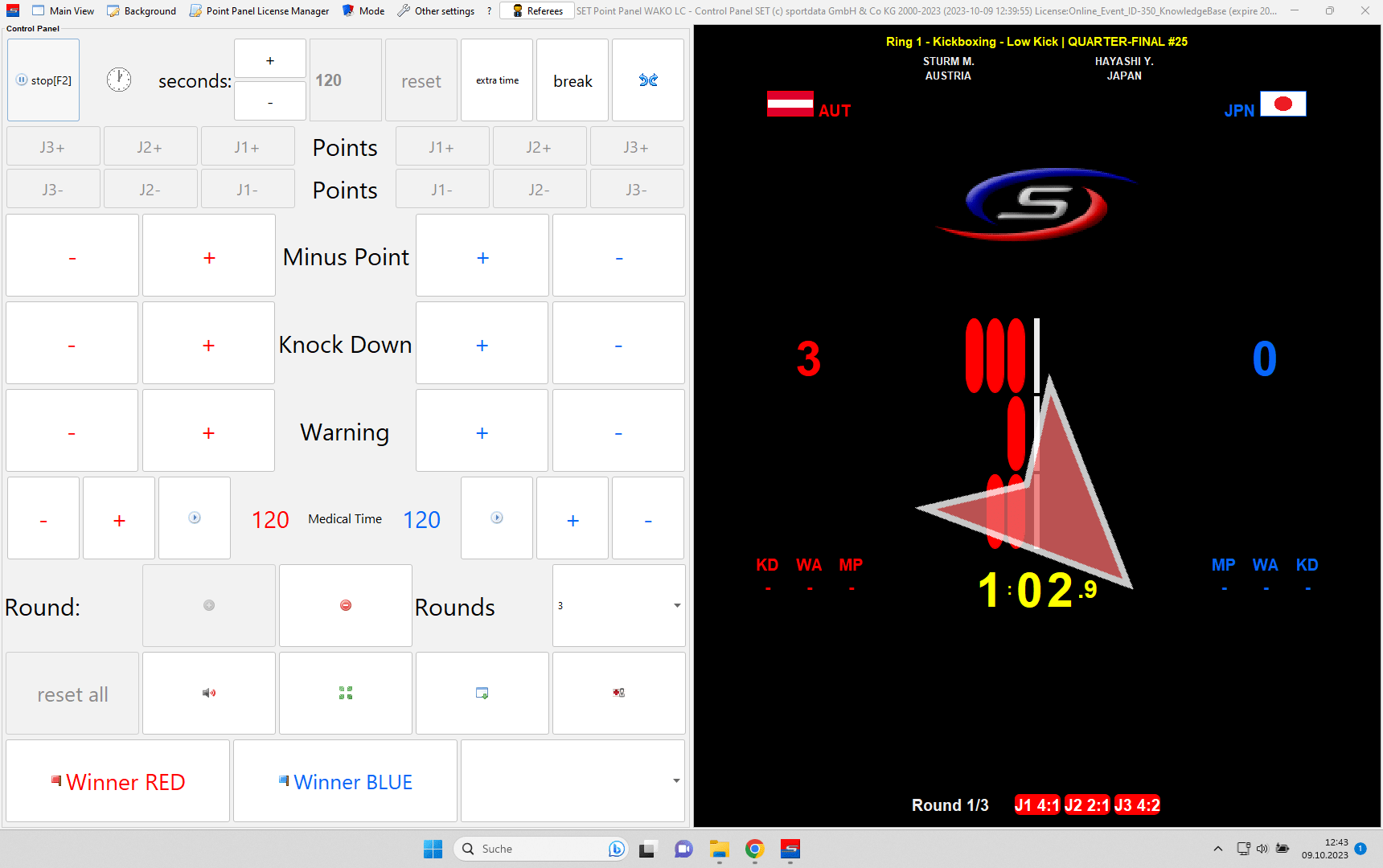 The second warning automatically gives a minus score and changes the scores accodingly (-3 Points from each judge). In case the referee gives a direct minus point, use the “plus”-button next to “Minus Point”.