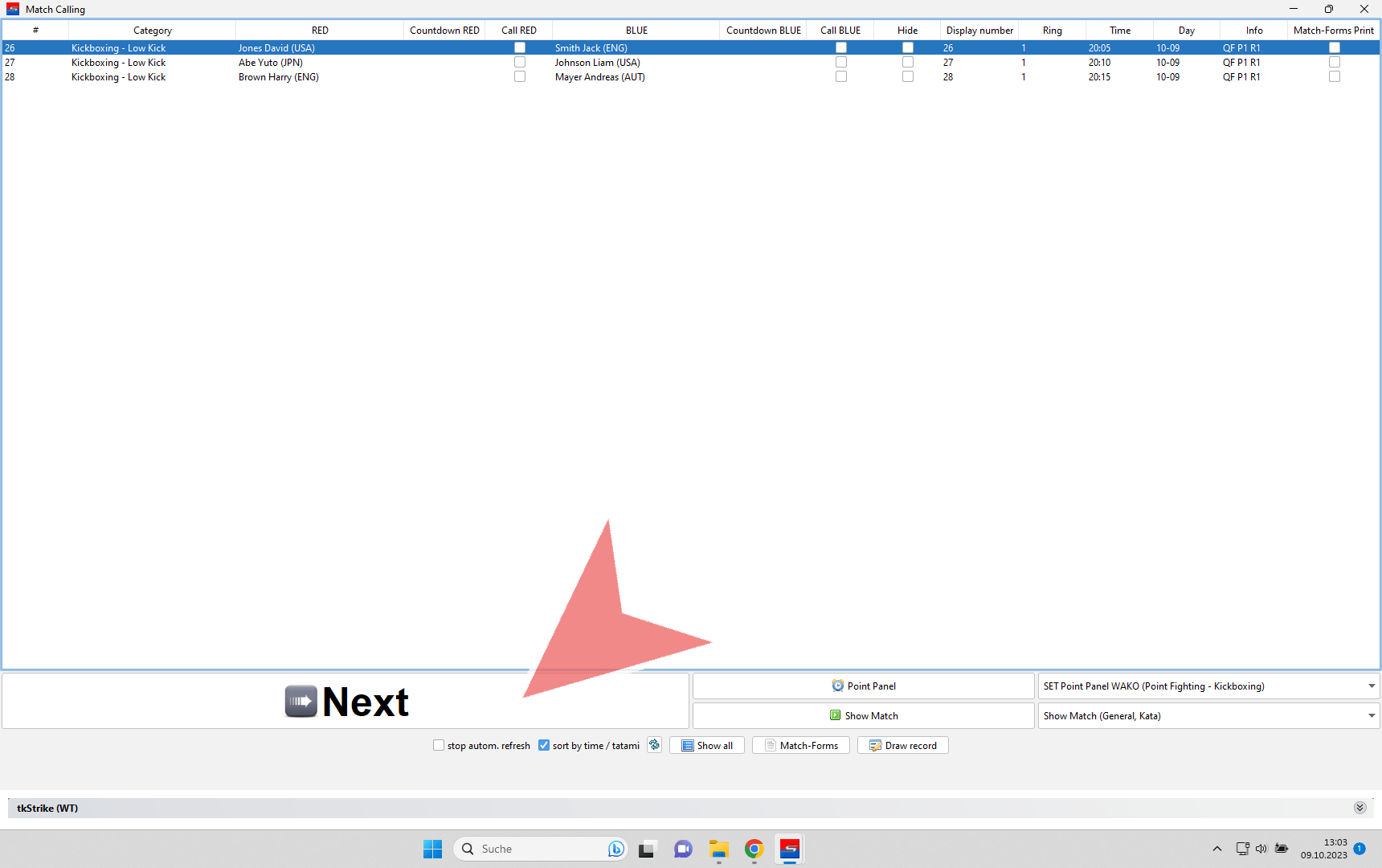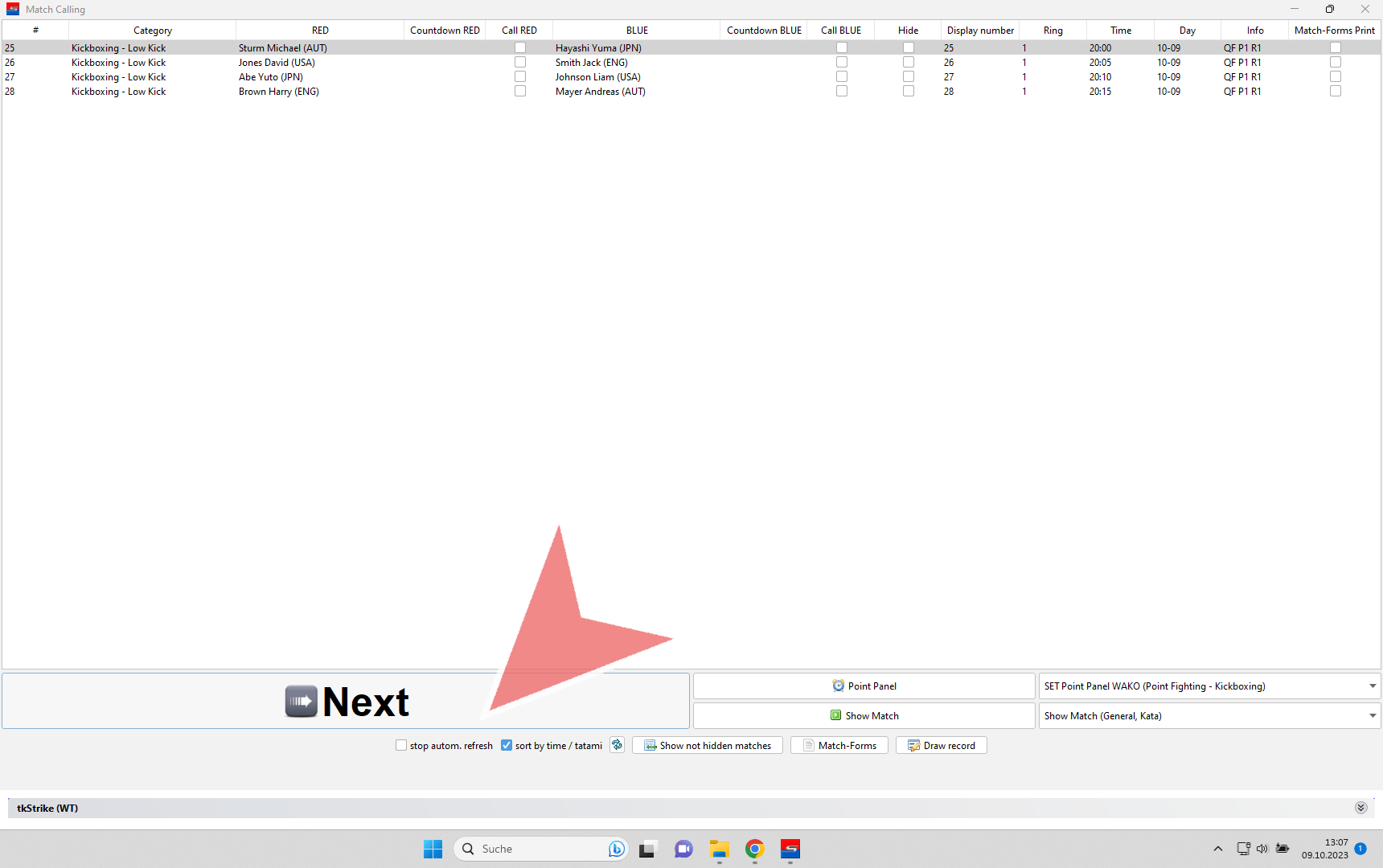 In the match caller you find all matches that are scheduled for your Ring. Click on the “Next”-button to open the next match.