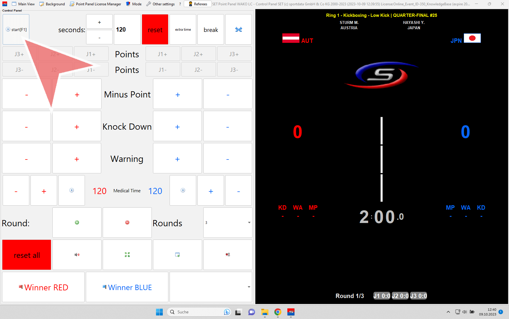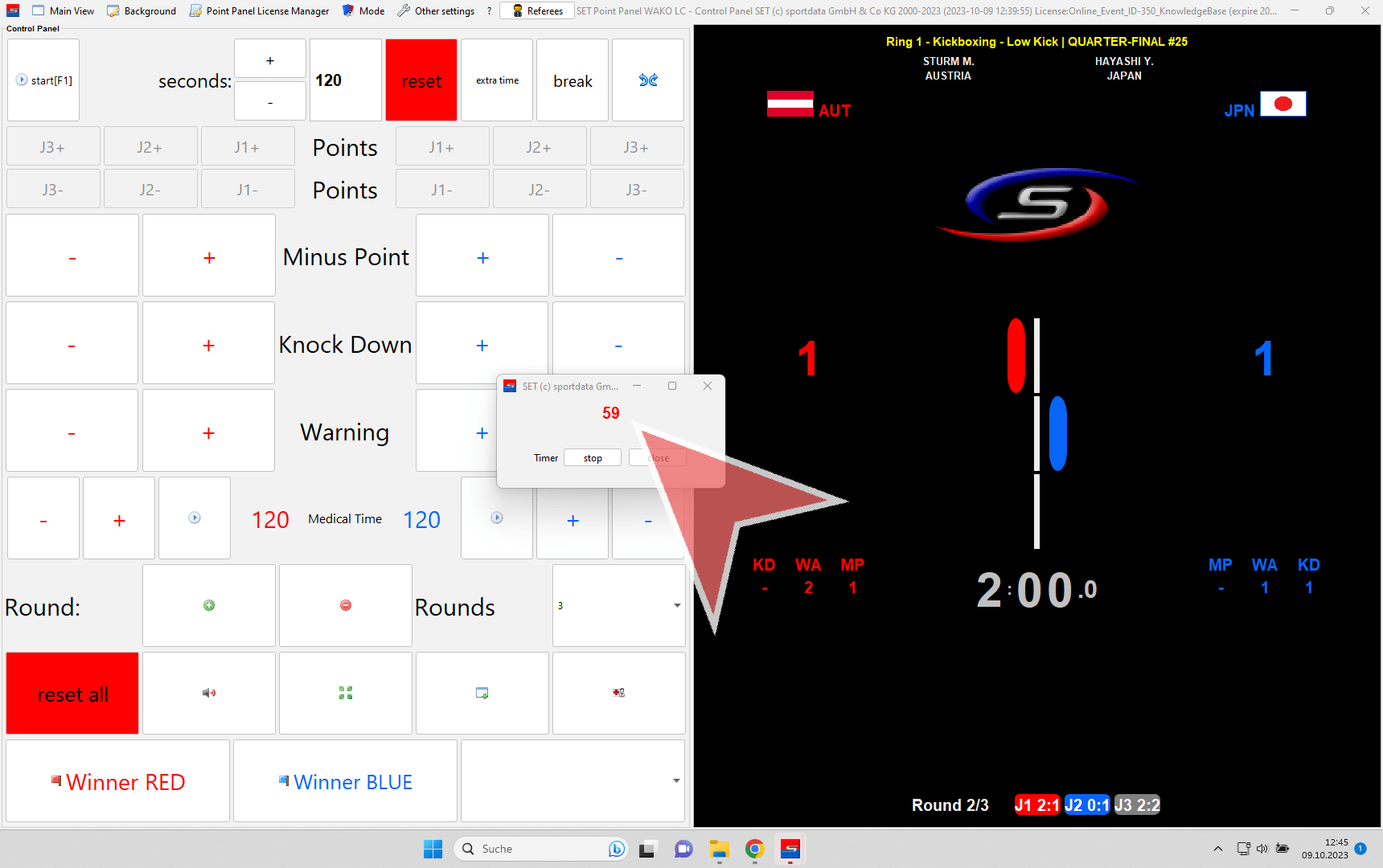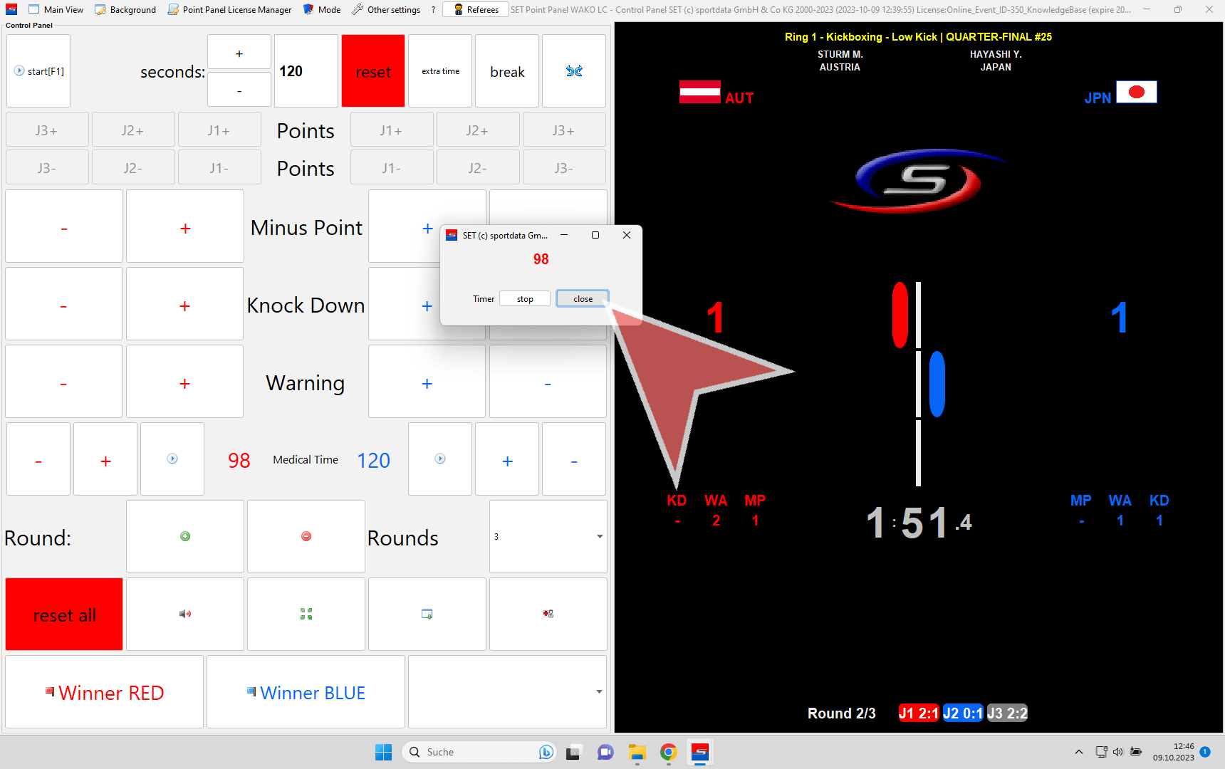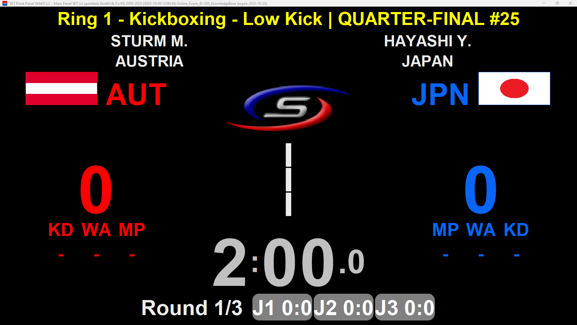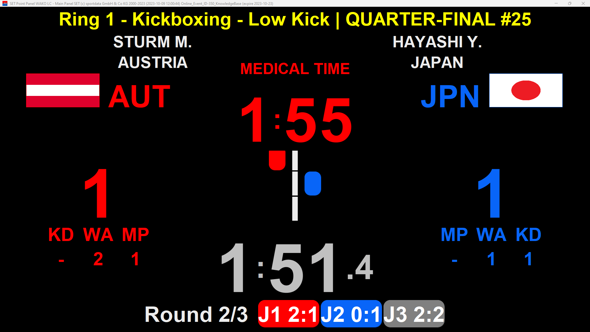 When the break is over, this window closes automatically and you can start with the next round. The current round is indicated next to the judge’s scores at the bottom.