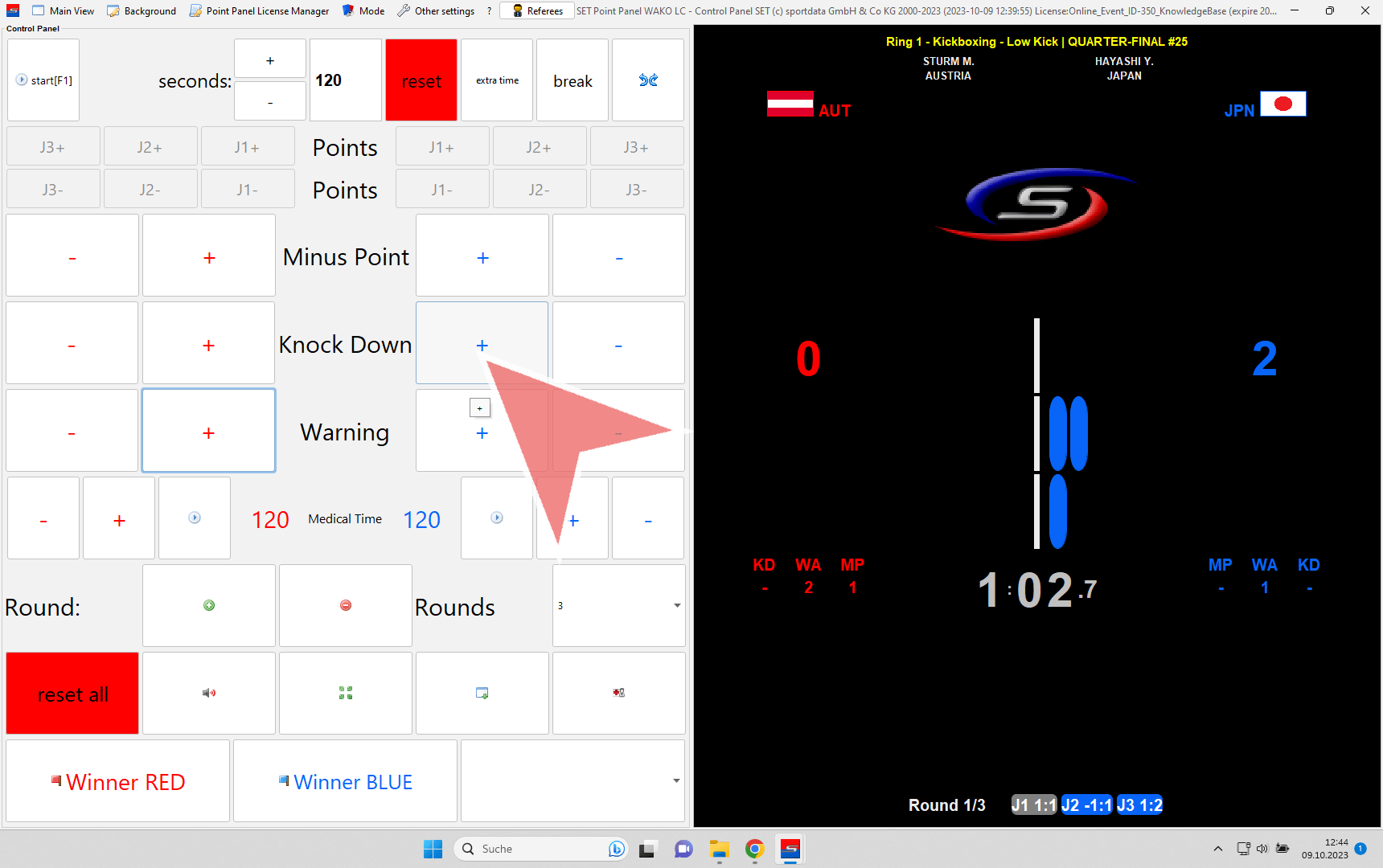 Give a Knock Down with the “plus”-buttons in the accrodings color. Adjust them with the “minus”-buttons if necessary. The scores are automatically changed accordingly (-1 point from each judge).