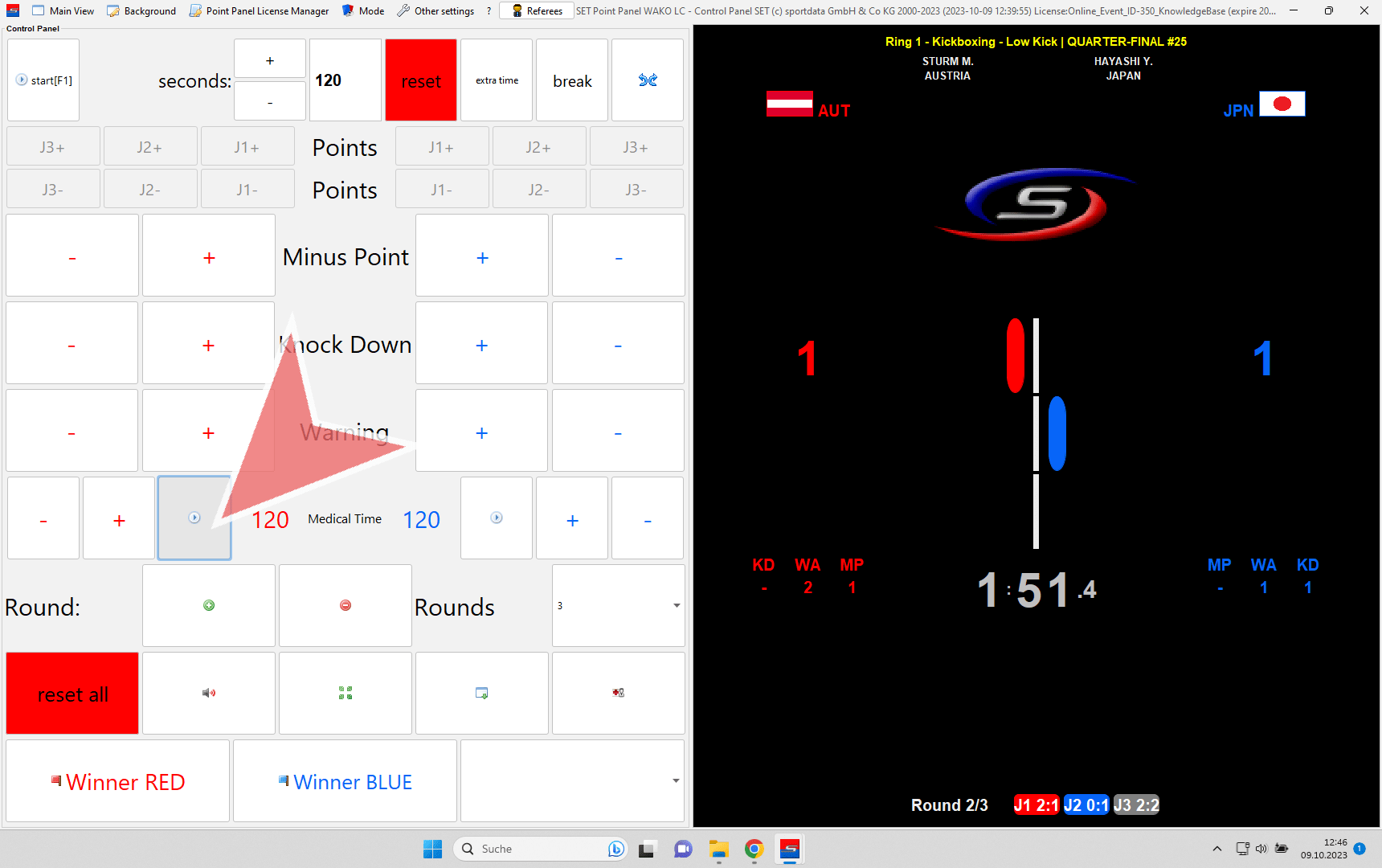 To start the medical time click on the “play”-button for red or blue. Start the medical time once the doctor is on the tatami.