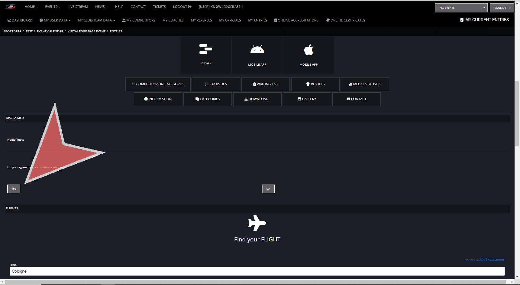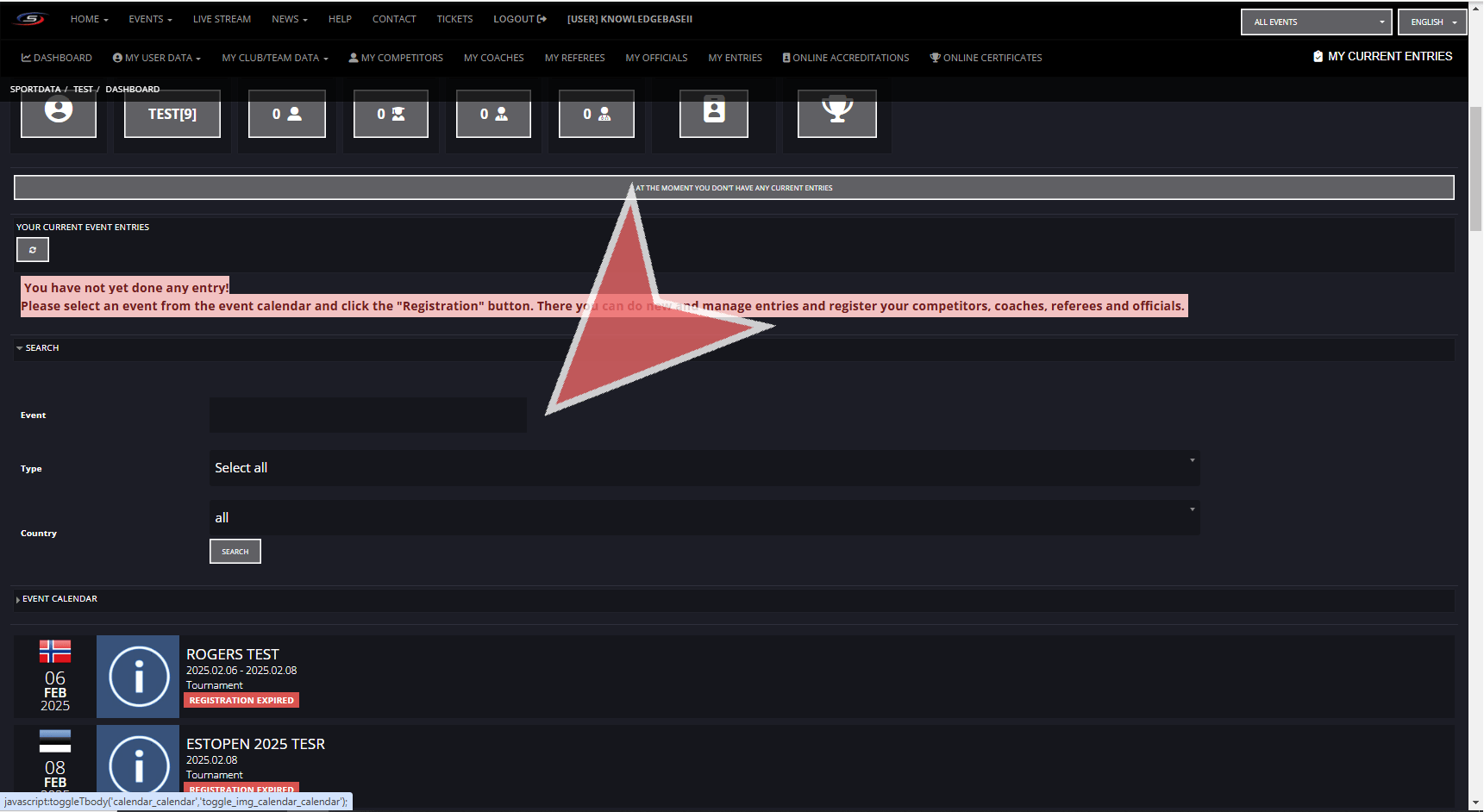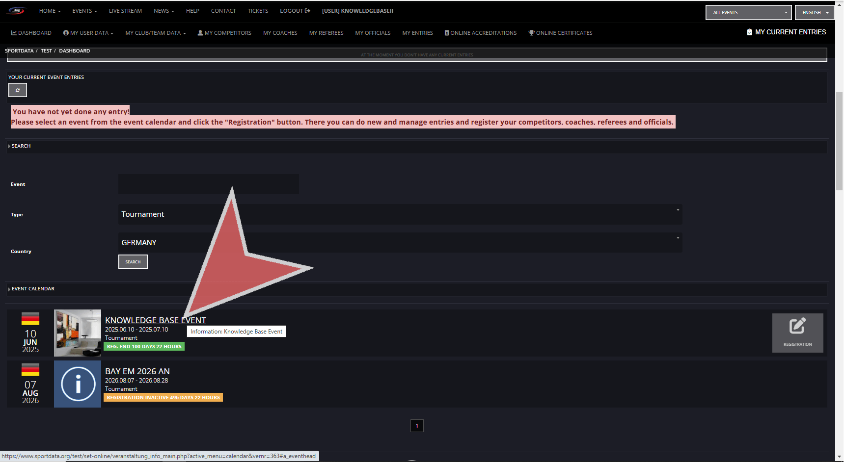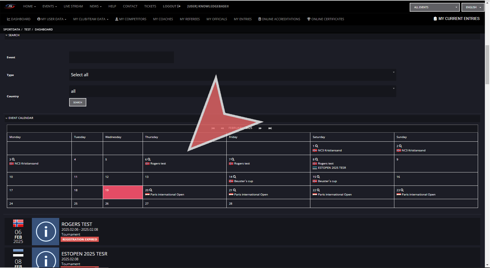 After having login in to your club account, use the search bar to find your event by filter by name, type and country.