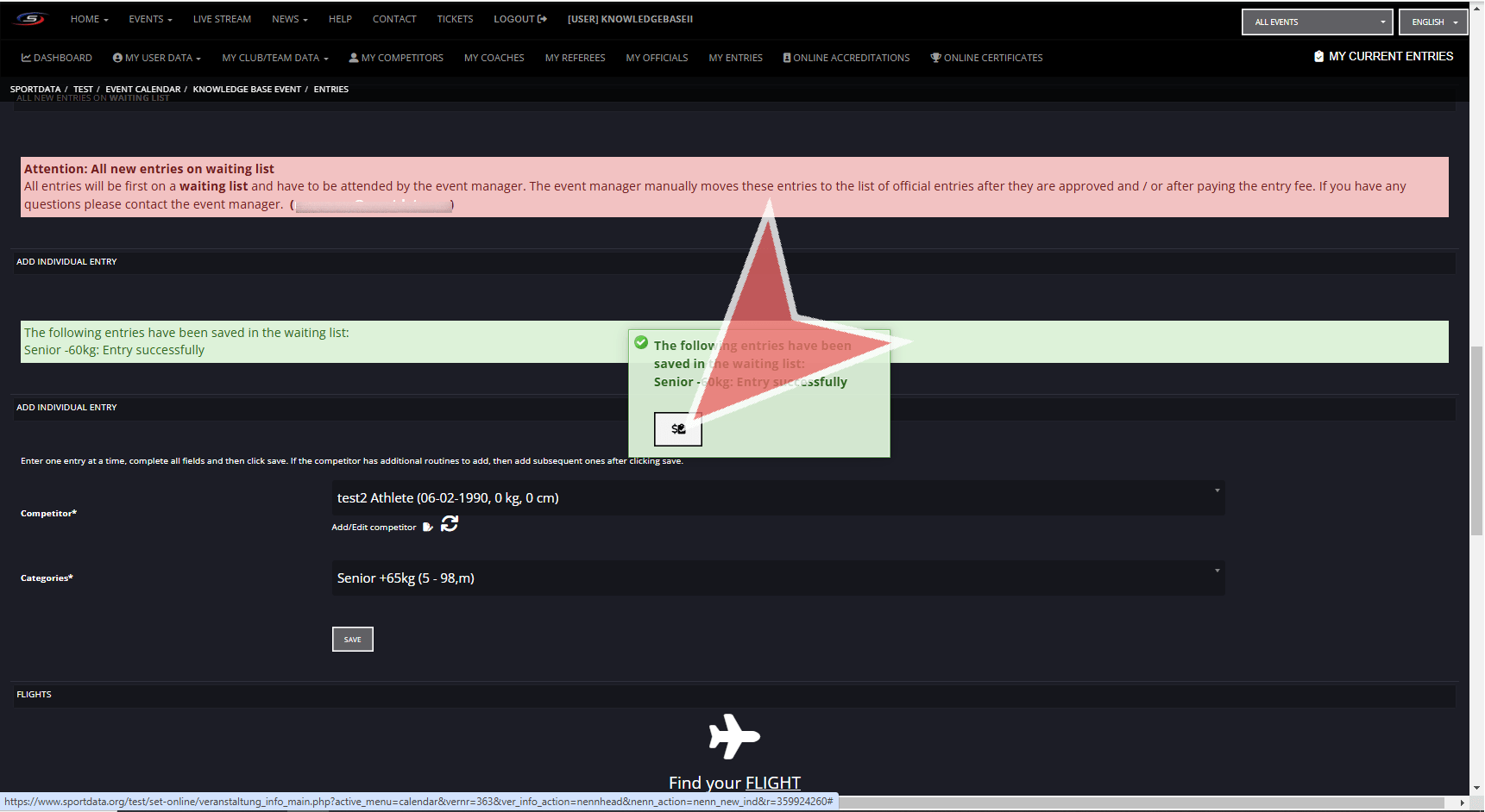 After saving the entry correctly, click on the button in the green pop up to proceed with payments. If you have more athletes to include, you can simply click the green pop up and register your next athlete.