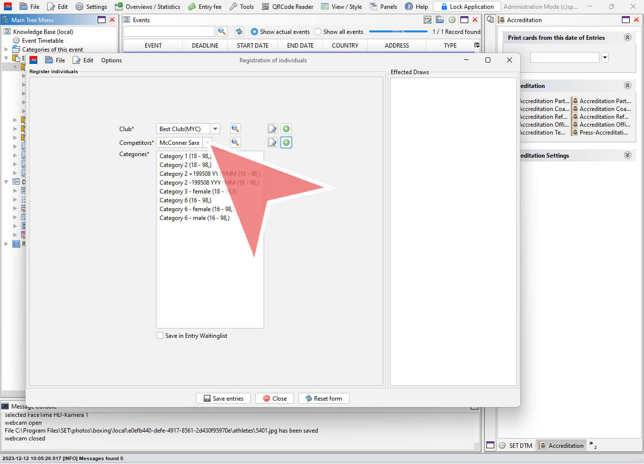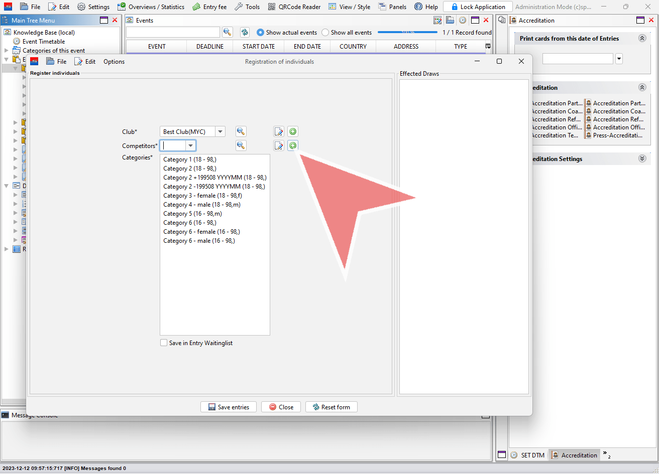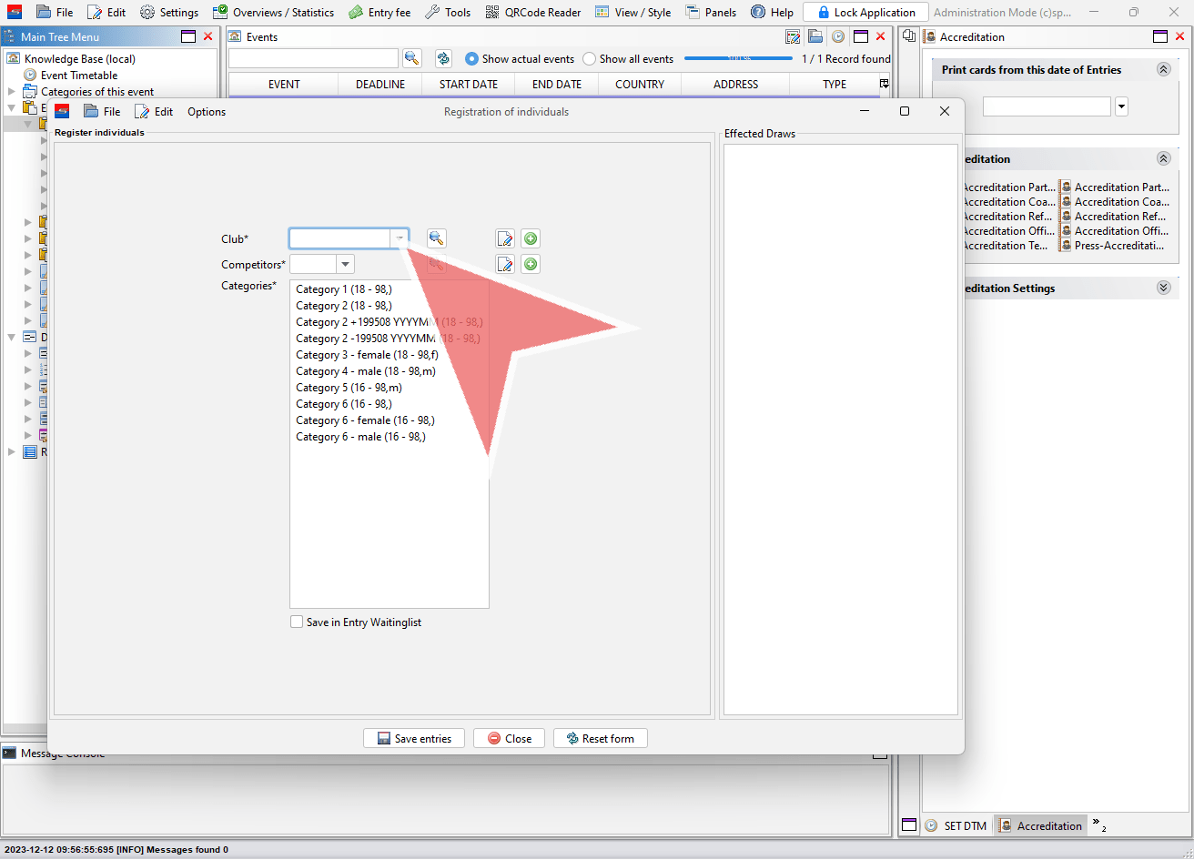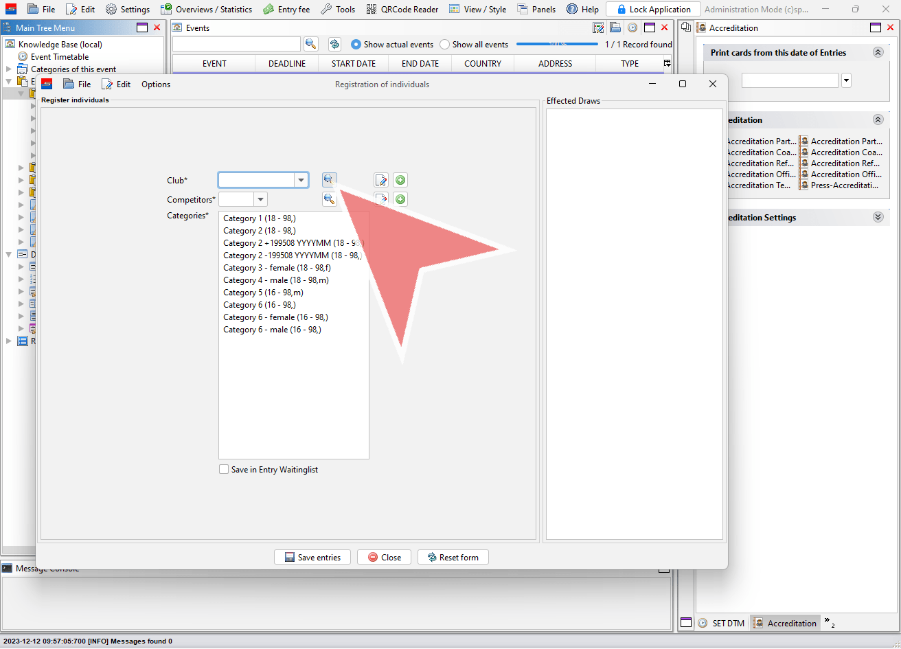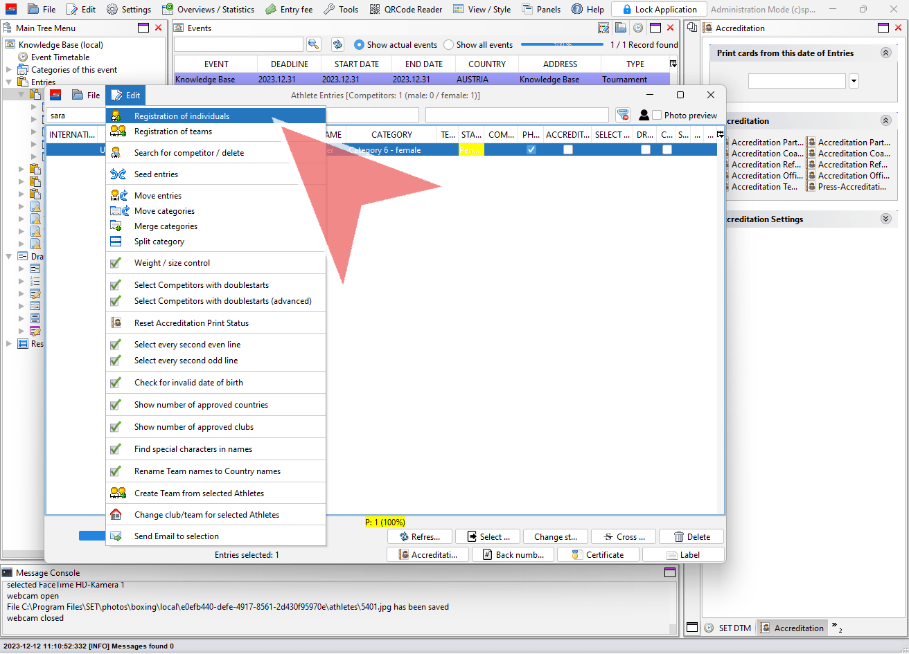 It is also possible to access the registration window directly through the entry list by going to “Edit” and then “Registration of individuals”.