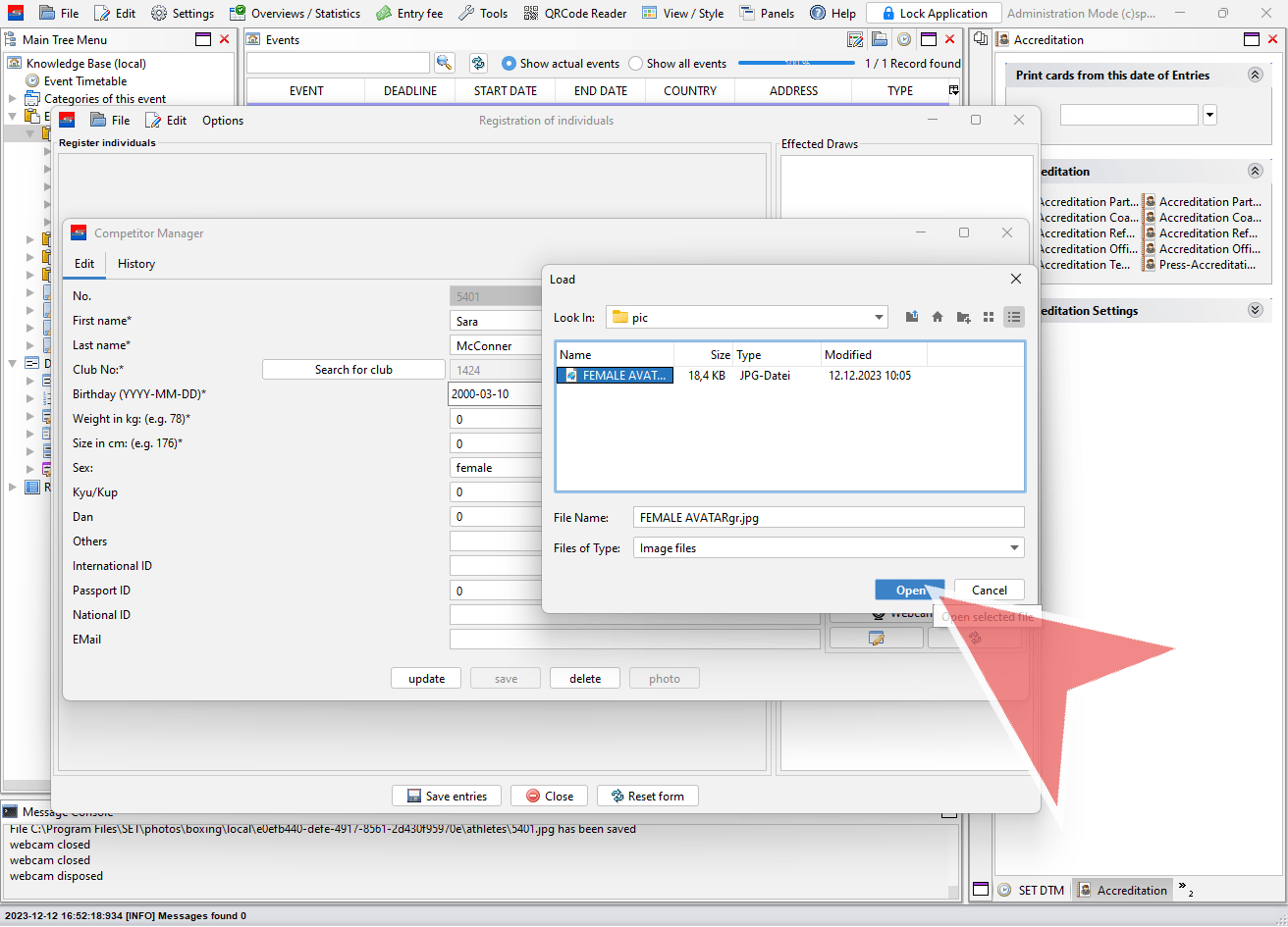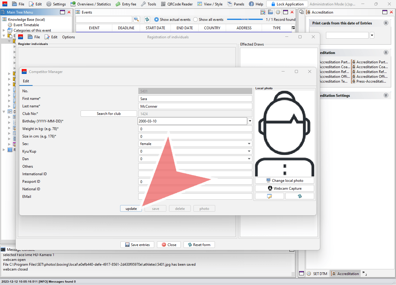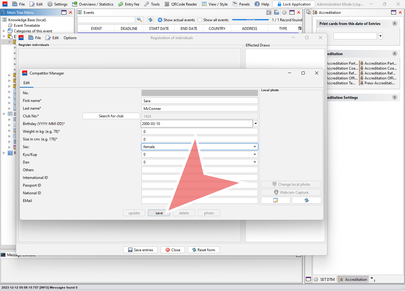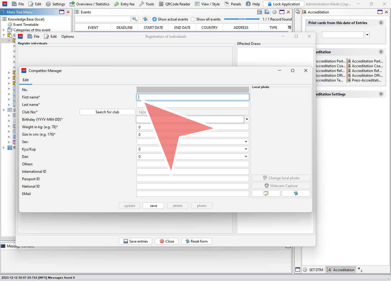 Enter all important information about the athlete in the competitor manager window. The first name, last name, birthday and gender are required, the other information are in general optional.