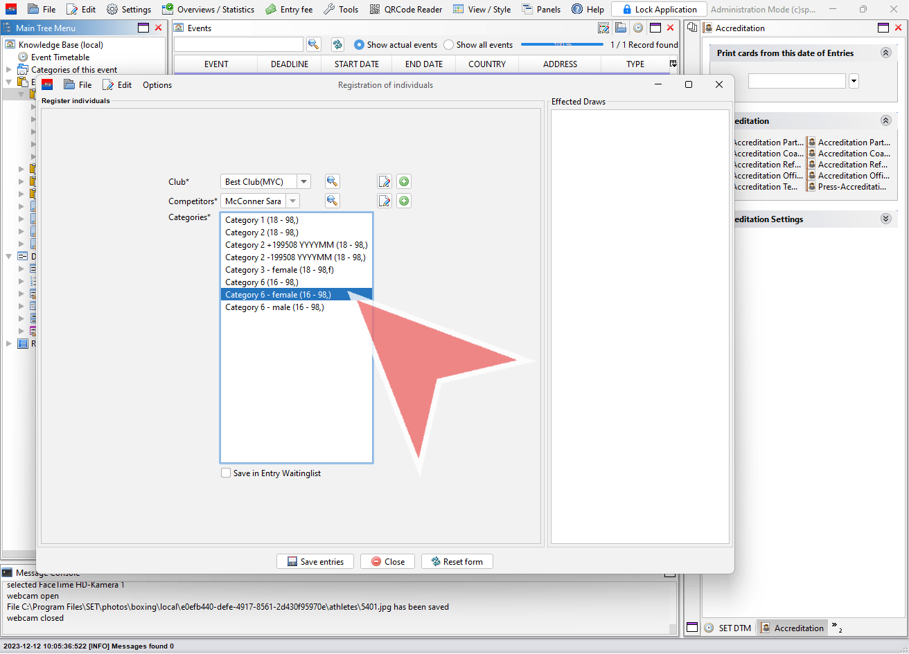 In the field below all matching categories of this event for the selected athlete are shown. Only if the information of the athlete meet the categories’ requirements (e.g. gender and age), the category is shown in the list.