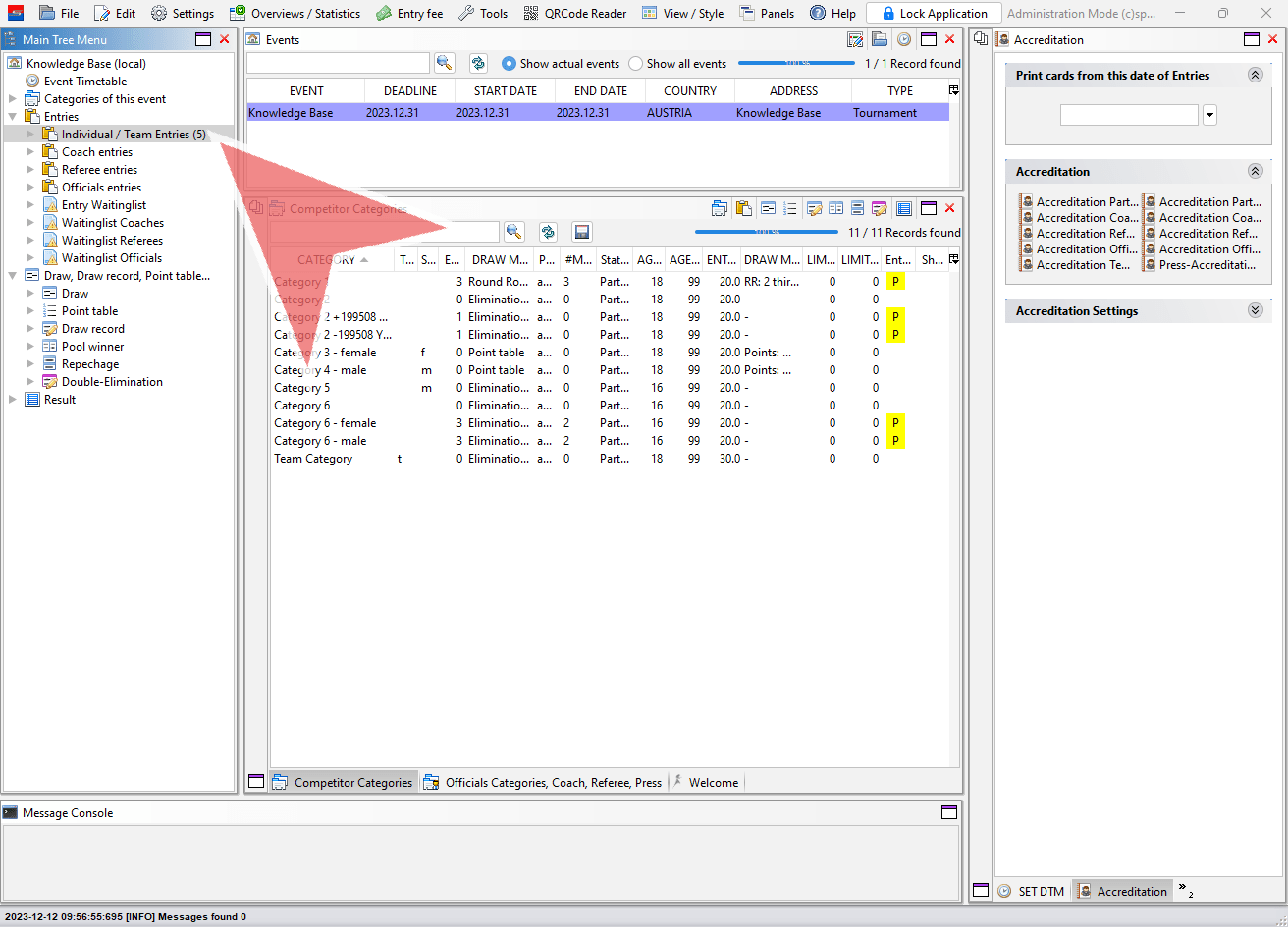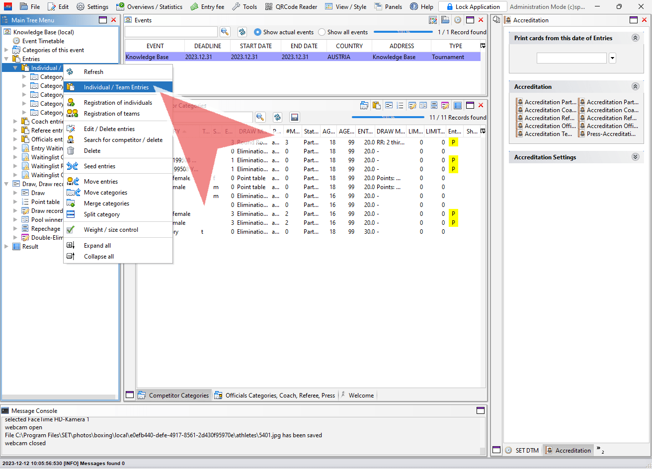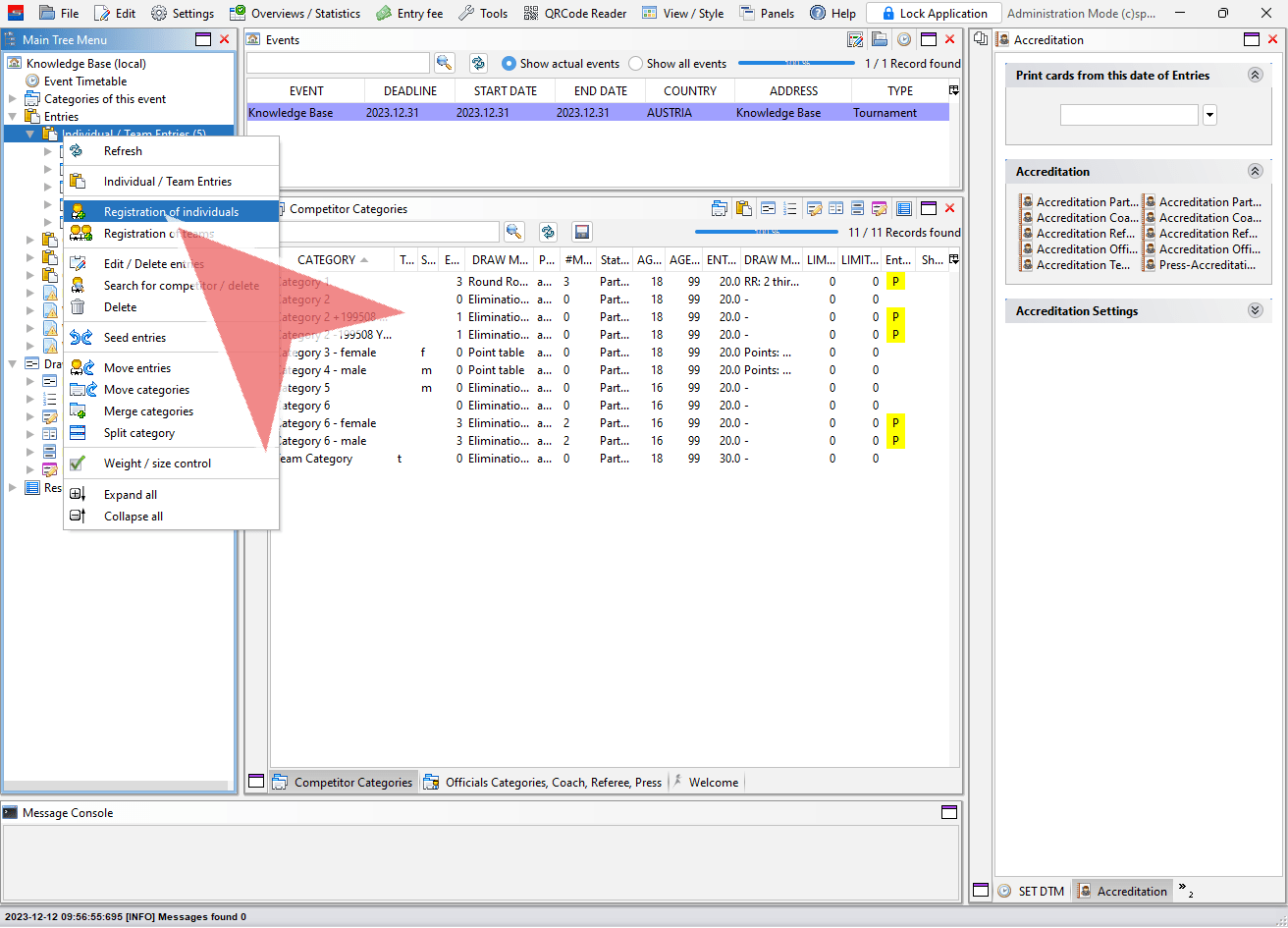 To find the list of all currently registered entries, rightlick on “Individual / Team Entries” in the Main Tree Menu and then select “Individual / Team Entries in the menu.
