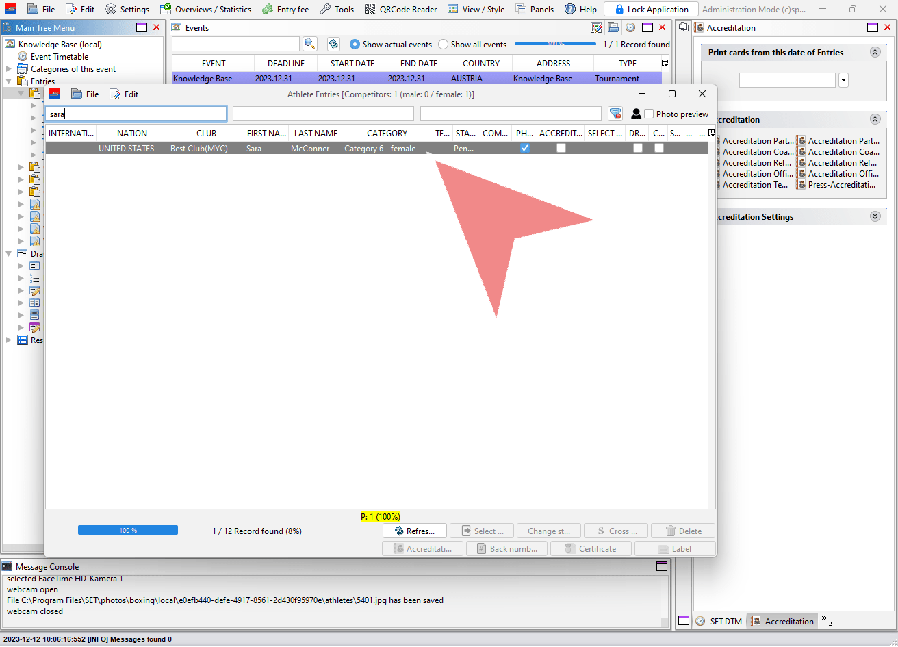 To register a new athlete rightclick on “Individual / Team Entries” in the Main Tree Menu.