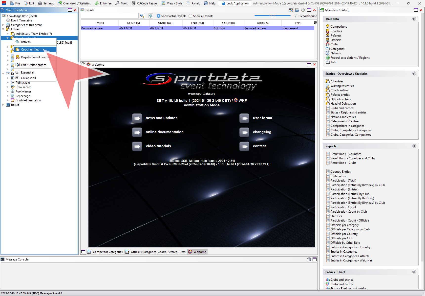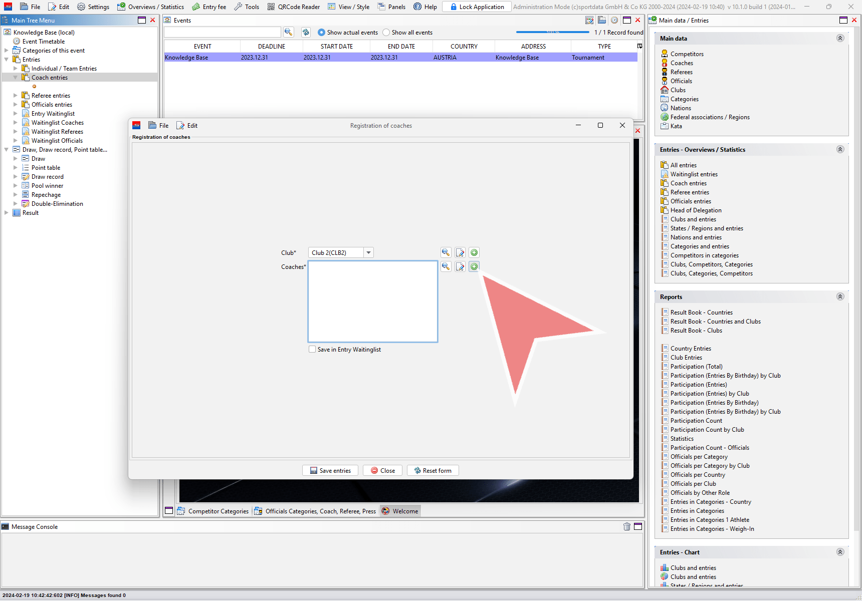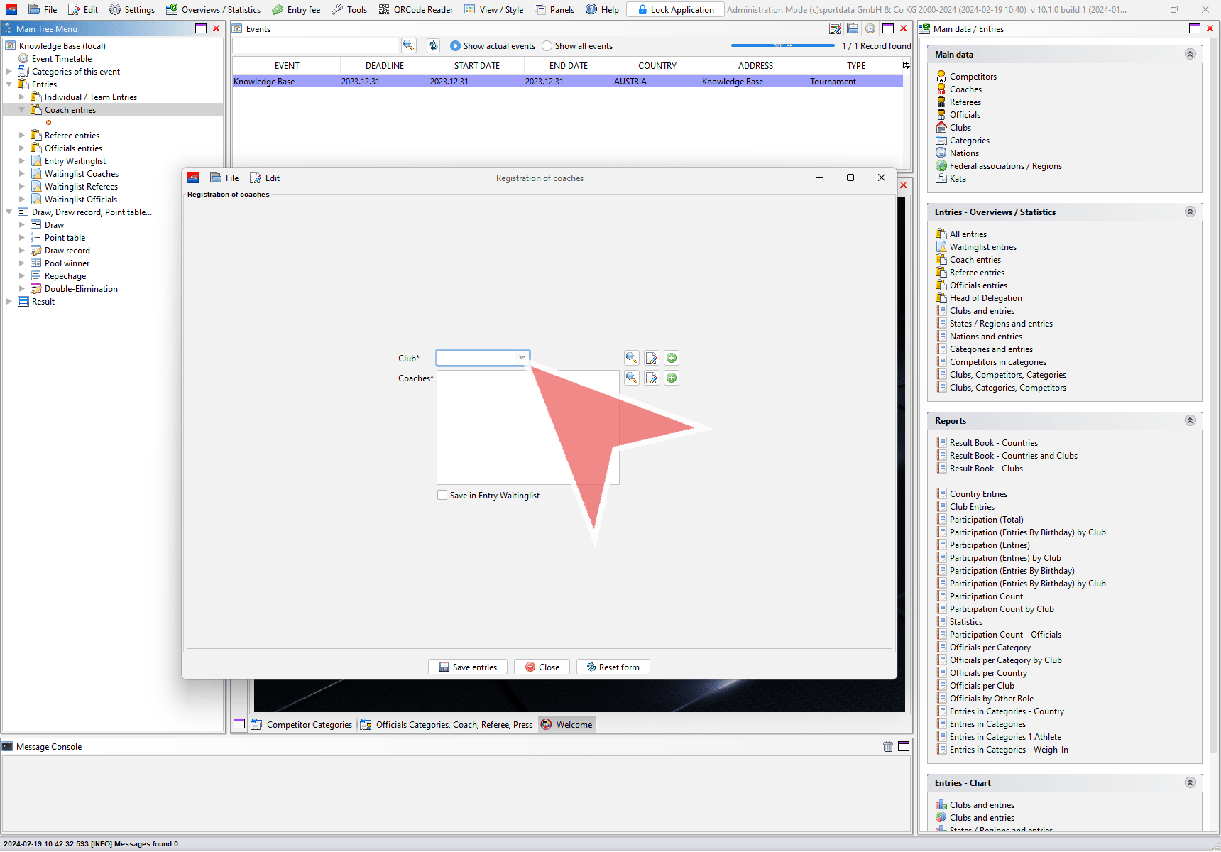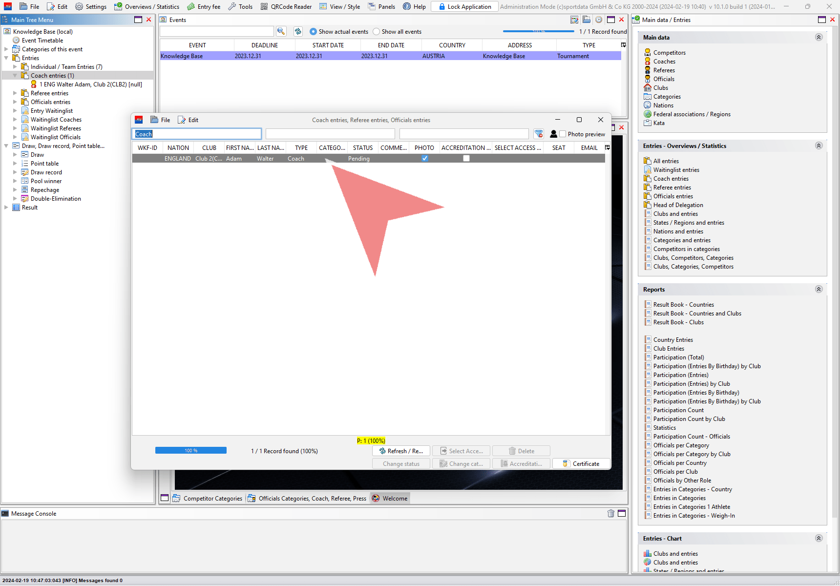 To access the list of all currently registered coaches, rightclick on “Coach entries” in the Main Tree Menu.